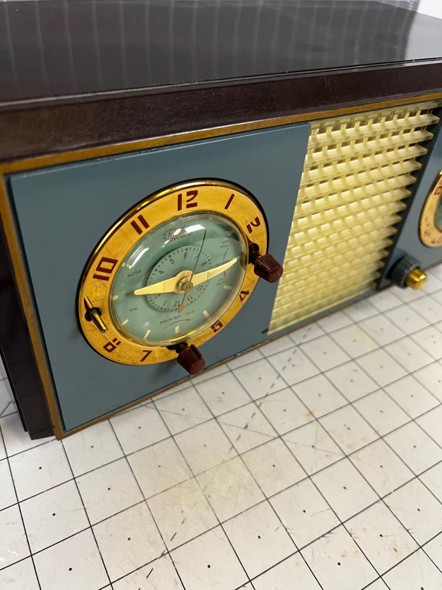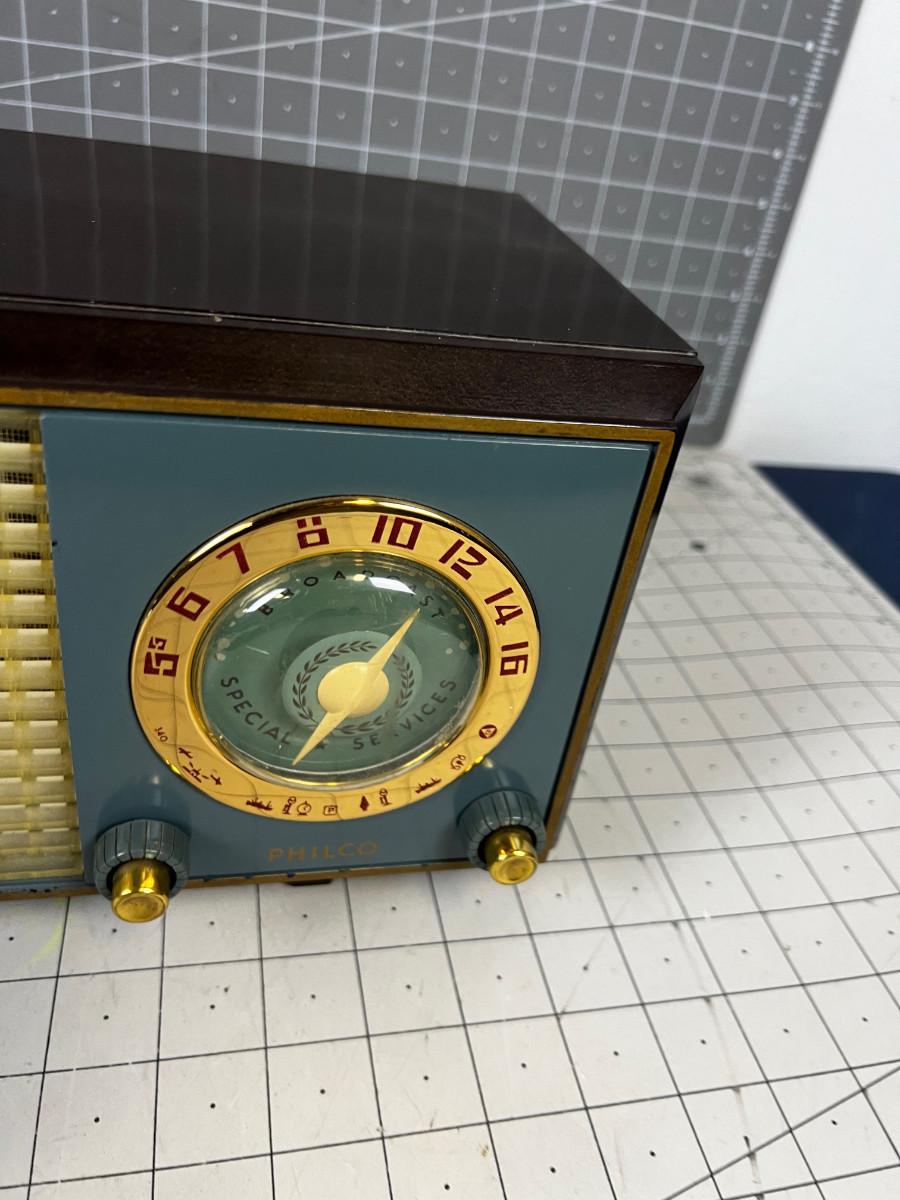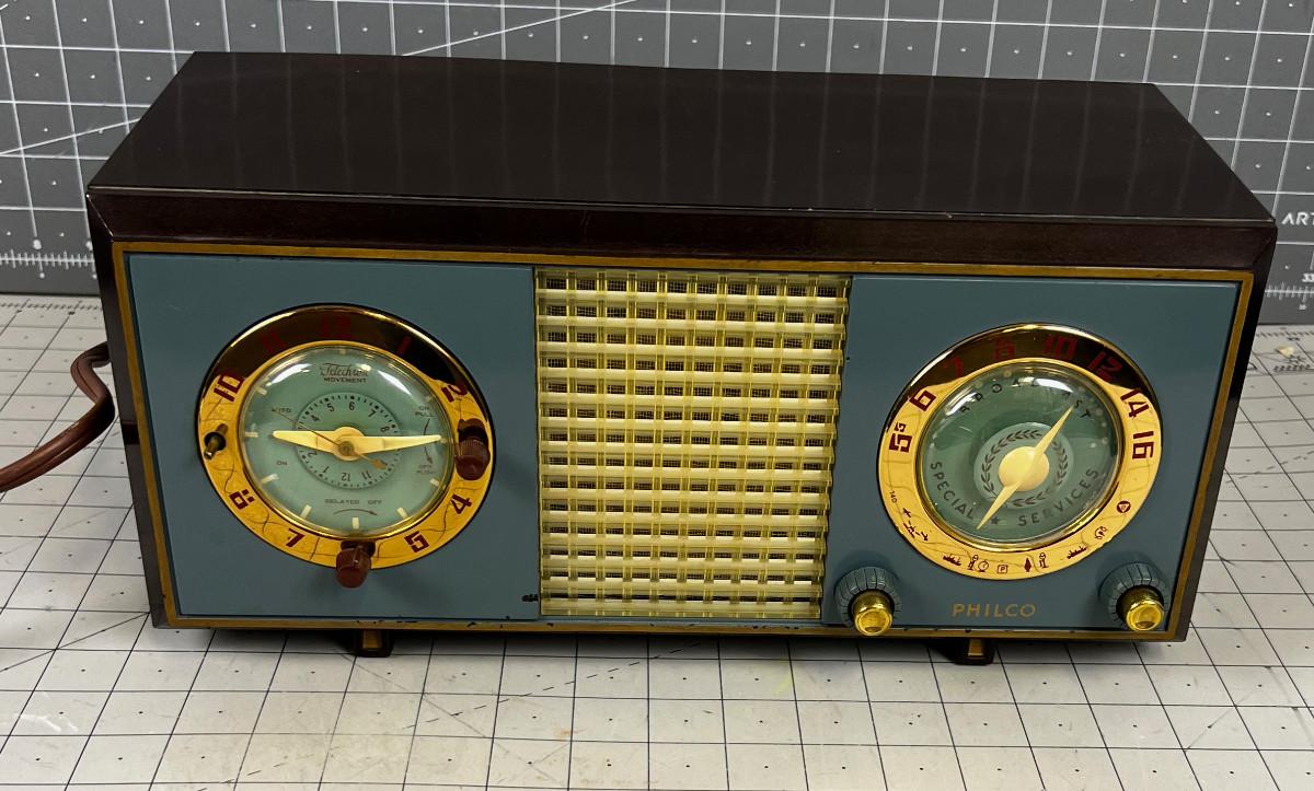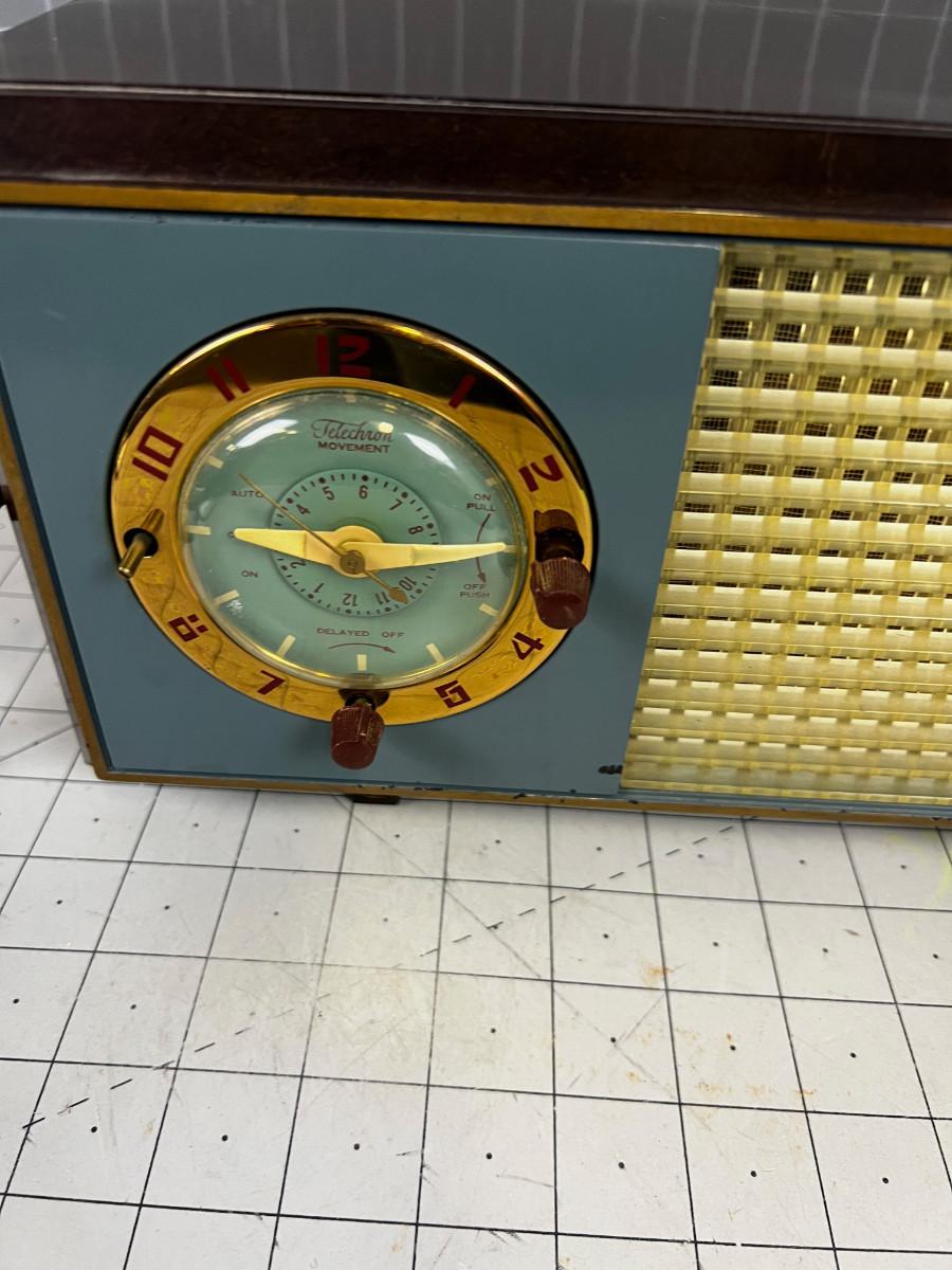 Missing a clock knob. 14 X 7 X 7" Works - we get sound and static! Clock Works, Hums a lot!