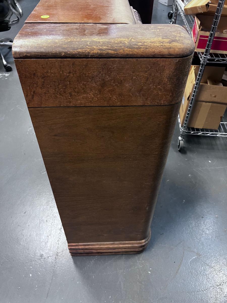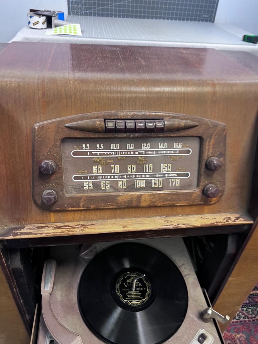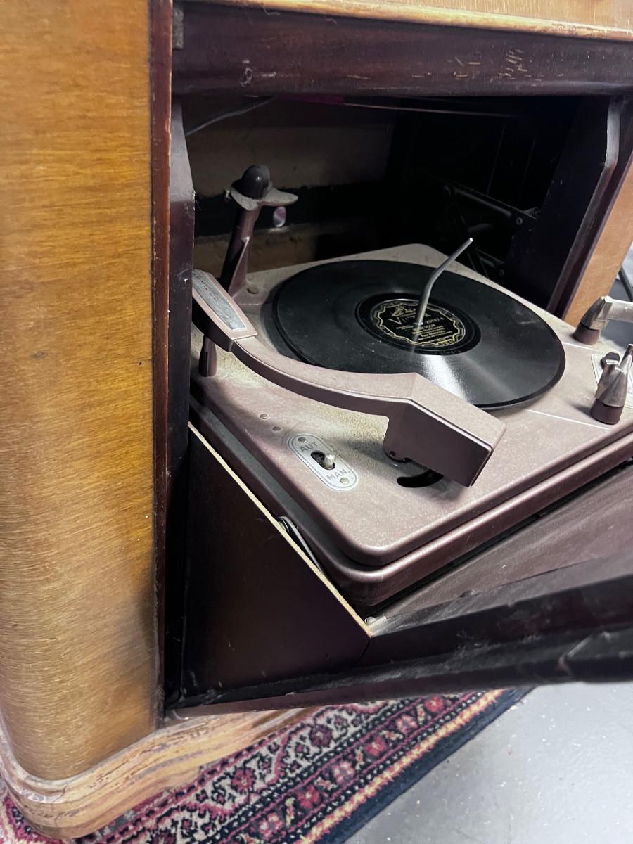 Radio Works. The Wood Is a bit Dry. We did not test the Record Player. COOL OLD Piece. Measures 28" X 17" X 38" Tall Walnut Veneer.