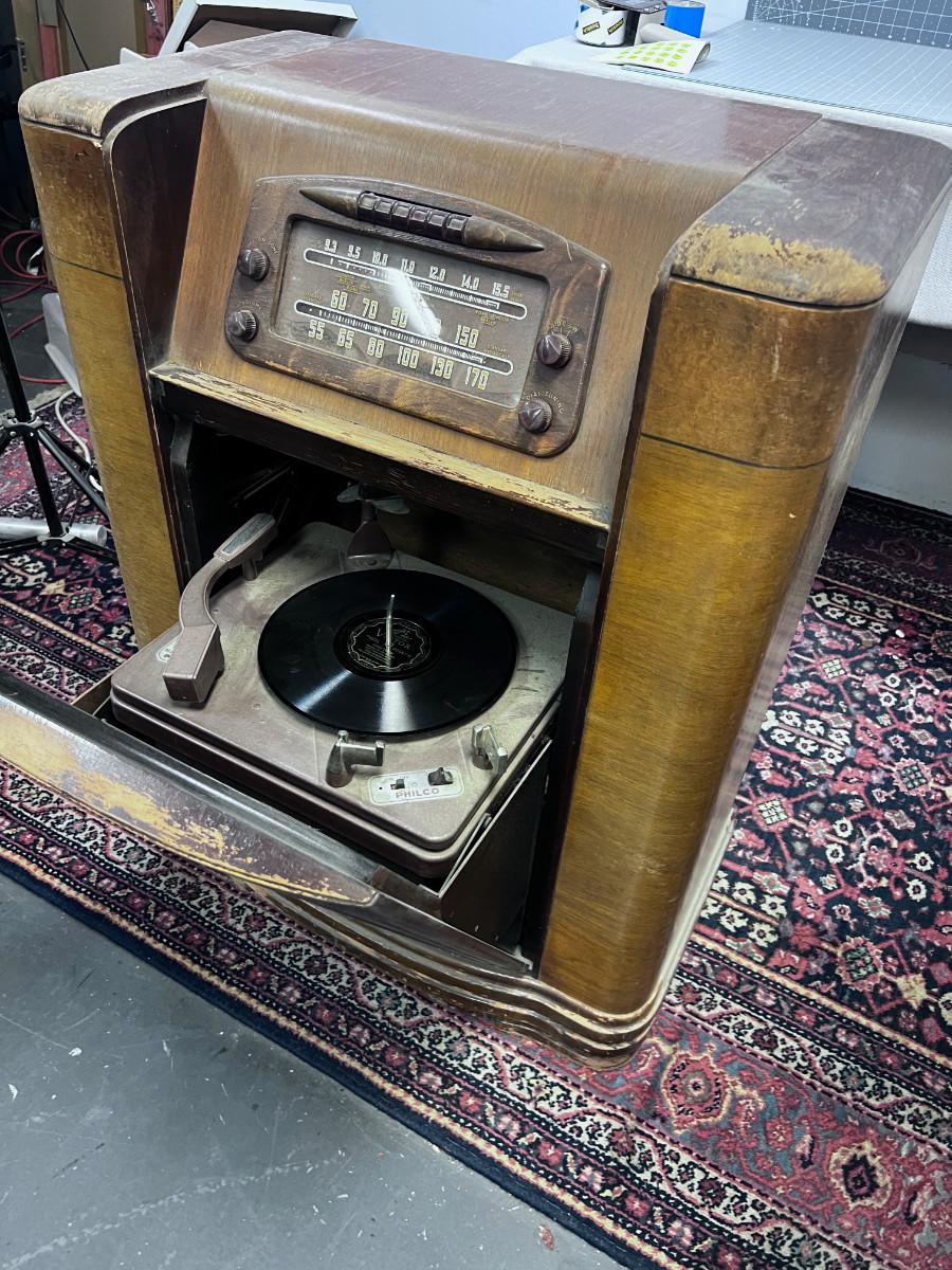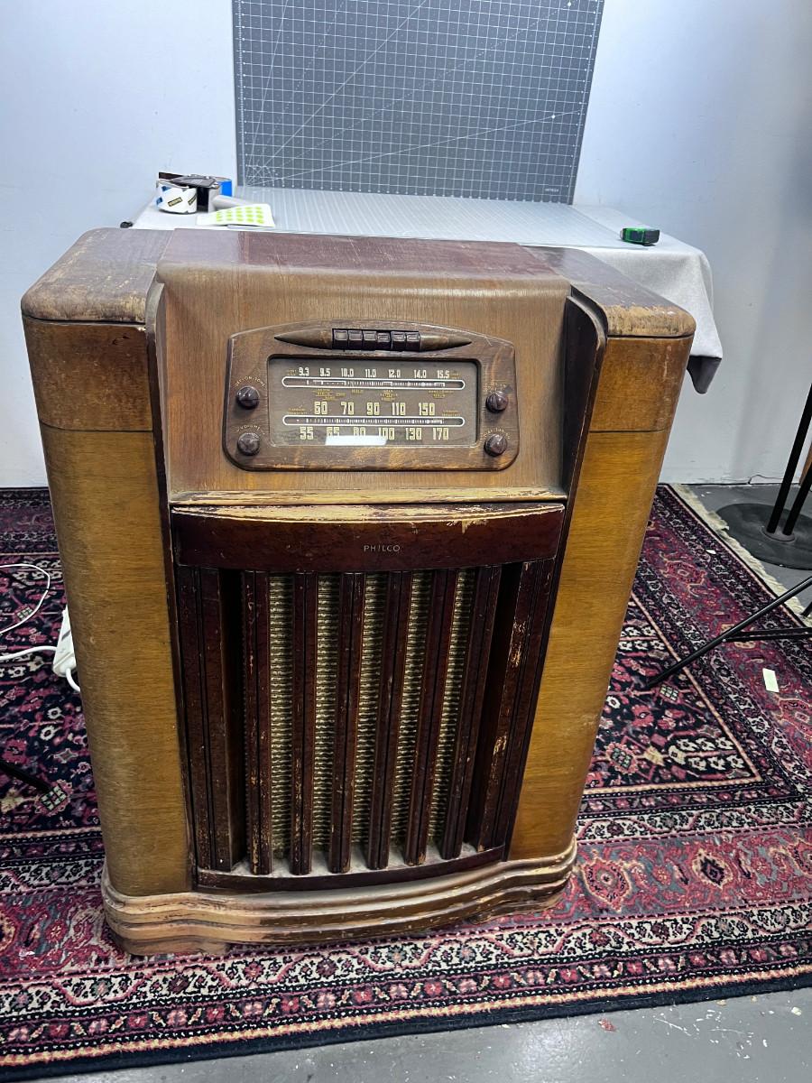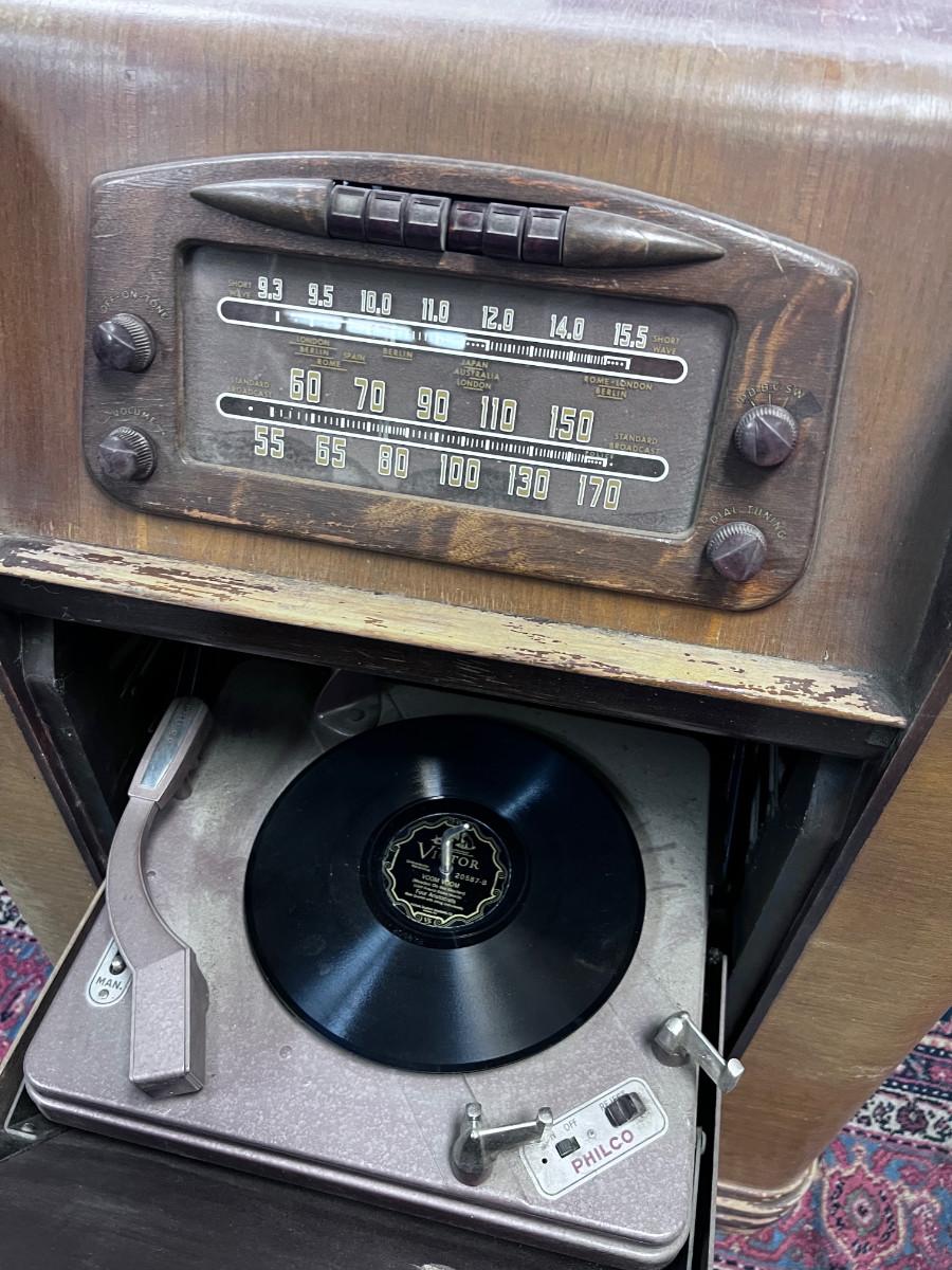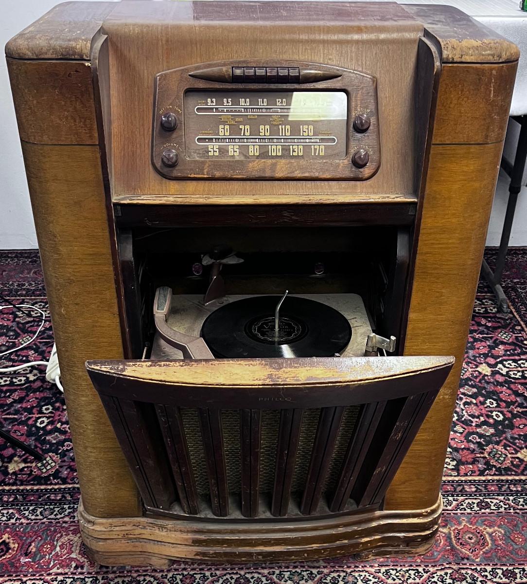 Radio Works. The Wood Is a bit Dry. We did not test the Record Player. COOL OLD Piece. Measures 28" X 17" X 38" Tall Walnut Veneer.