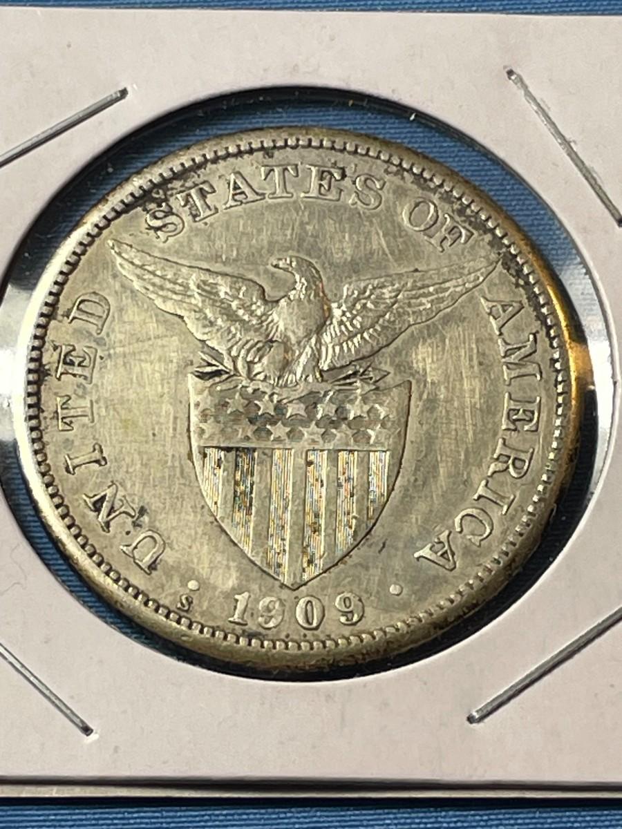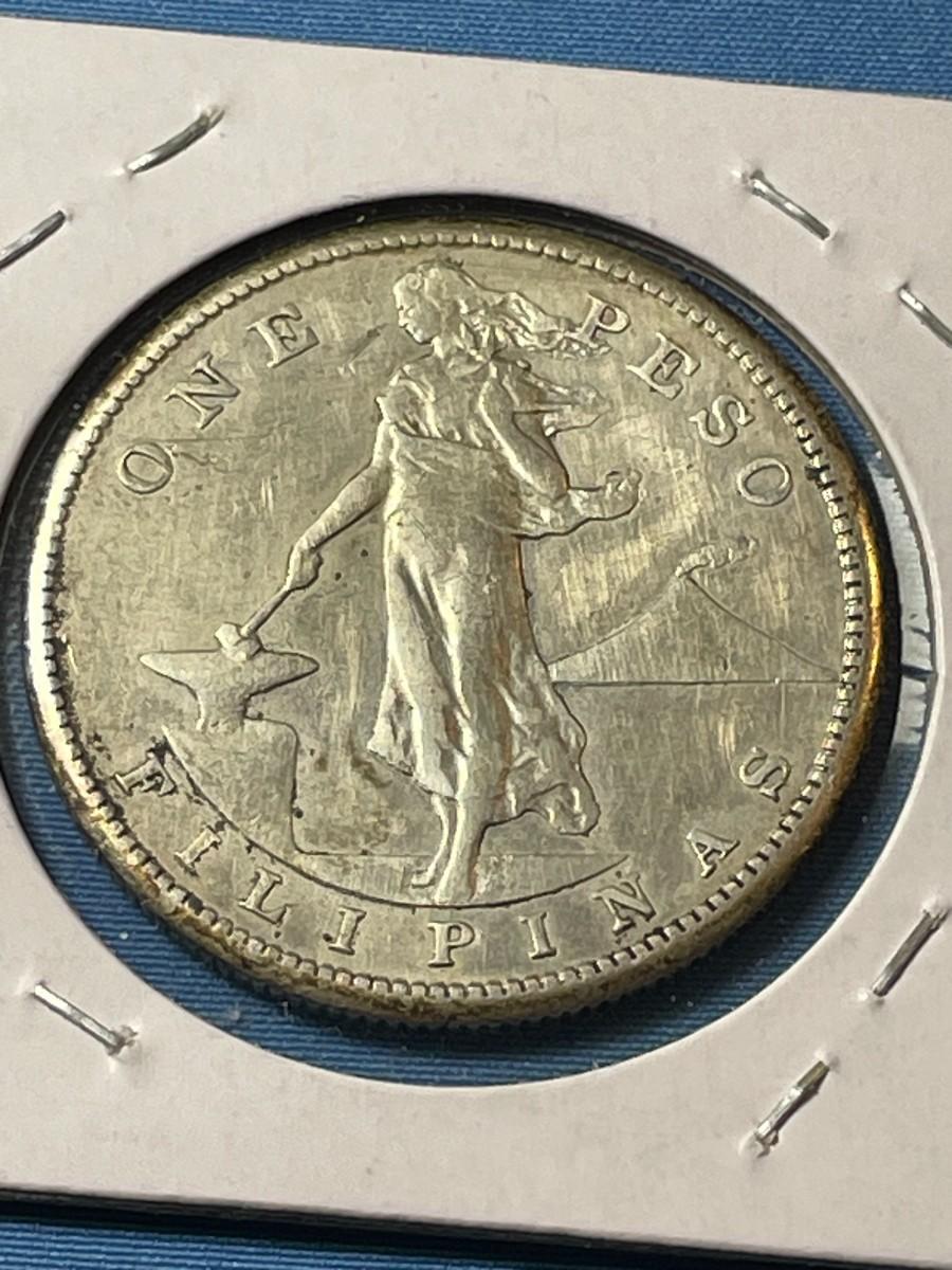 PHILIPPINES 1909-S VERY FINE CONDITION HEAVILY CLEANED PESO SILVER COIN AS PICTURED. $5 DOMESTIC SHIPPING.