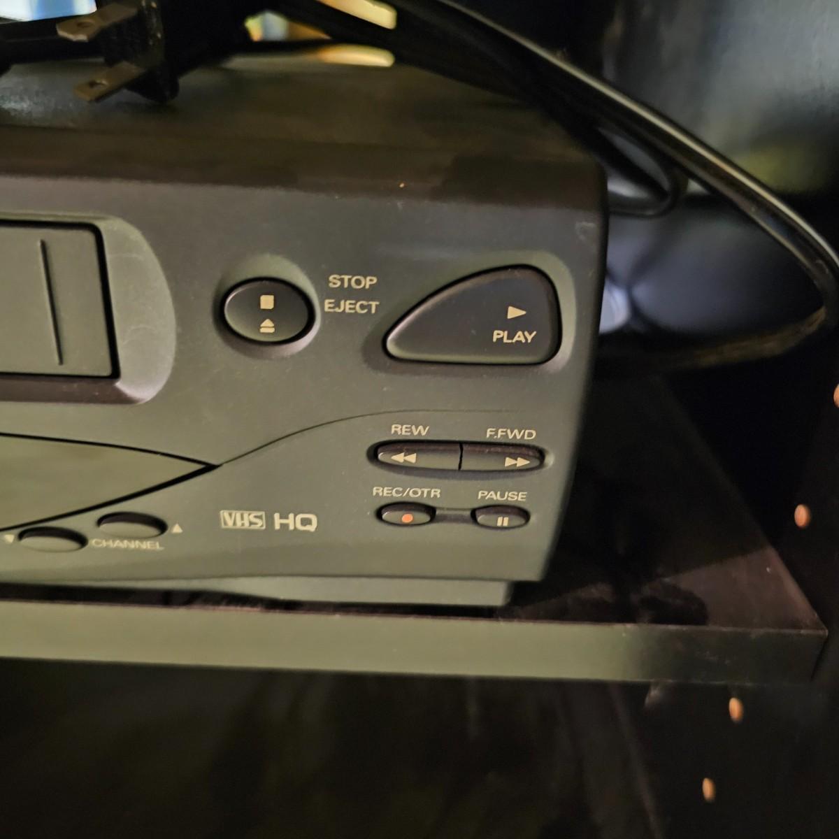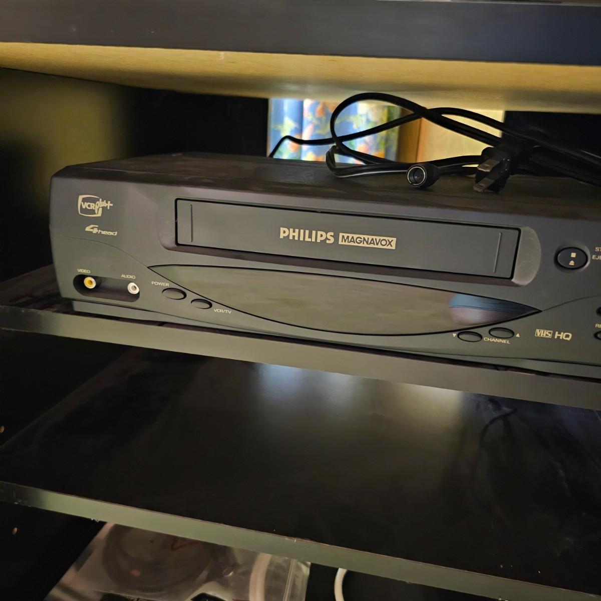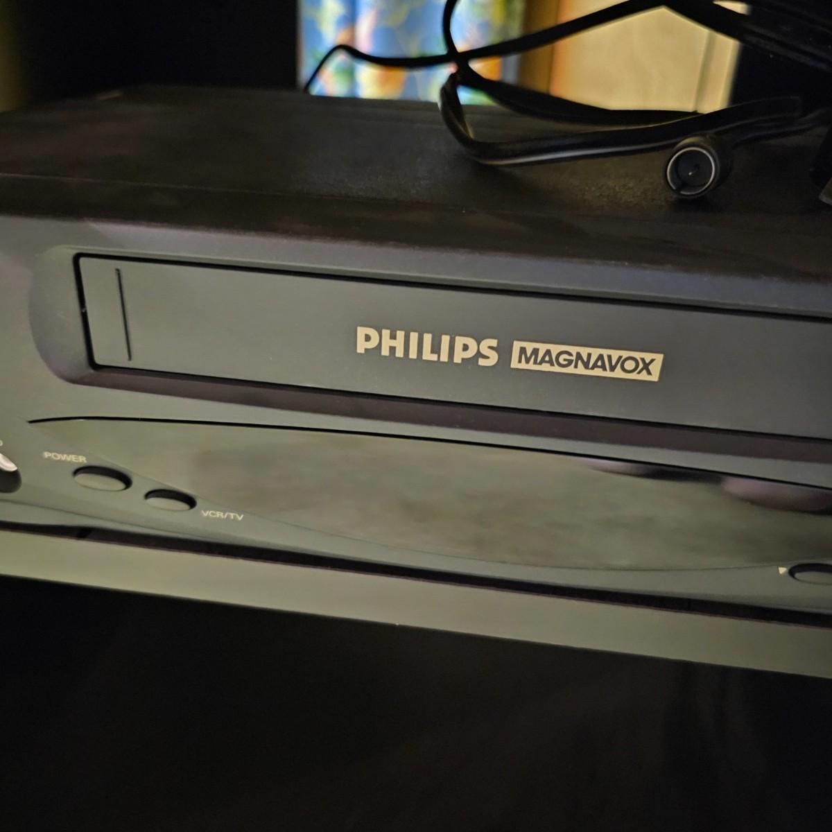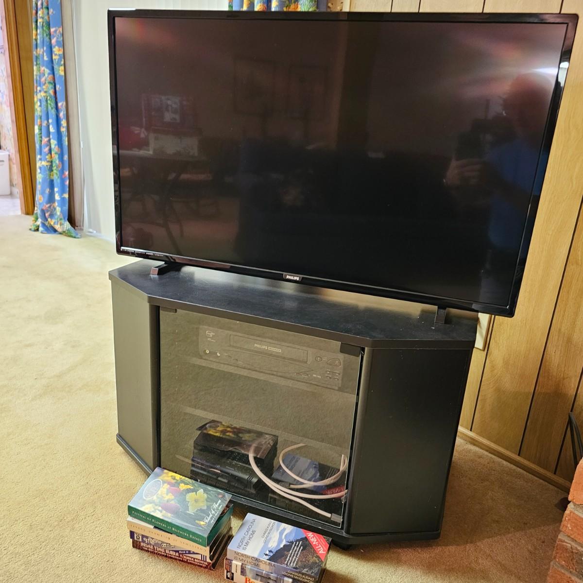 Philips 4K Ultra HDTV, 42" with remote and manual. Also includes Magnavox VHS player/recorder with remote and manual and cables. A few vintage VHS tapes as well. All enclosed/on a rolling tv stand with front glass door and storage compartments on either end. Tv measures 38" x 6" x 23"H, stand is 34"x 19" x 20"H. All items powered on when plugged in. See photos for details. Local pickup only.
