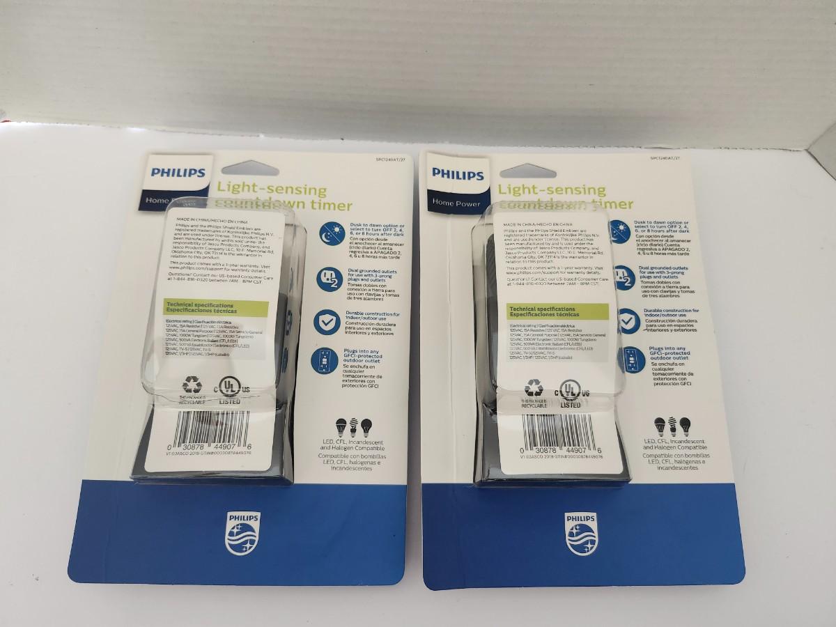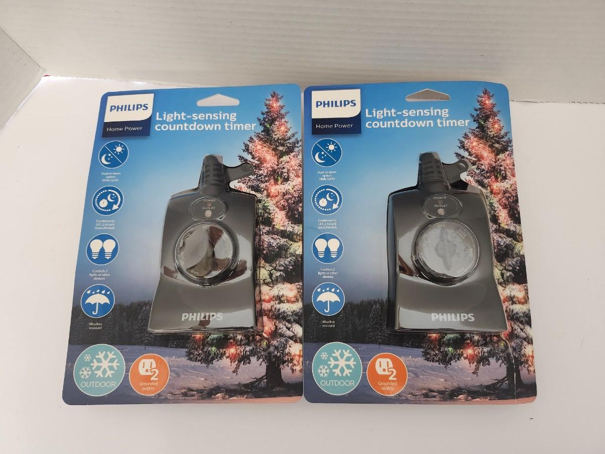 Lot of two Philips Home Power light sensing countdown timers in original retail packaging. Each timer features dusk to dawn sensing with selectable countdown options, weather resistant construction, and two grounded outlets. Designed for outdoor use and compatible with LED, CFL, incandescent, and halogen lighting. UL listed and GFCI outlet compatible as stated on packaging. Sold as a pair exactly as shown.