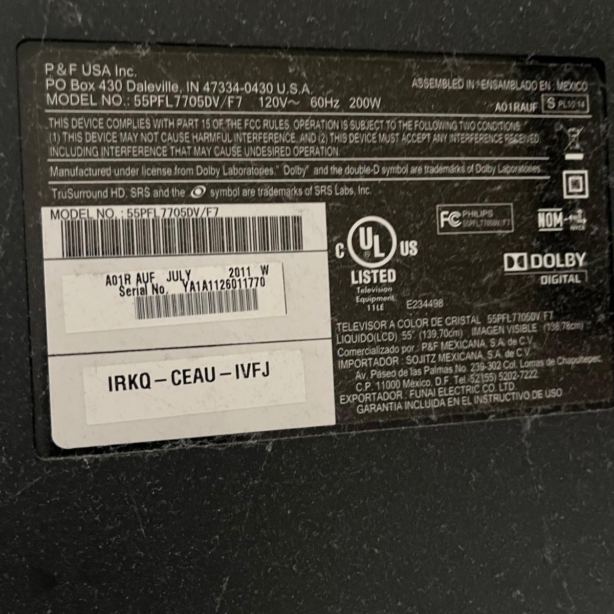 Lot includes Phillips 55” LCD TV model # 55PFL 7705DV/F7. TV powered on when tested and has stand that is not attached. The mount is not included. Also includes remote.