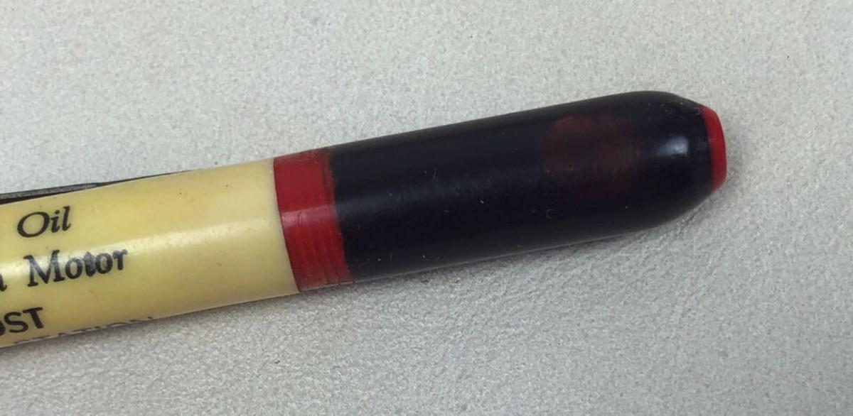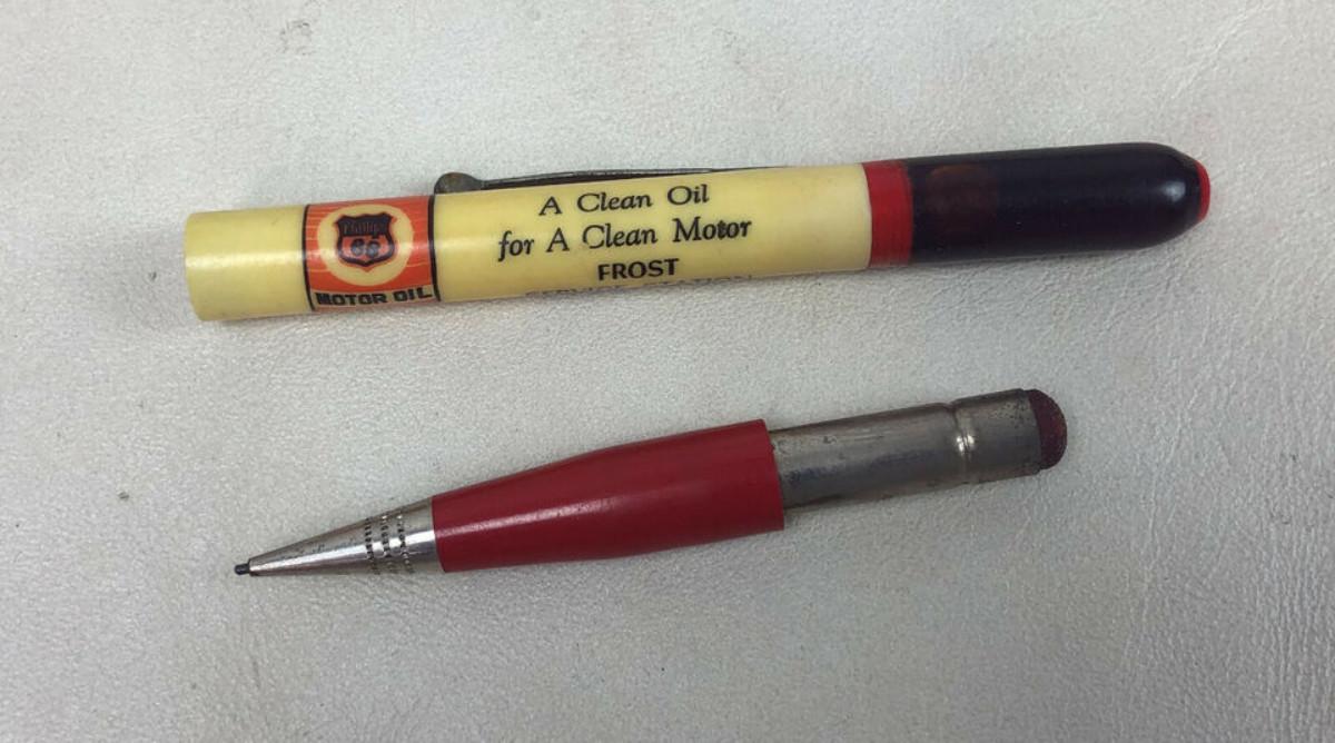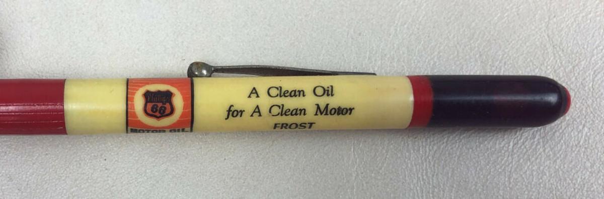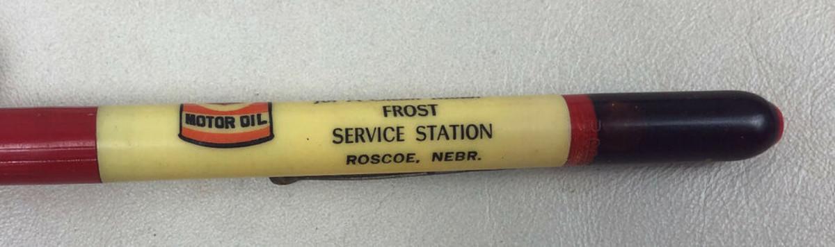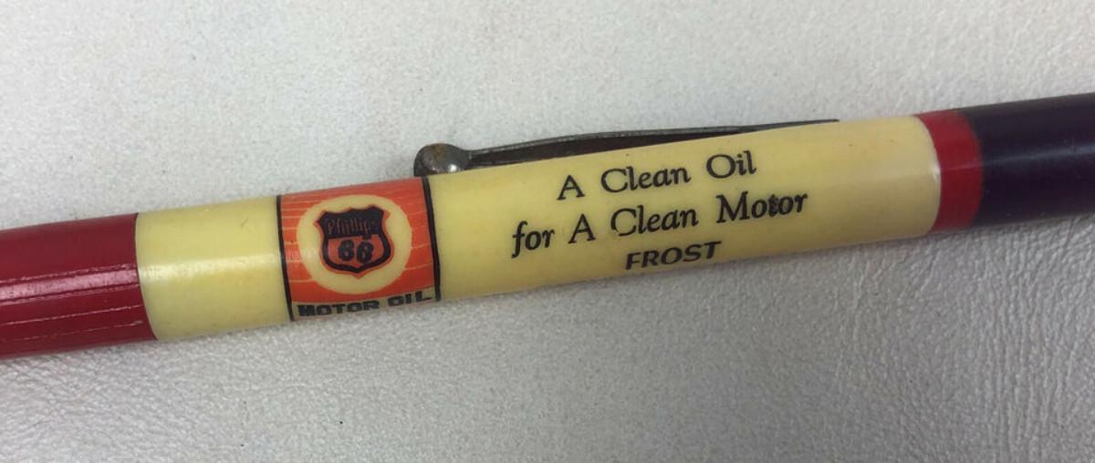 With a 1940 design patent here is an advertising mechanical pencil for Phillips Motor Oil and the Frost Service Station once of Roscoe, Nebraska....Working condition..the gimmick is the plastic reservoir filled with motor oil...Good condition on the imprint...Light use overall...5 5/8in.