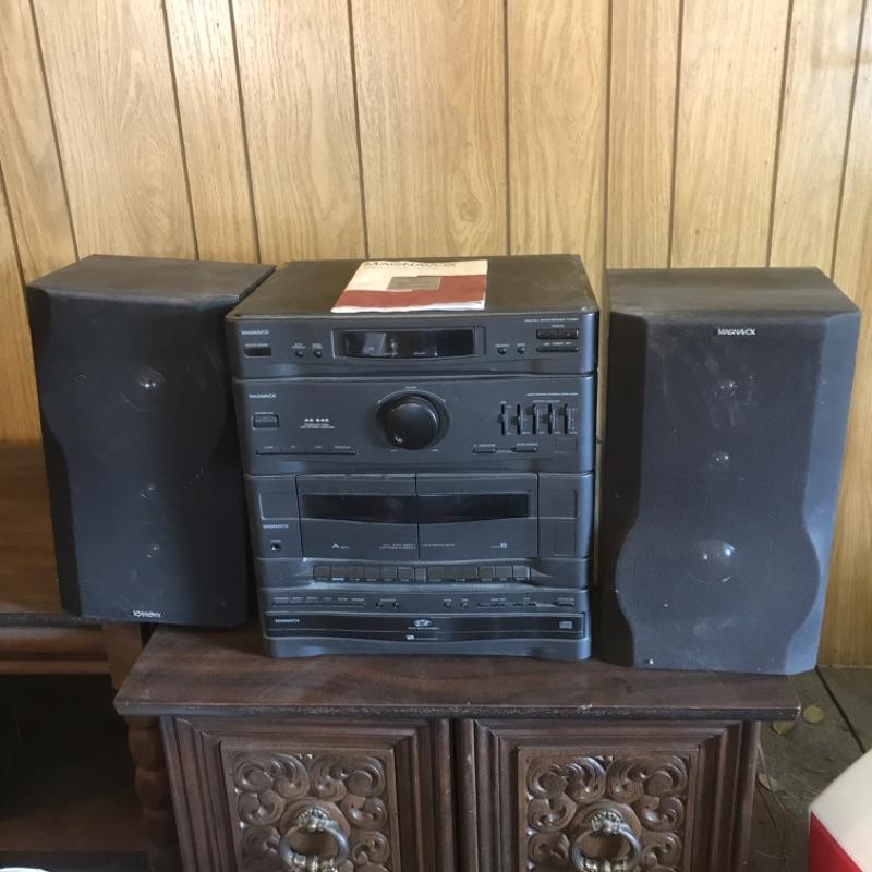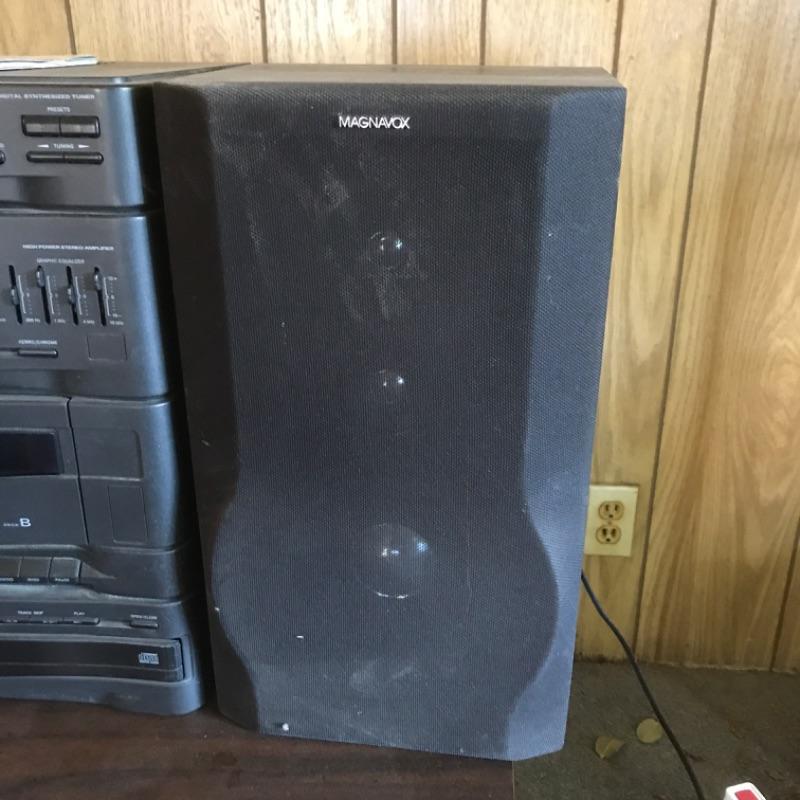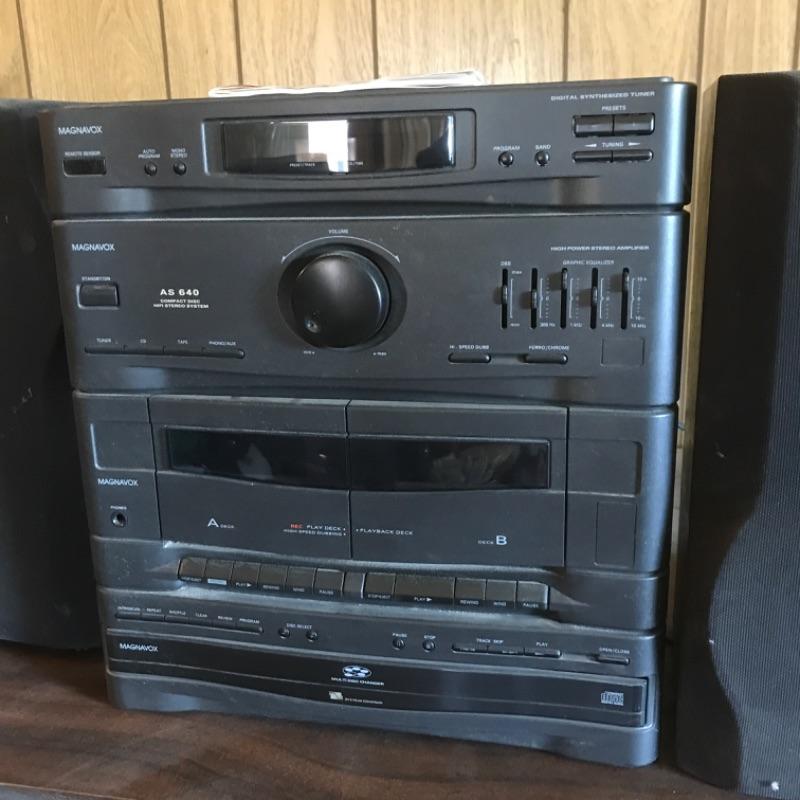 Auction is for a Phillips AS640/37 CD midi stereo system. It includes the main unit, two speakers, cables, and the original instruction manual.