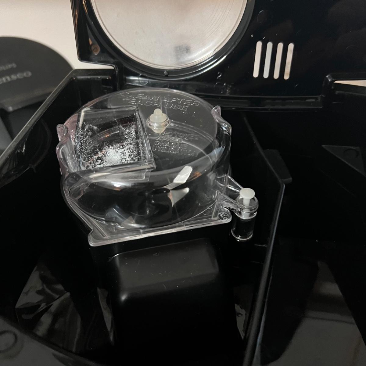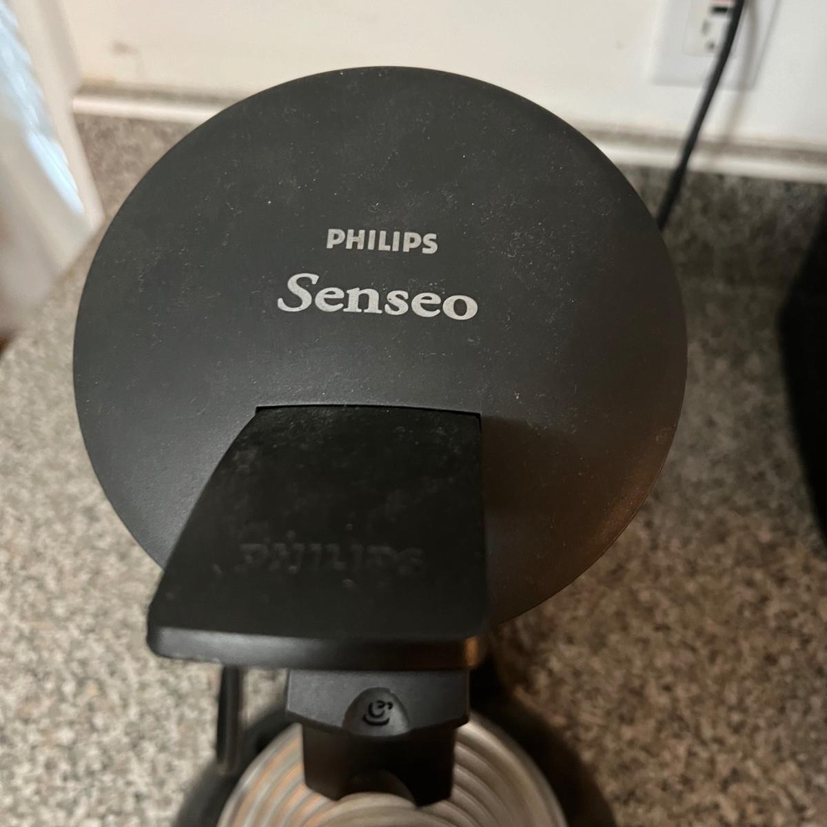 Two coffee makers, both powered on when plugged in. One is a Phillips Senseo pod machine, the other a Cuisinart.