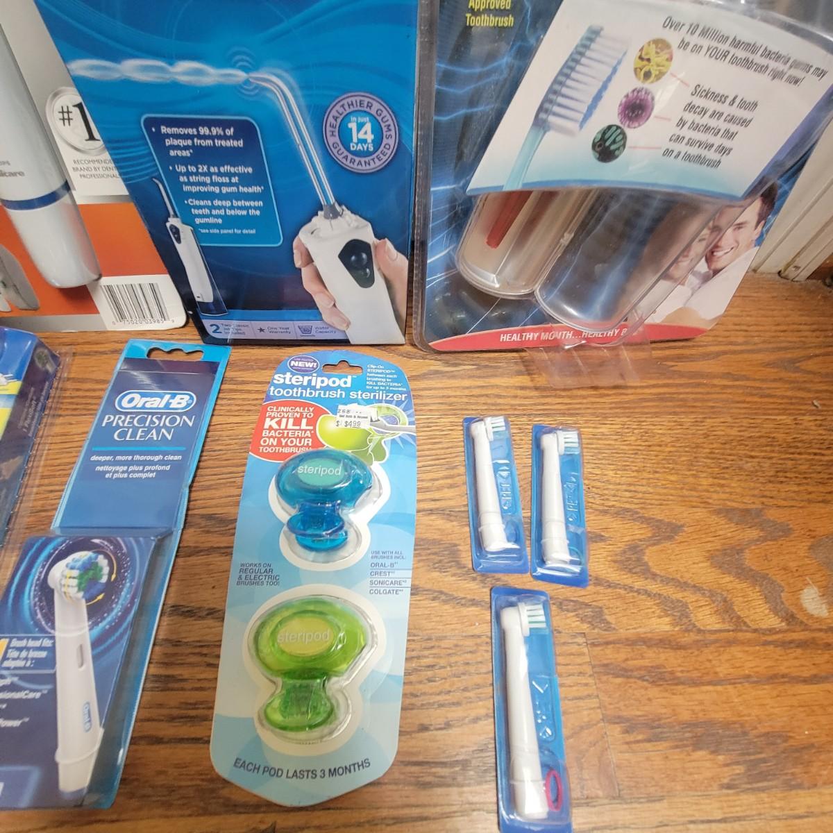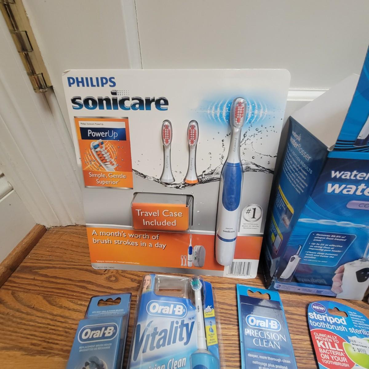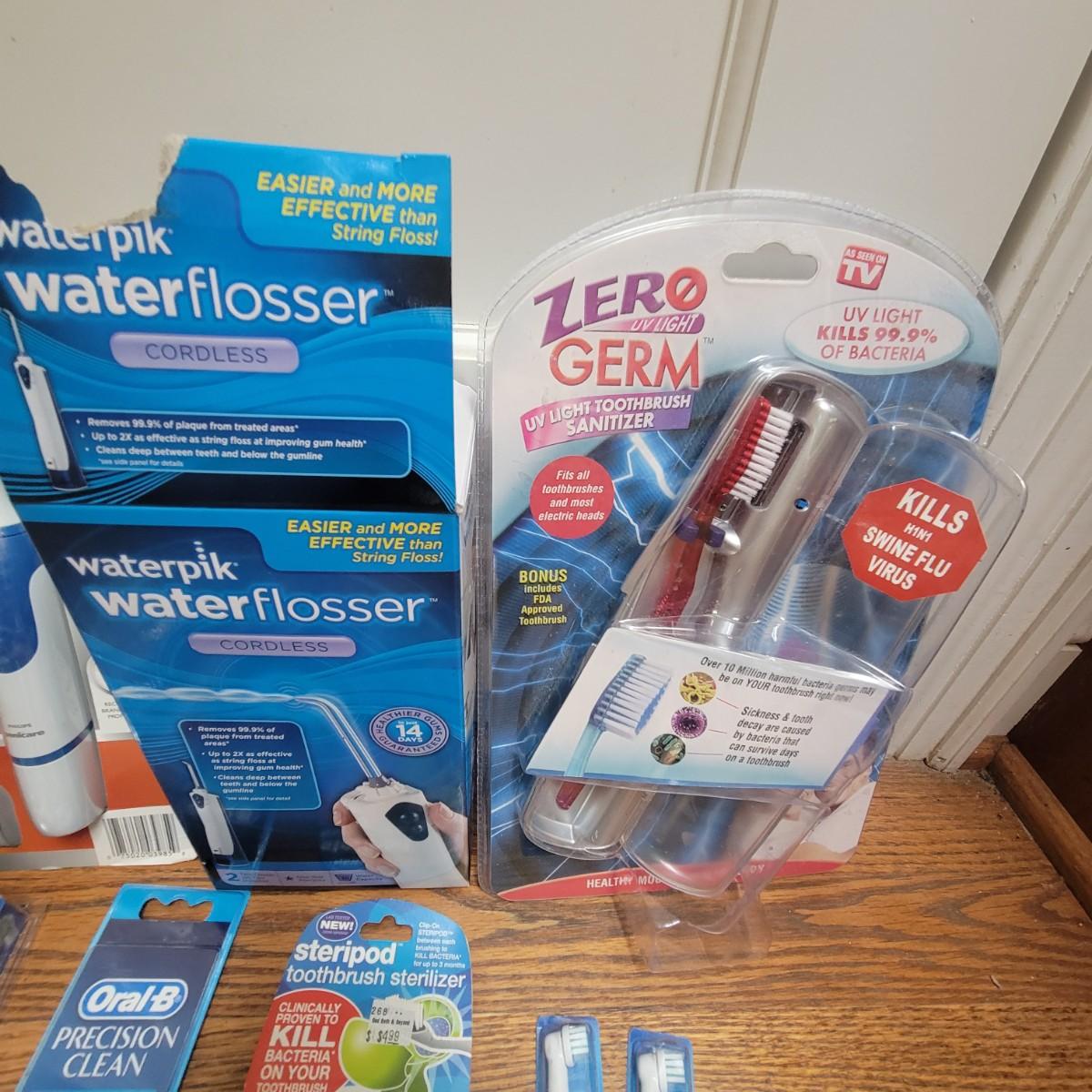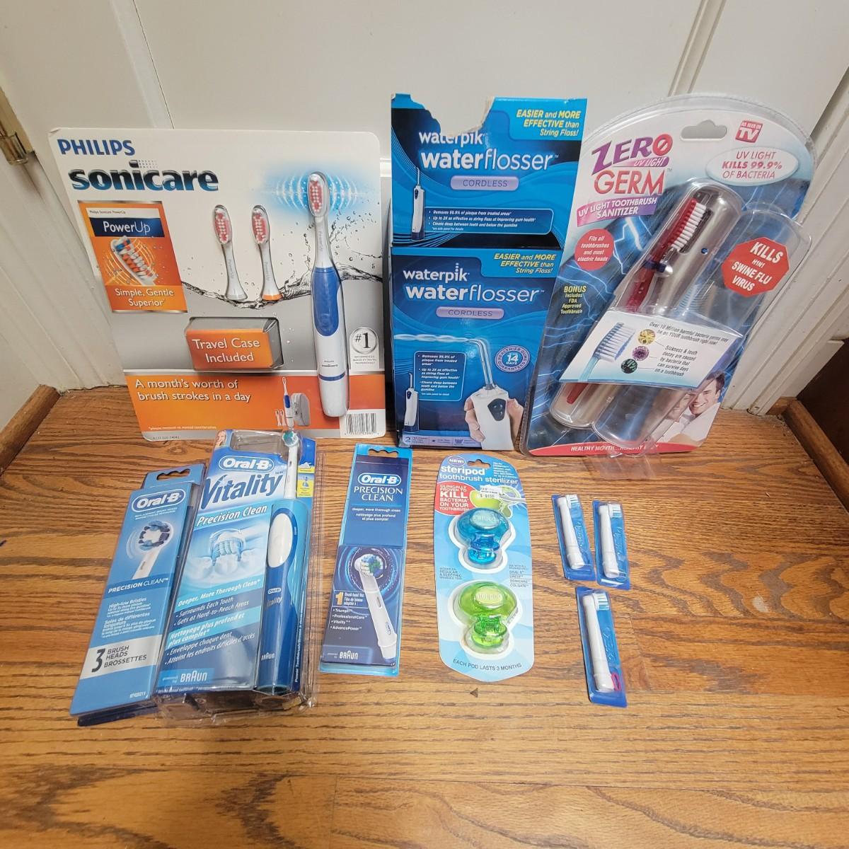 Philips Sonicare toothbrush, waterpik water flosser, UV light toothbrush sanitizer, OralB electric toothbrush and accessories. All appear to be new and unused. Local pickup only