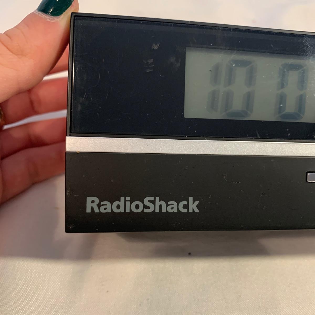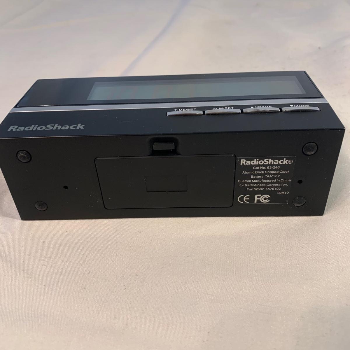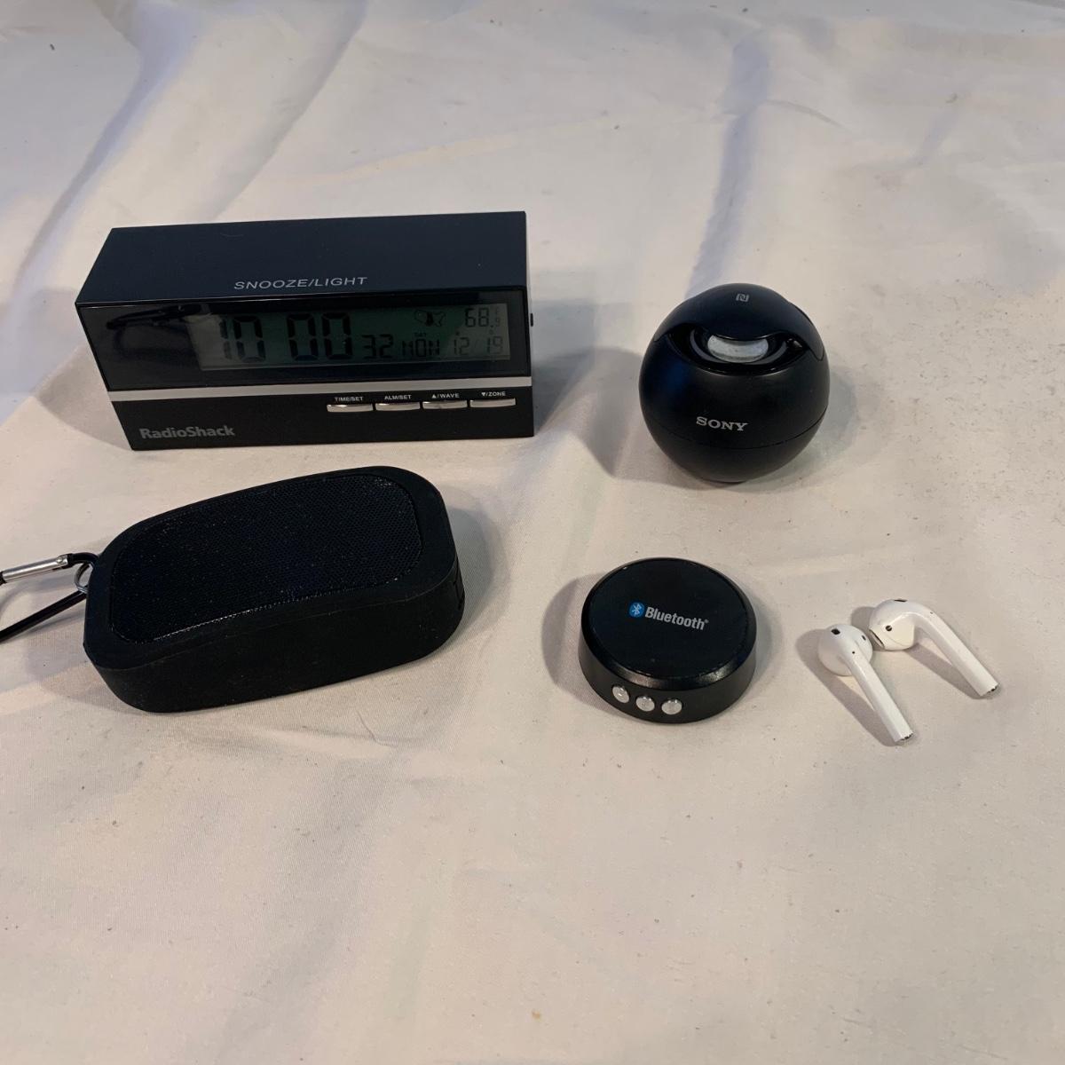 This lot includes one RadioShack Atomic Brick Shaped Clock, one Sony wireless speaker, a pair of AirPods without the charger, a Bluetooth black web converter box, and an unlabelled speaker. The RadioShack alarm clock has some small scuffs from use but appears to be working fine (see photos). The AirPods have no charging case but can confirm they charge when put into a case. Speakers could not be tested. The largest item (the RadioShack clock) measures about 6in x 2in x 3in. Shipping available.
