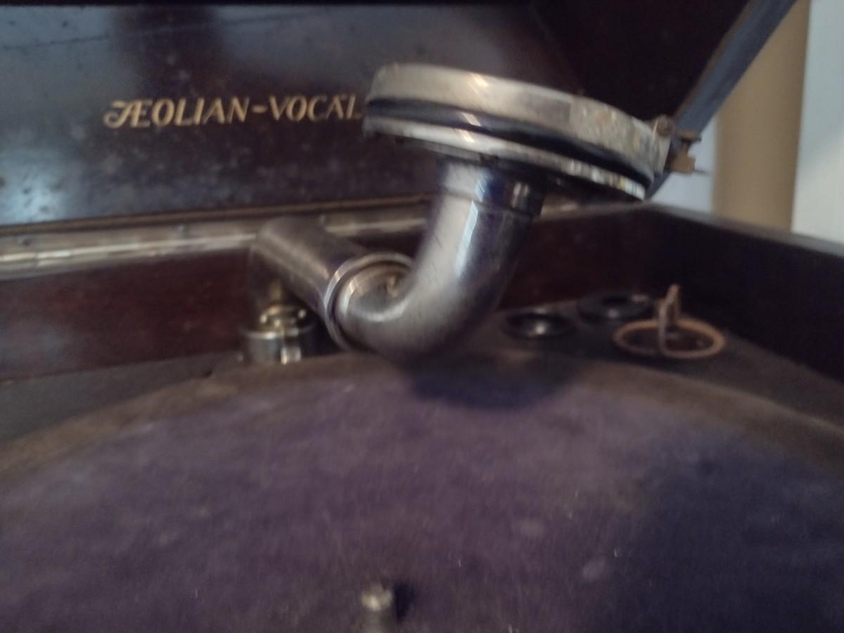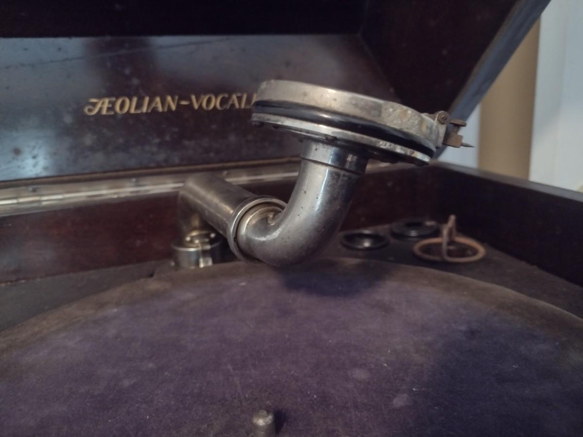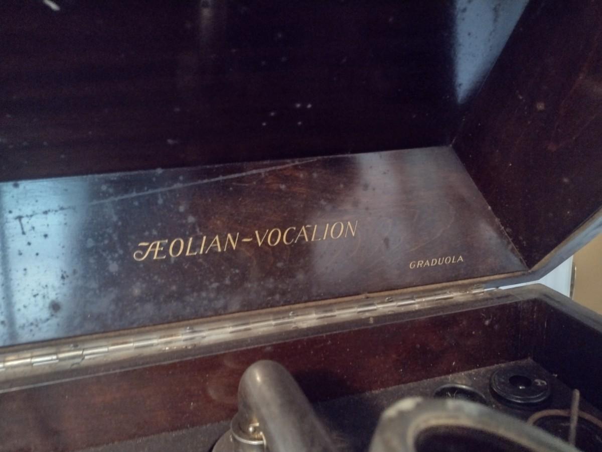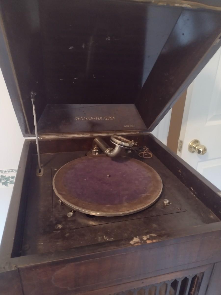 Antique Aeolian-Vocalion Graduola Phonograph cranks up fine. Record platter spins. Could not test sound. Main level item