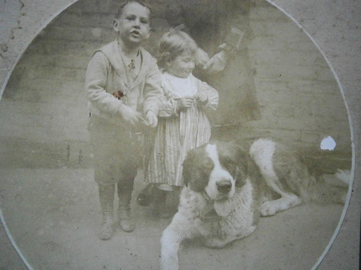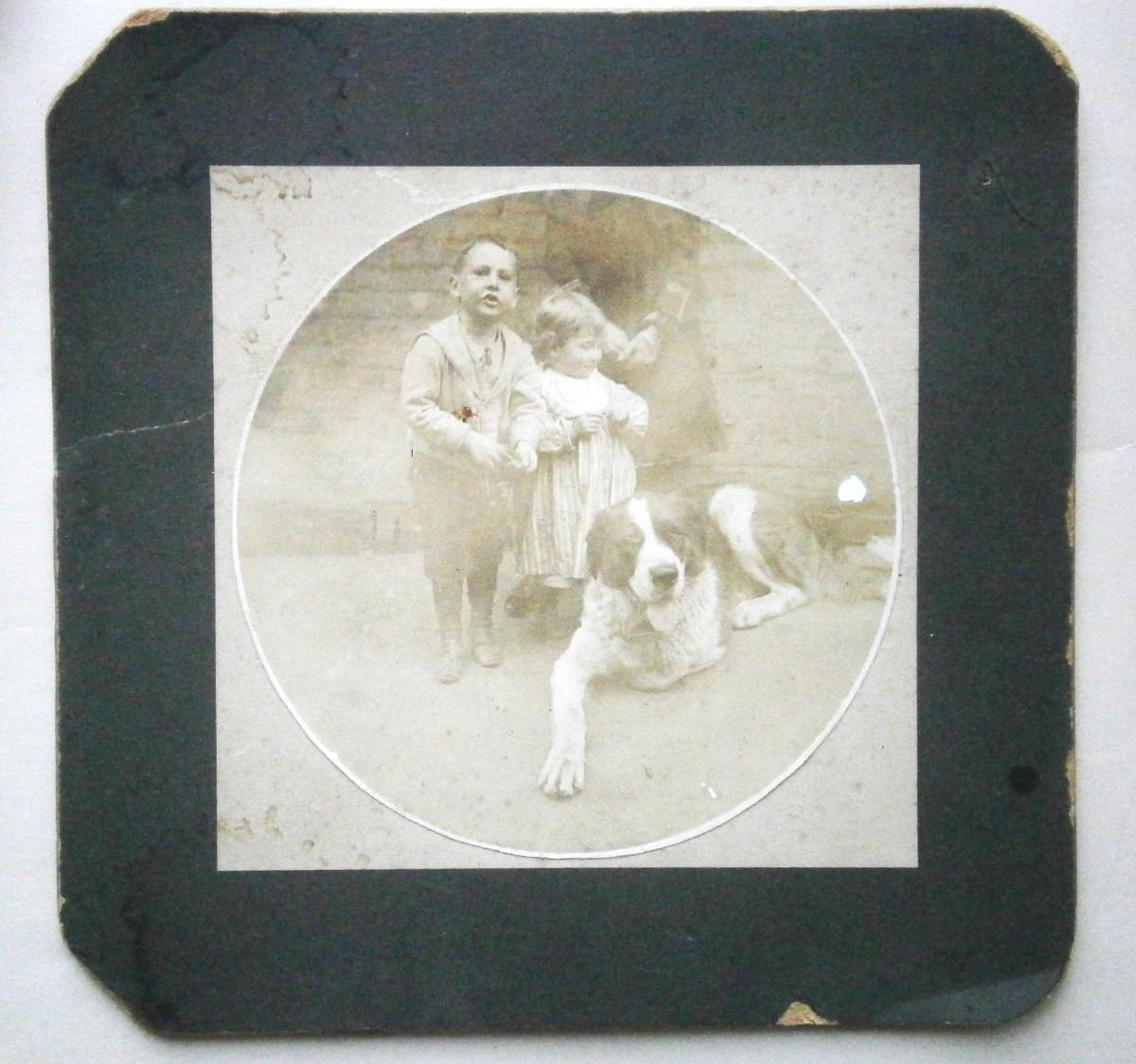 Turn of the Century Photograph of Children with St Bernard Dog, 5 1/2 x 5 1/2 in., has tear.