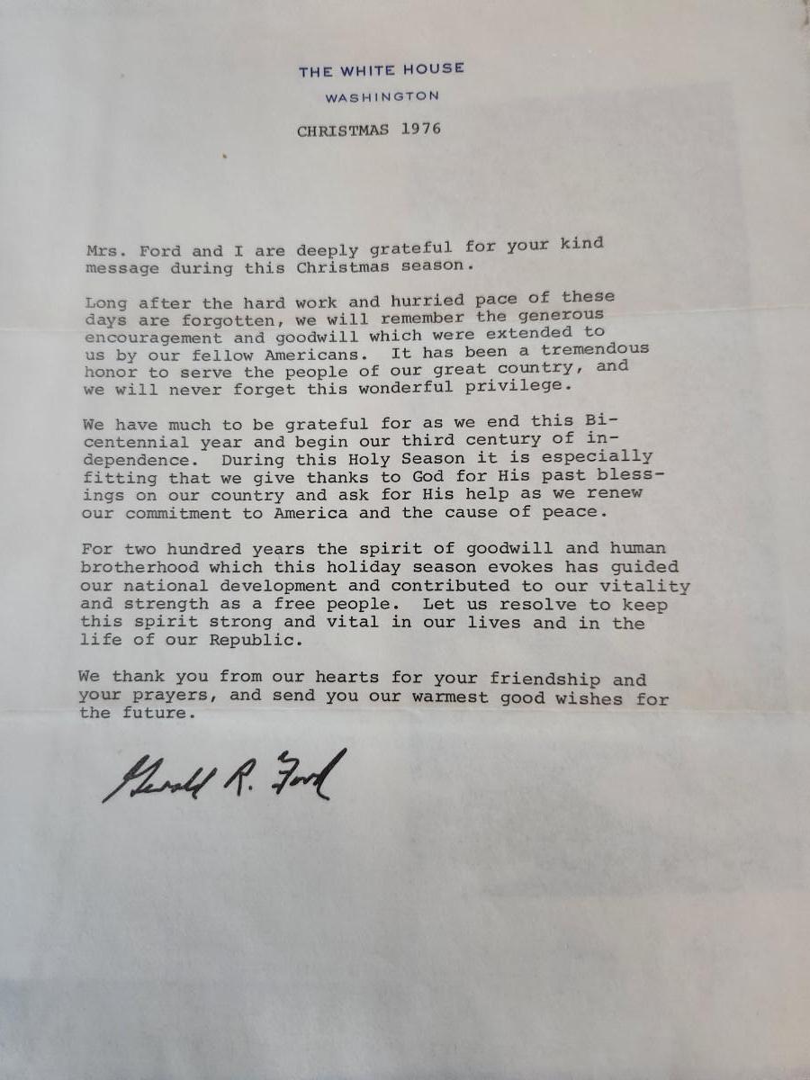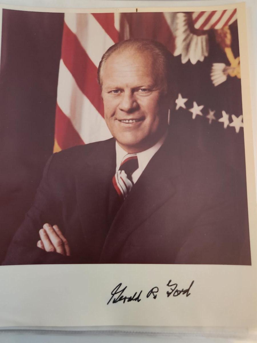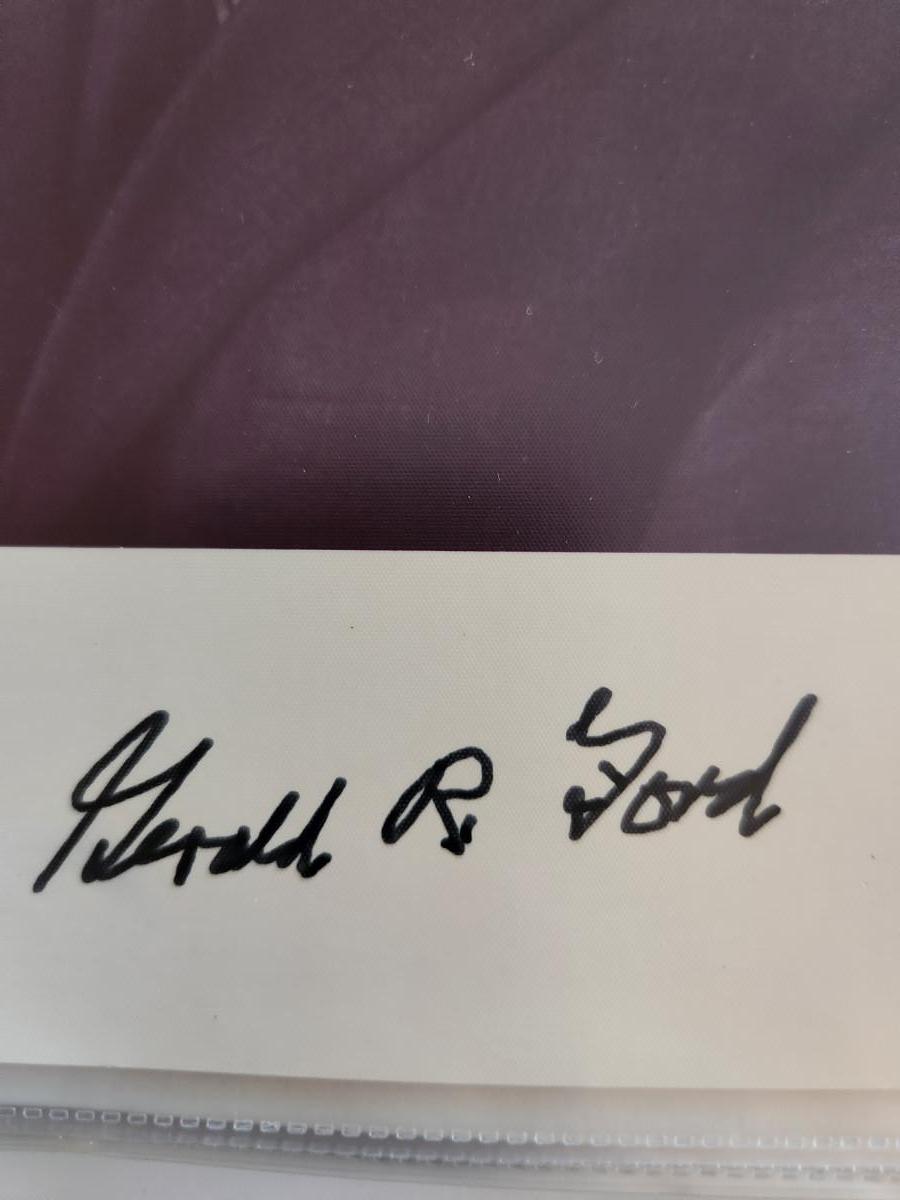 This auction lot is for a Photograph of President Gerald R. Ford Plus a Christmas Letter. The photo has a signature but we are quite certain it is not authentic. Also included in this lot is the note from the President's Assistant. The Christmas letter signature is stamped and comes with its envelope.