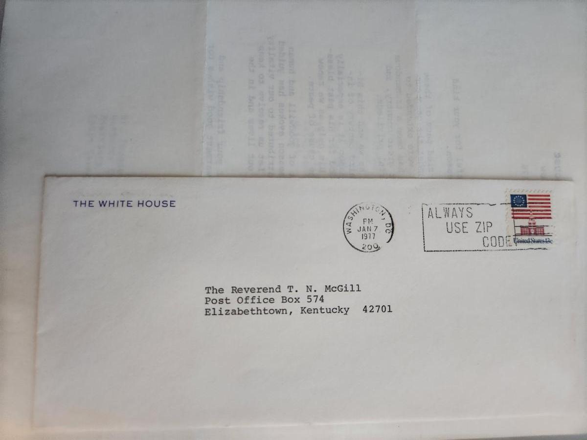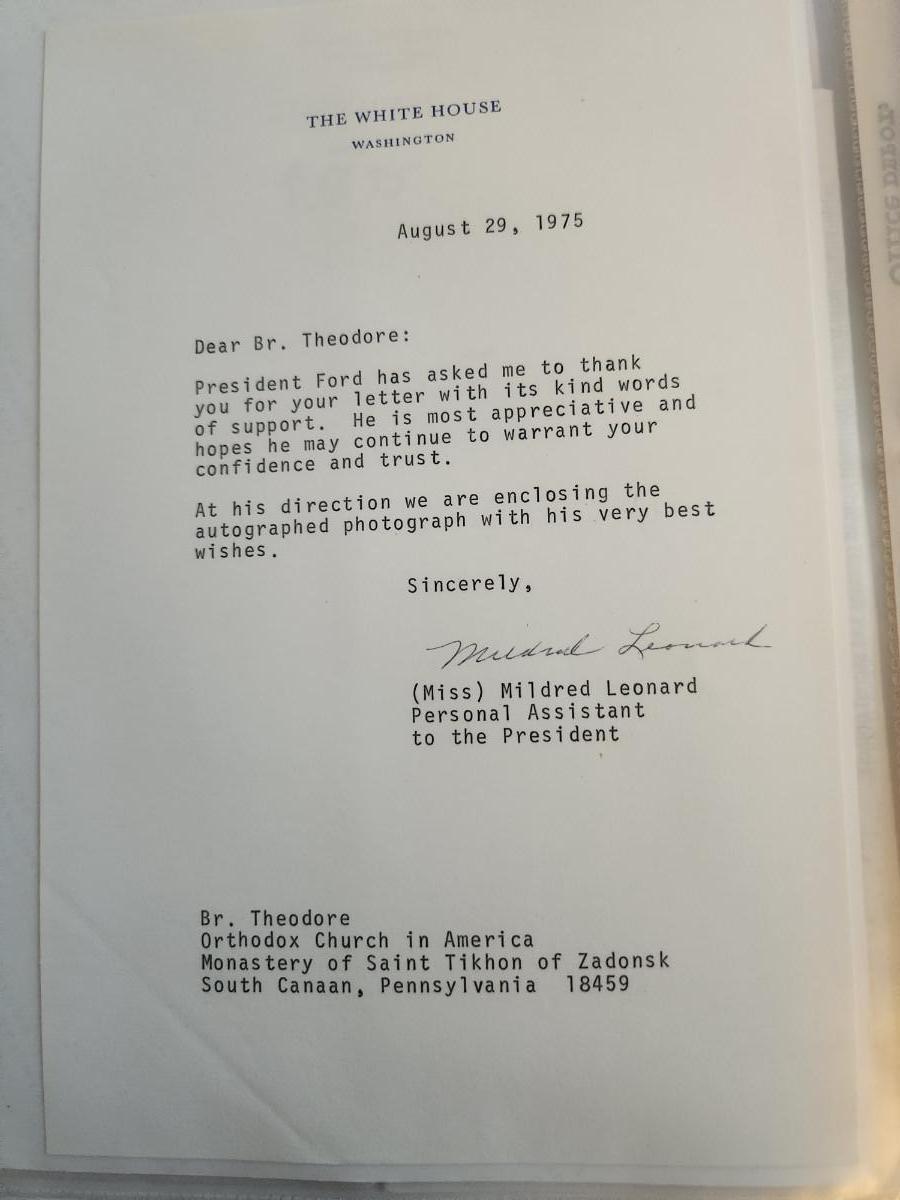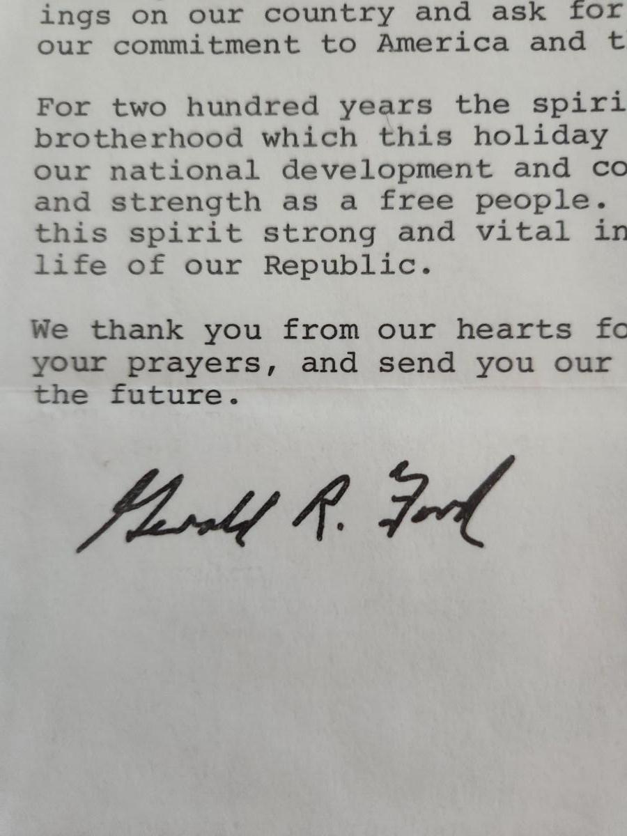 This auction lot is for a Photograph of President Gerald R. Ford Plus a Christmas Letter. The photo has a signature but we are quite certain it is not authentic. Also included in this lot is the note from the President's Assistant. The Christmas letter signature is stamped and comes with its envelope.
