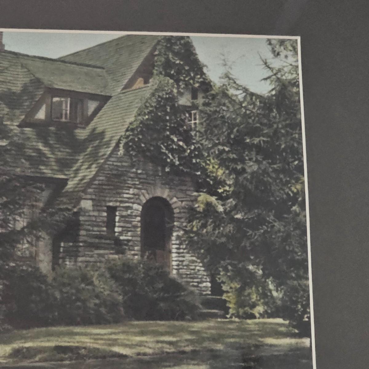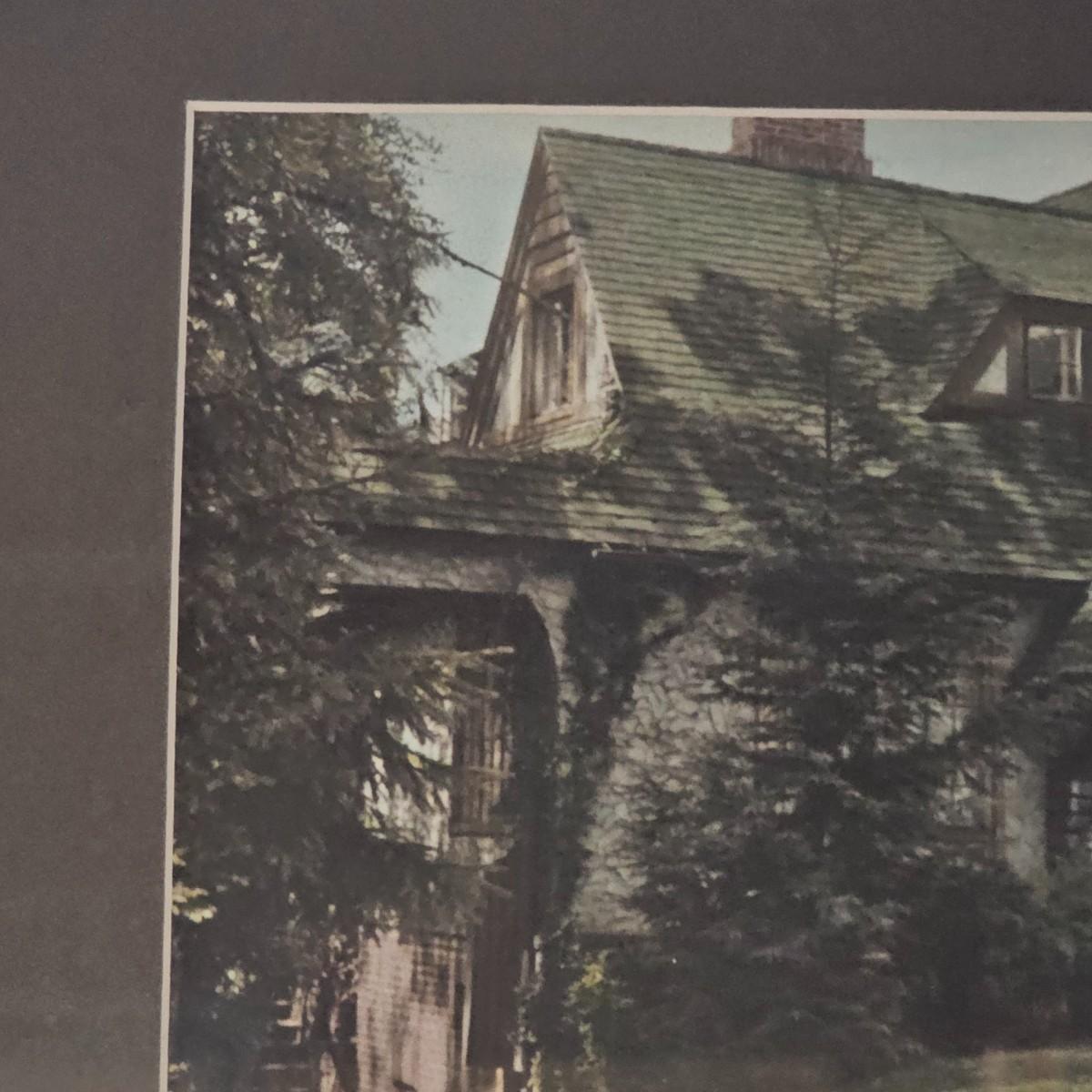 Wooden framed photo image of a quaint stone cottage. Surrounded by trees and bushes, a haven for all. Piece is framed under glass. Frame measures 15" x 12"H, has hanging wire on back. See photos for details. Shipping available. Shipping can be costly. We suggest contacting our preferred local shipping provider, Postage Express, with dimensions and getting an estimate before bidding: (828) 255-9250 or shipping@postageexpressnc.com.