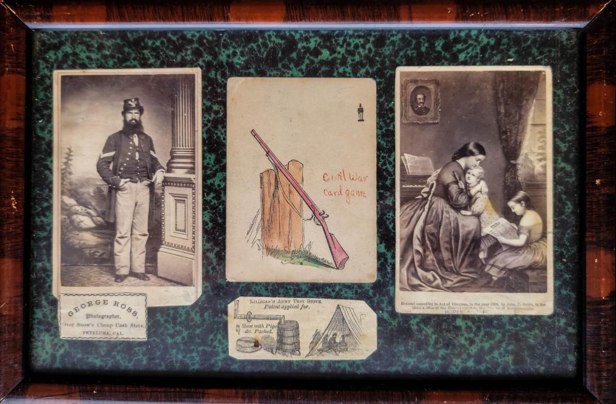 Measures 3 1/2" X 3.2/14". Plus a Civil War Card game and a picture of a woman with child, by John P. Soule. All in VG conditions. Item was not taken out of the frame.