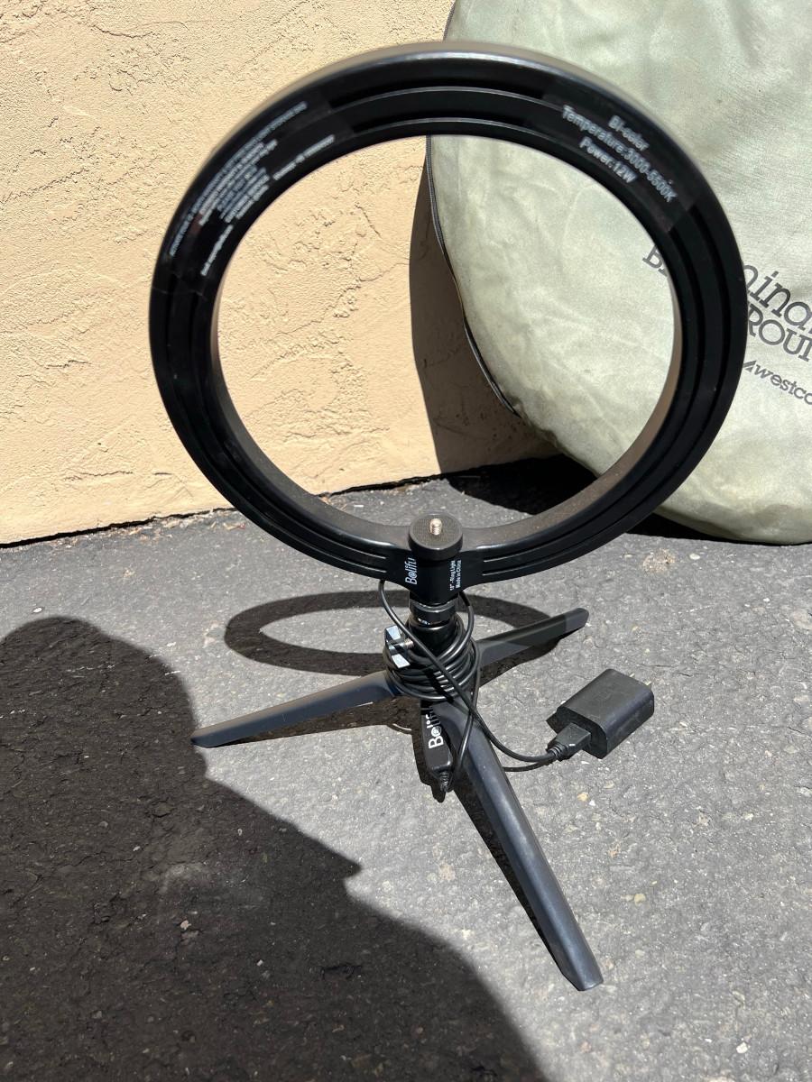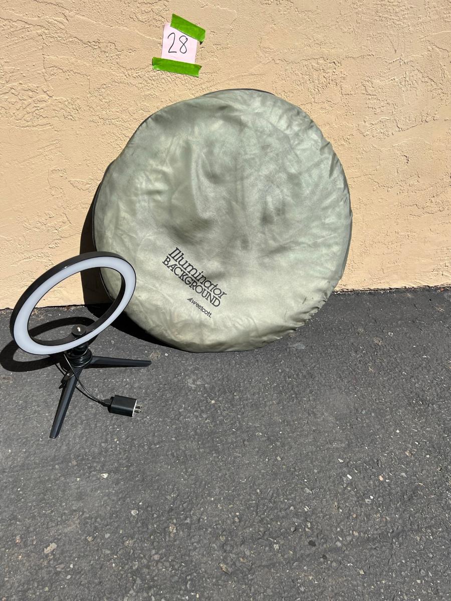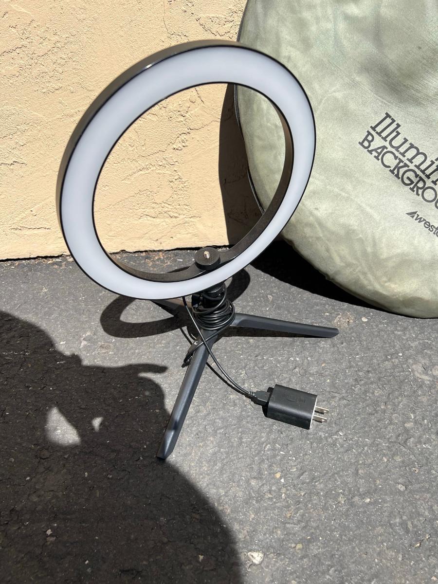 Illuminator Background by Westcott and a Belifu Bi-color temp 3000-5500k power 12w 10" ring light