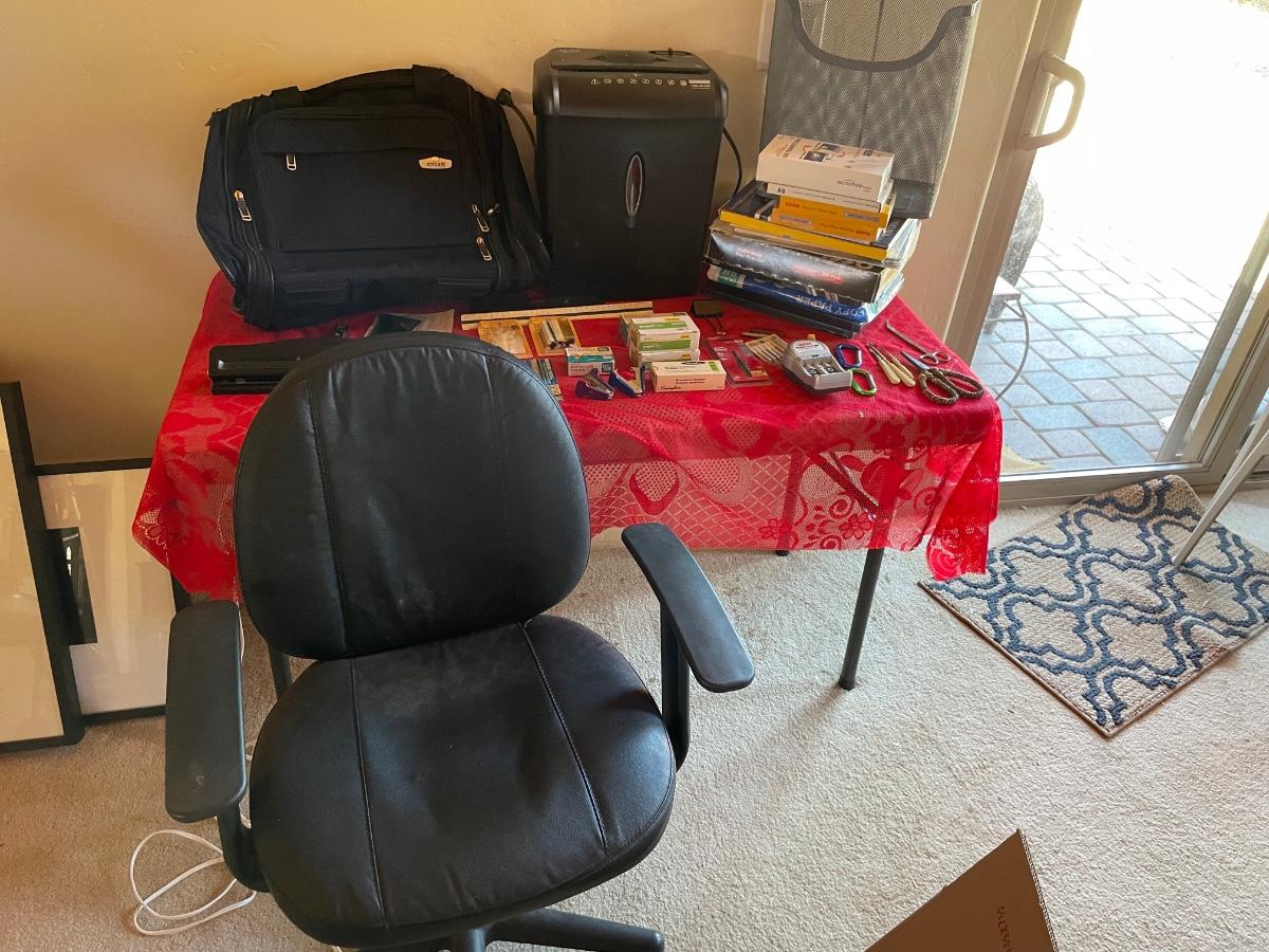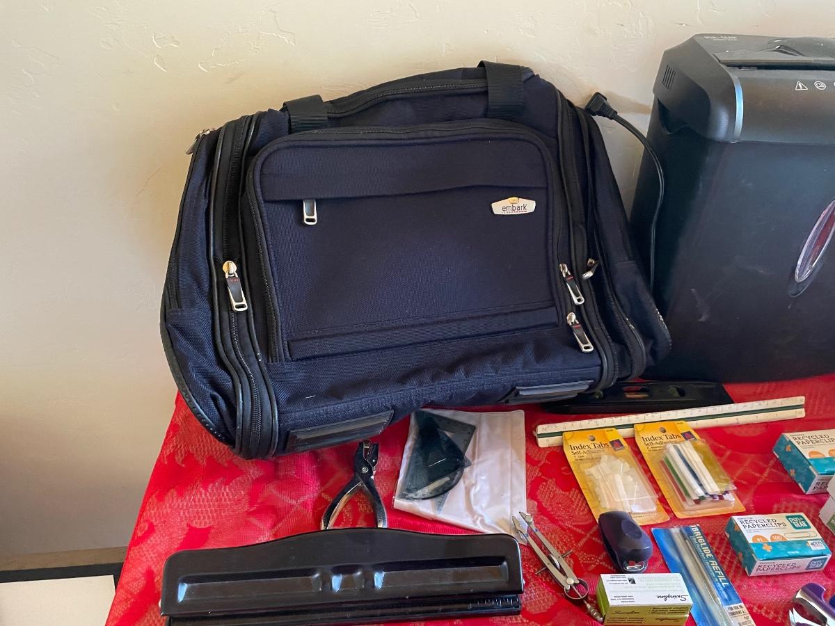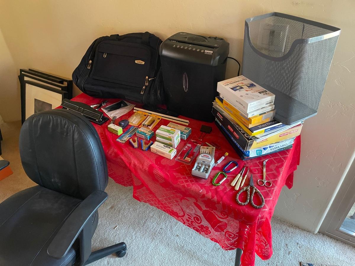 An assortment of office supplies including paper clips, standard staples, ruler, erasers, a Pen+Gear shredder in working condition, an Embark carry on bag and a desk chair. All in good condition.