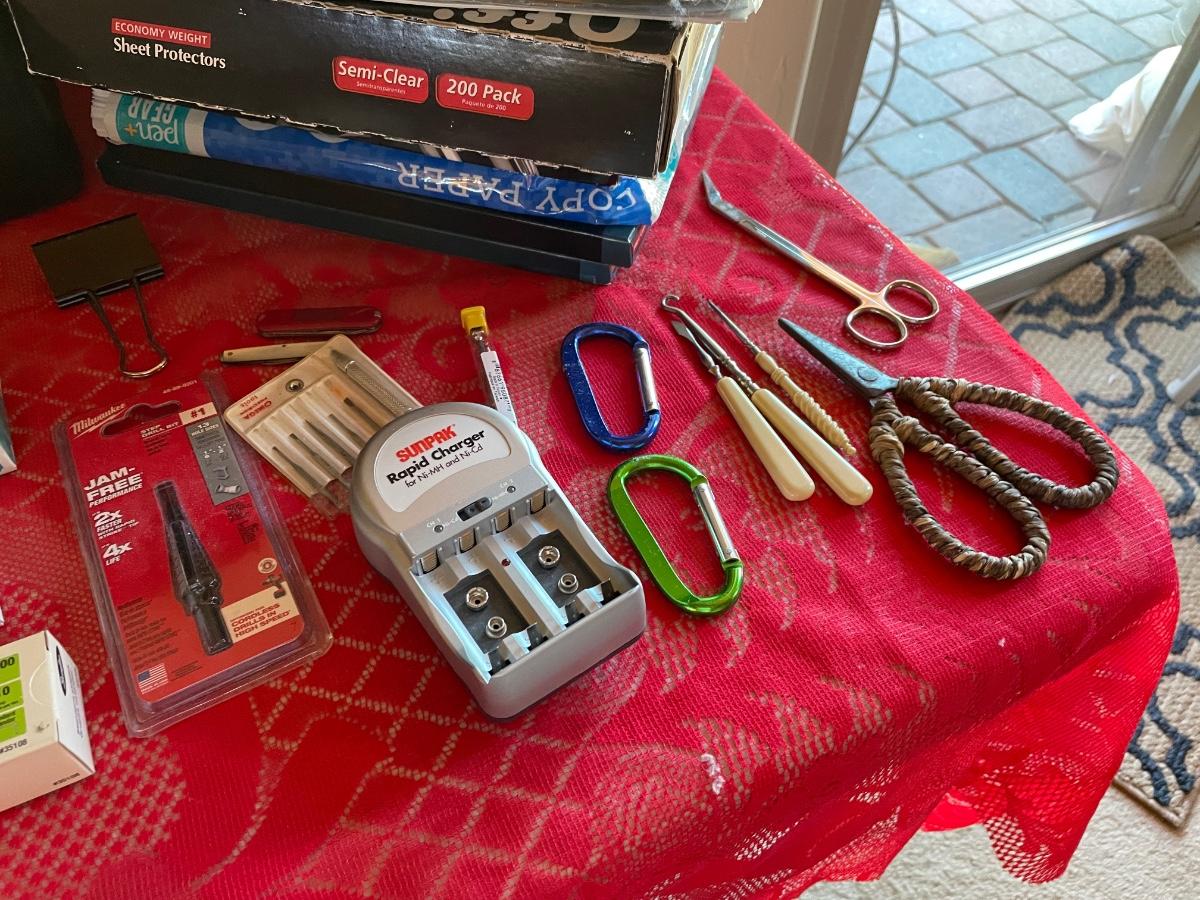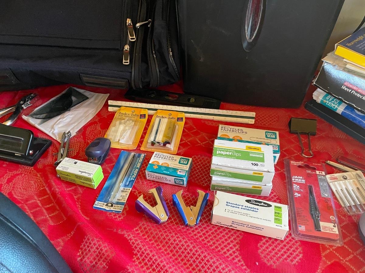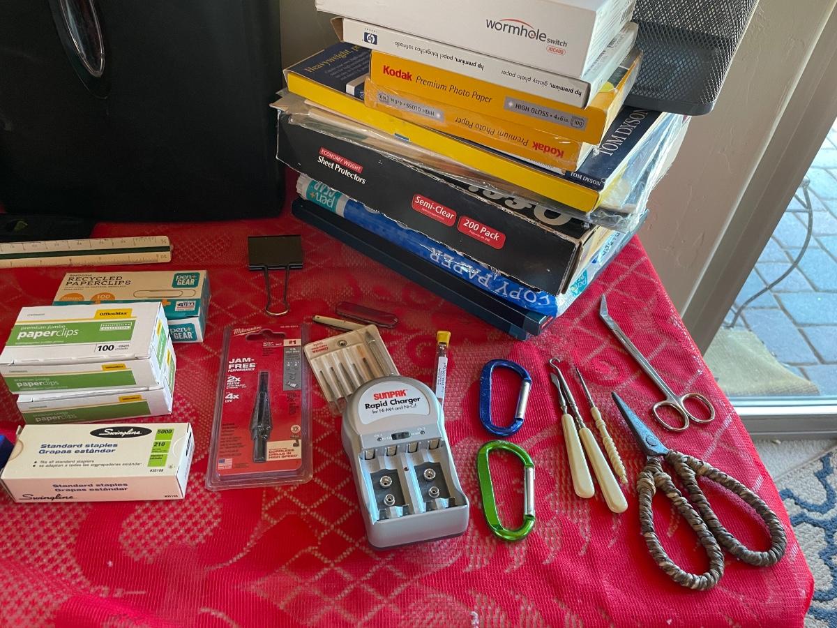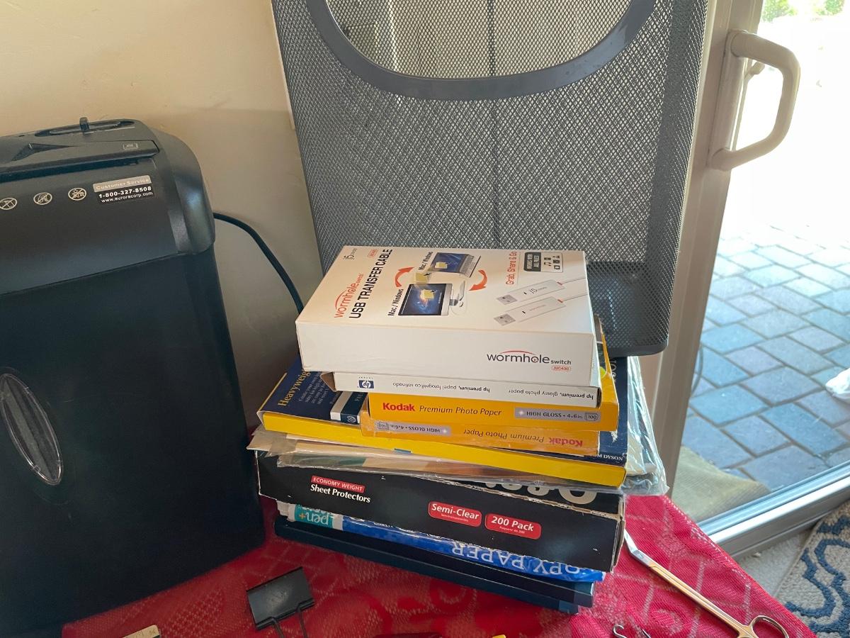 An assortment of office supplies including paper clips, standard staples, ruler, erasers, a Pen+Gear shredder in working condition, an Embark carry on bag and a desk chair. All in good condition.