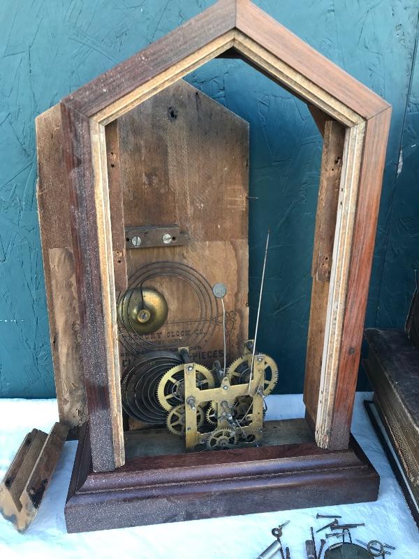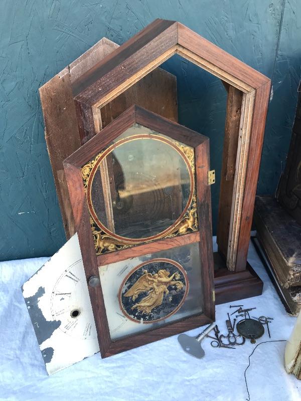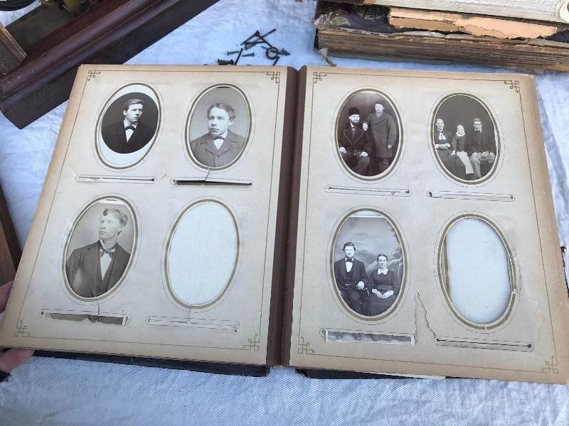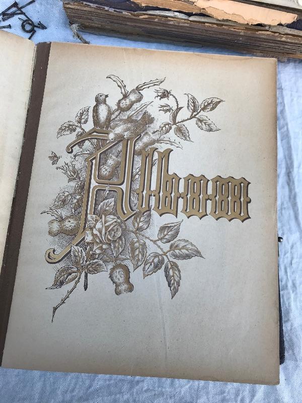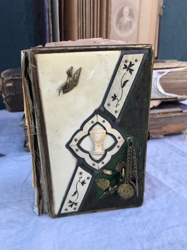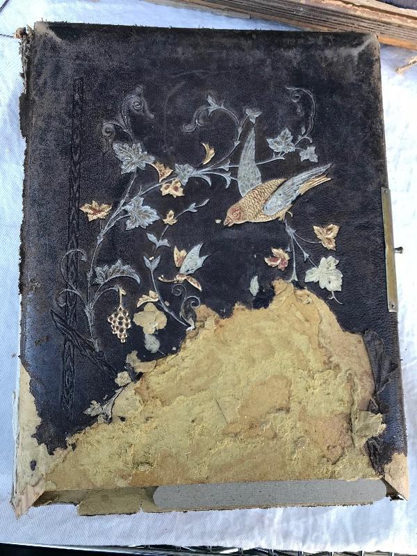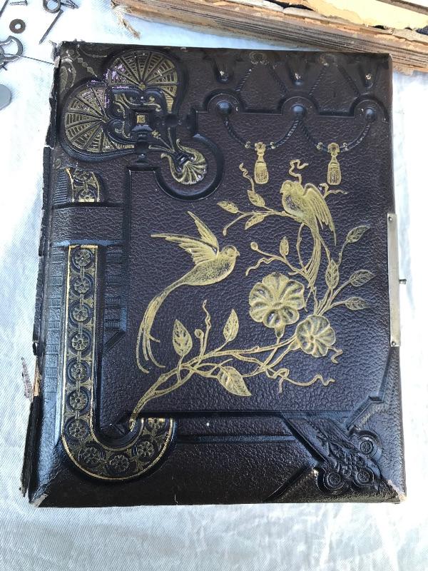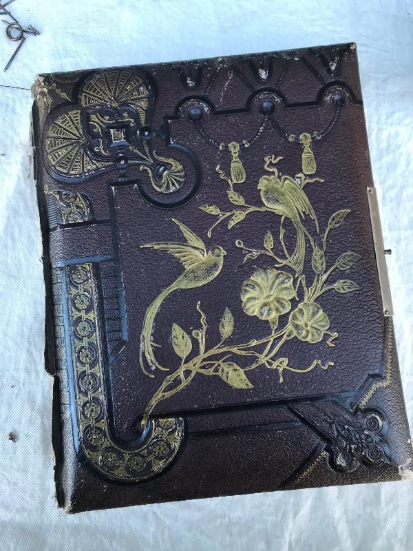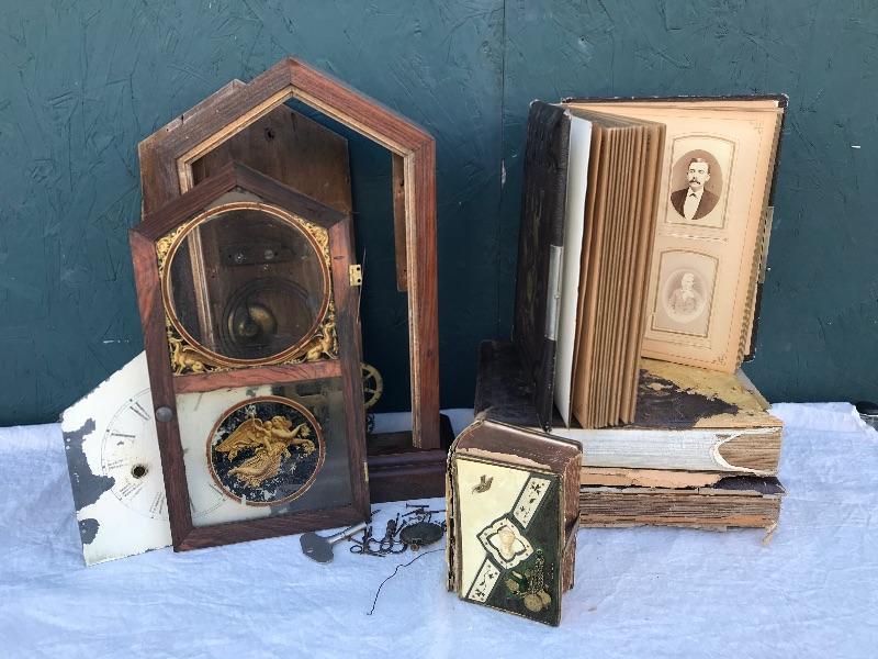Gorgeous set of photo albums! Carved leather with gold embossed details. All photos are in great condition! Dimensions are 9" x 2.5" x 11". The clock is beautiful and is in pieces. If you are handy, it could be a fun project to put back together or repurpose the parts for an art project. Dimensions are 9.75" x 3.75" x 17". Antique Bible has amazing details! Dimensions are 3.25" x 2.5" x 5.75".