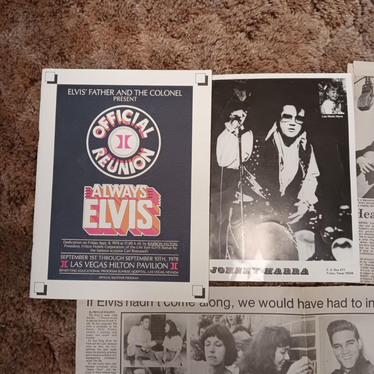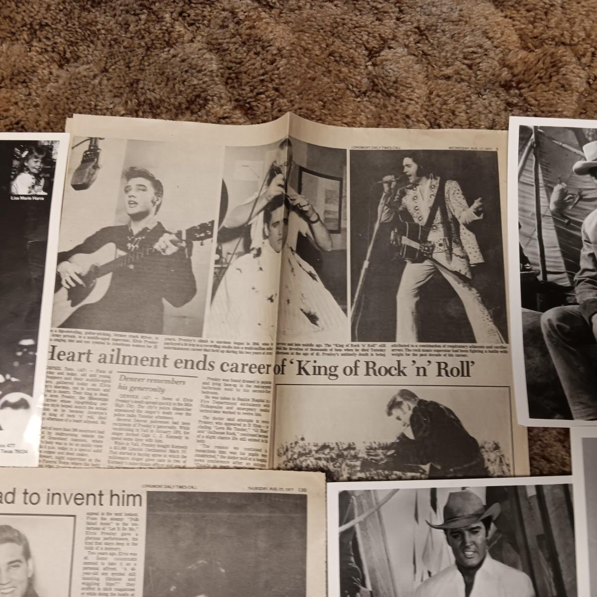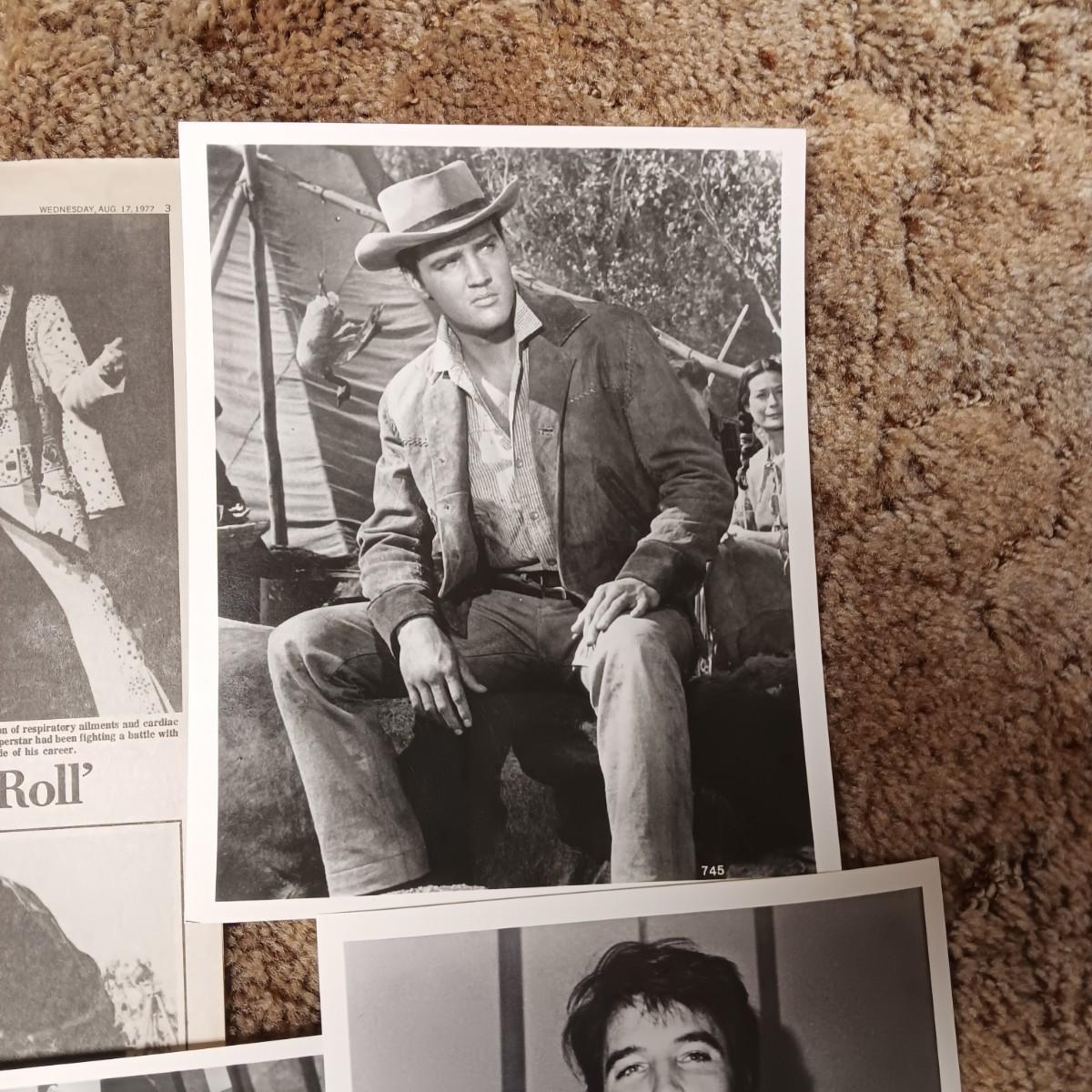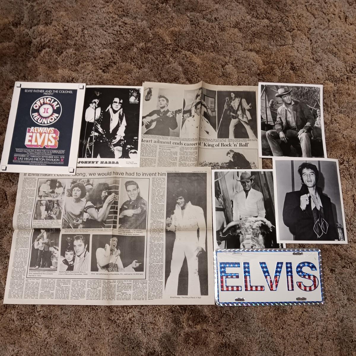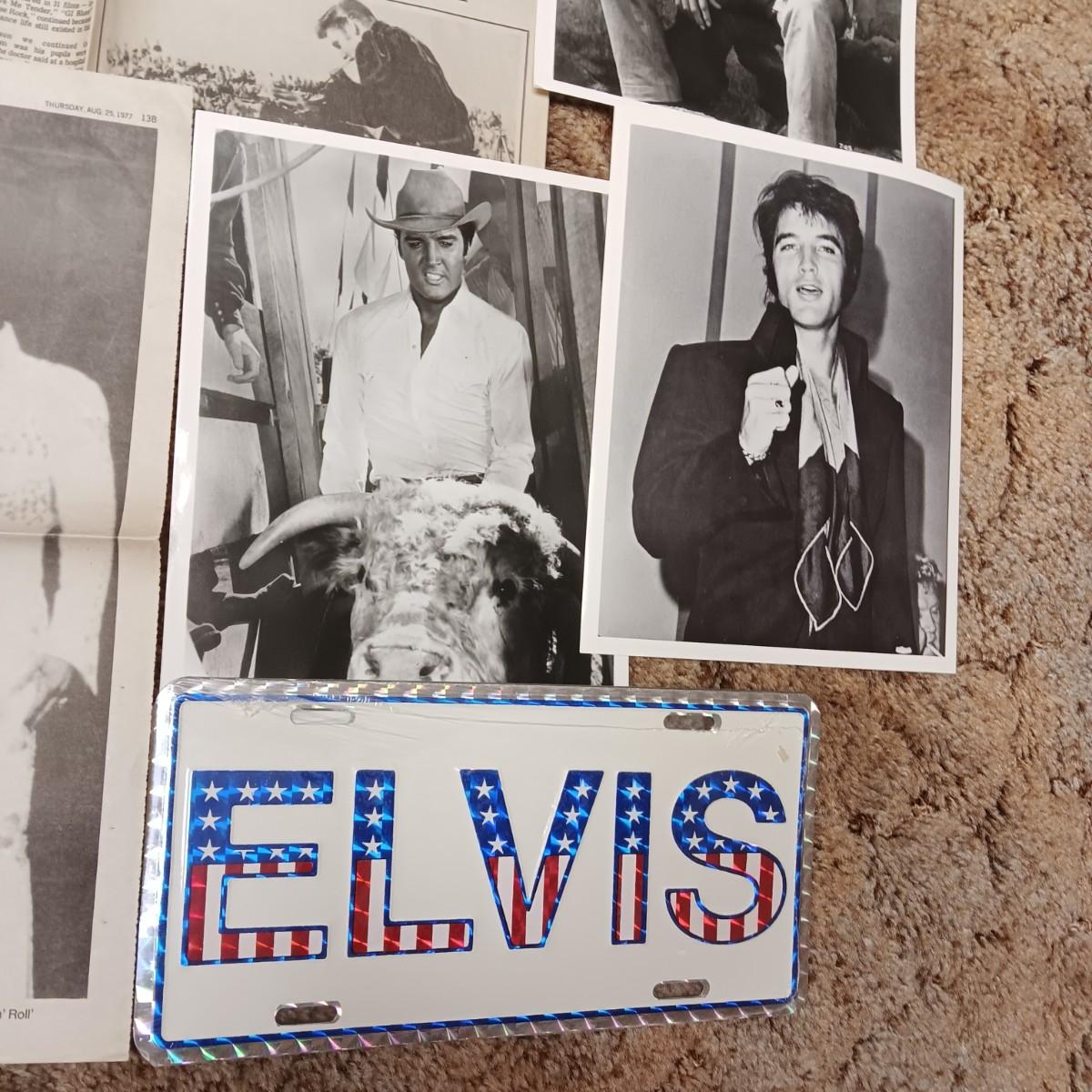 PHOTOS, NEWSPAPERS AND TIN PLATE OF ELVIS PRESLEY