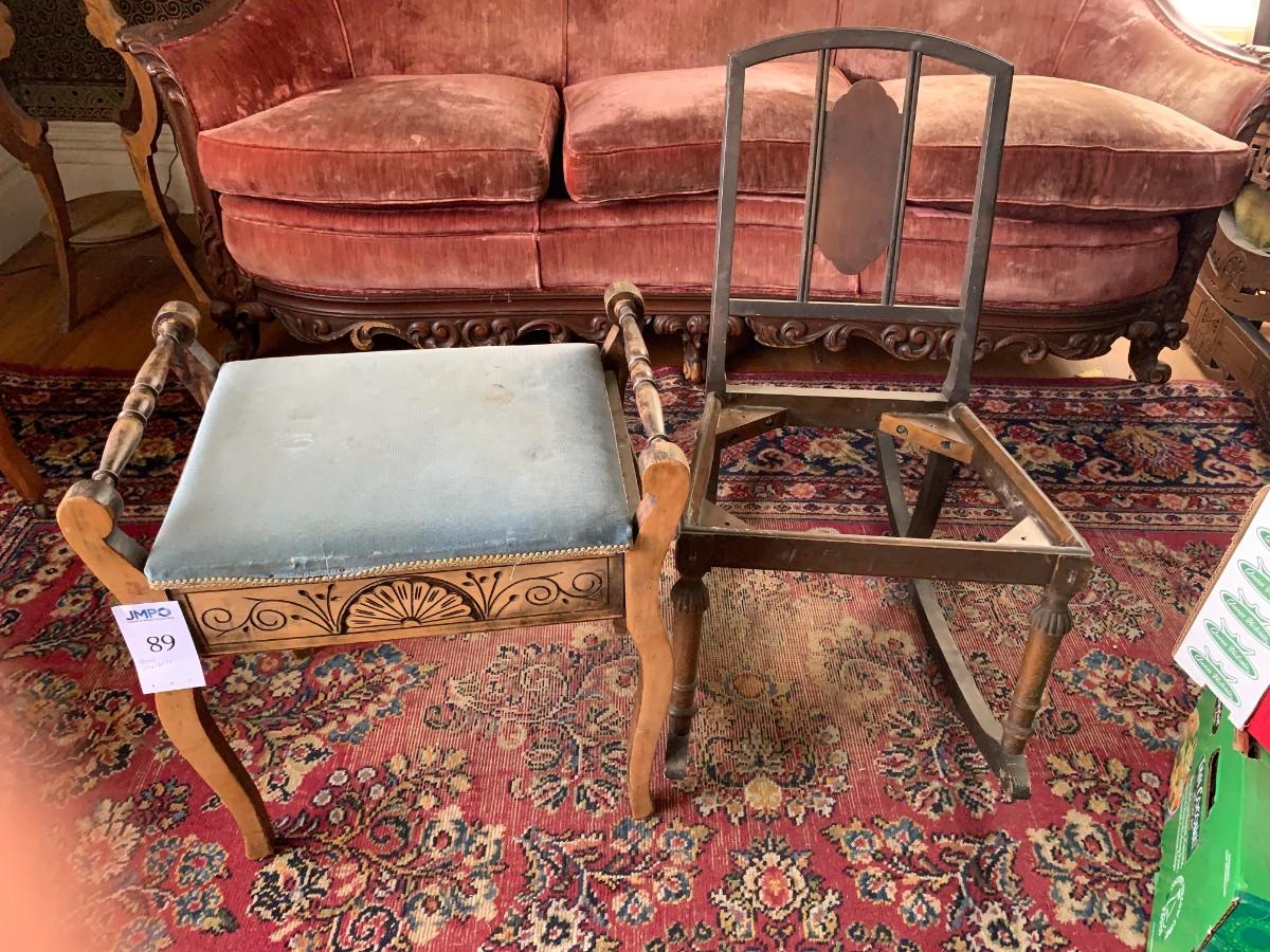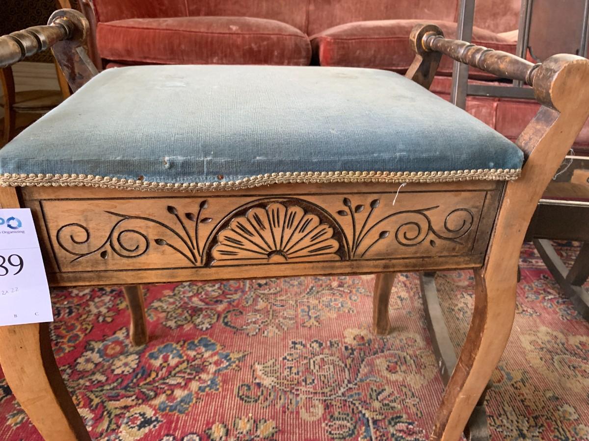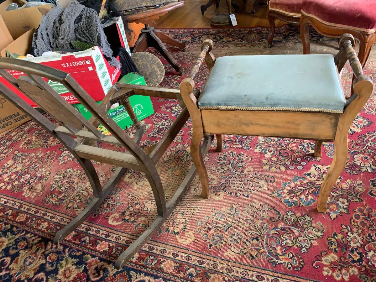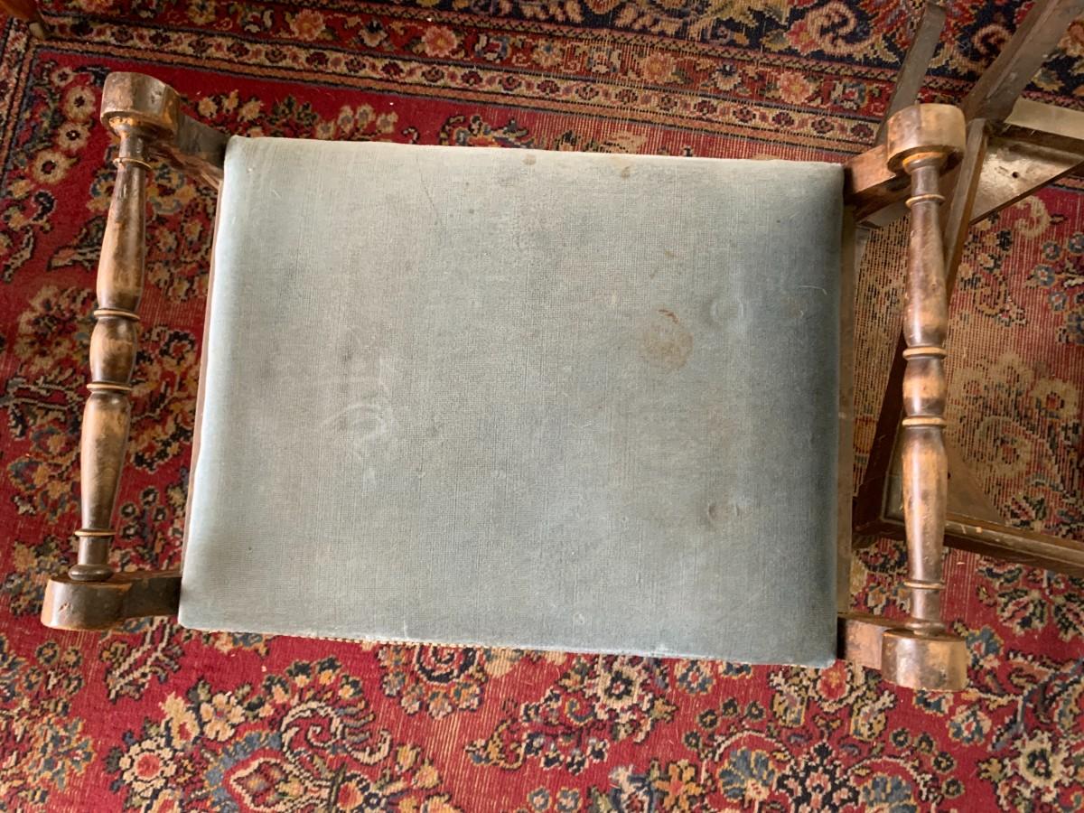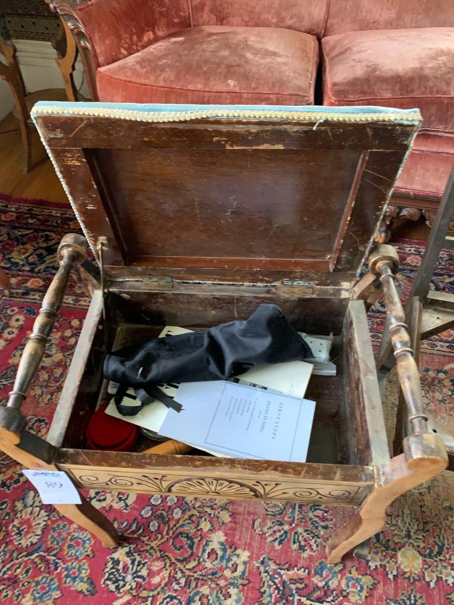 Piano Bench with Carved Frame, Spindle Sides, Small Blue Hinged Seat.