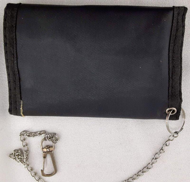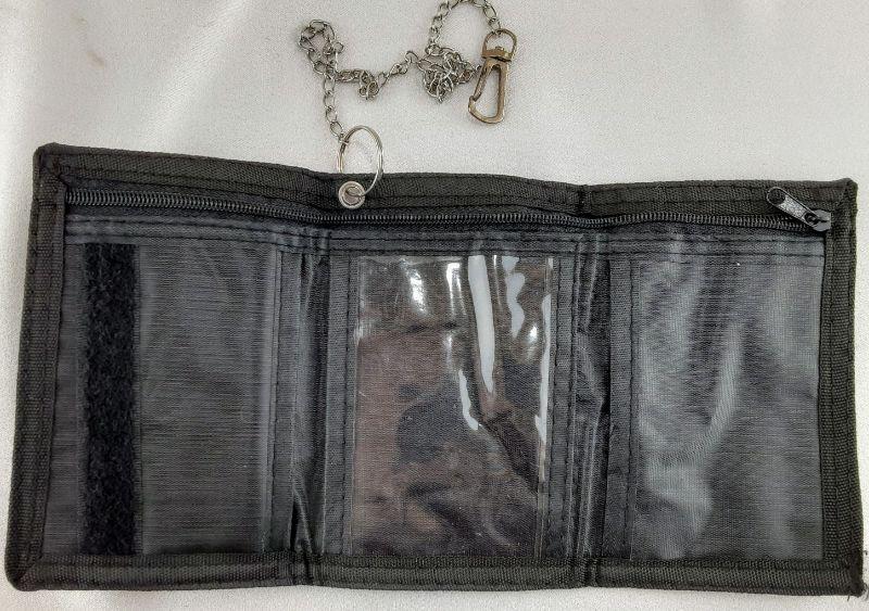 Nylon velcro closing wallet with change measures 4.5in. by 9.5in. when fully opened