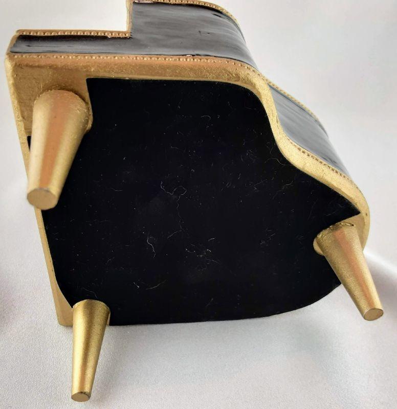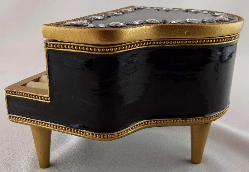 Cute piano shaped box with hinged lid and ring holder "keys". Measures 3.75in. tall and 4.5x4.5