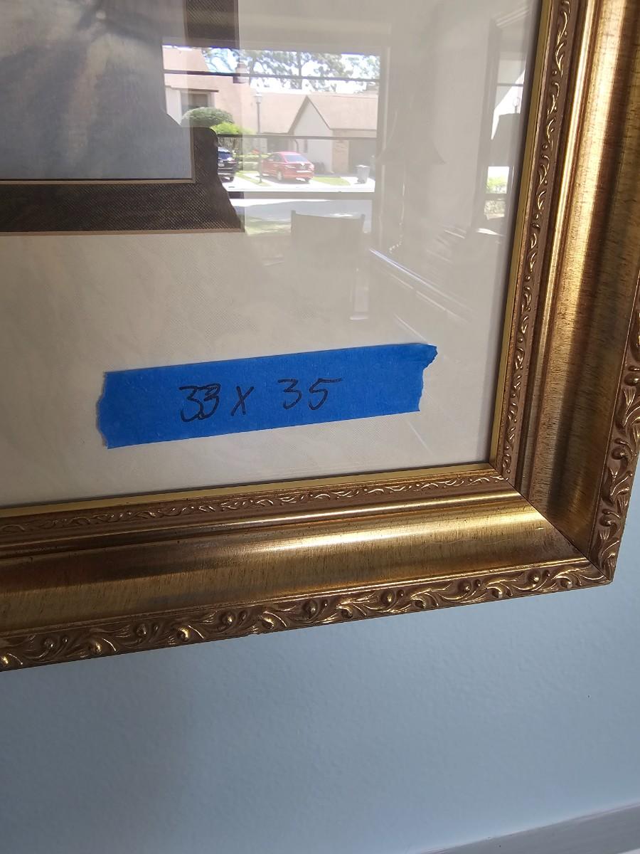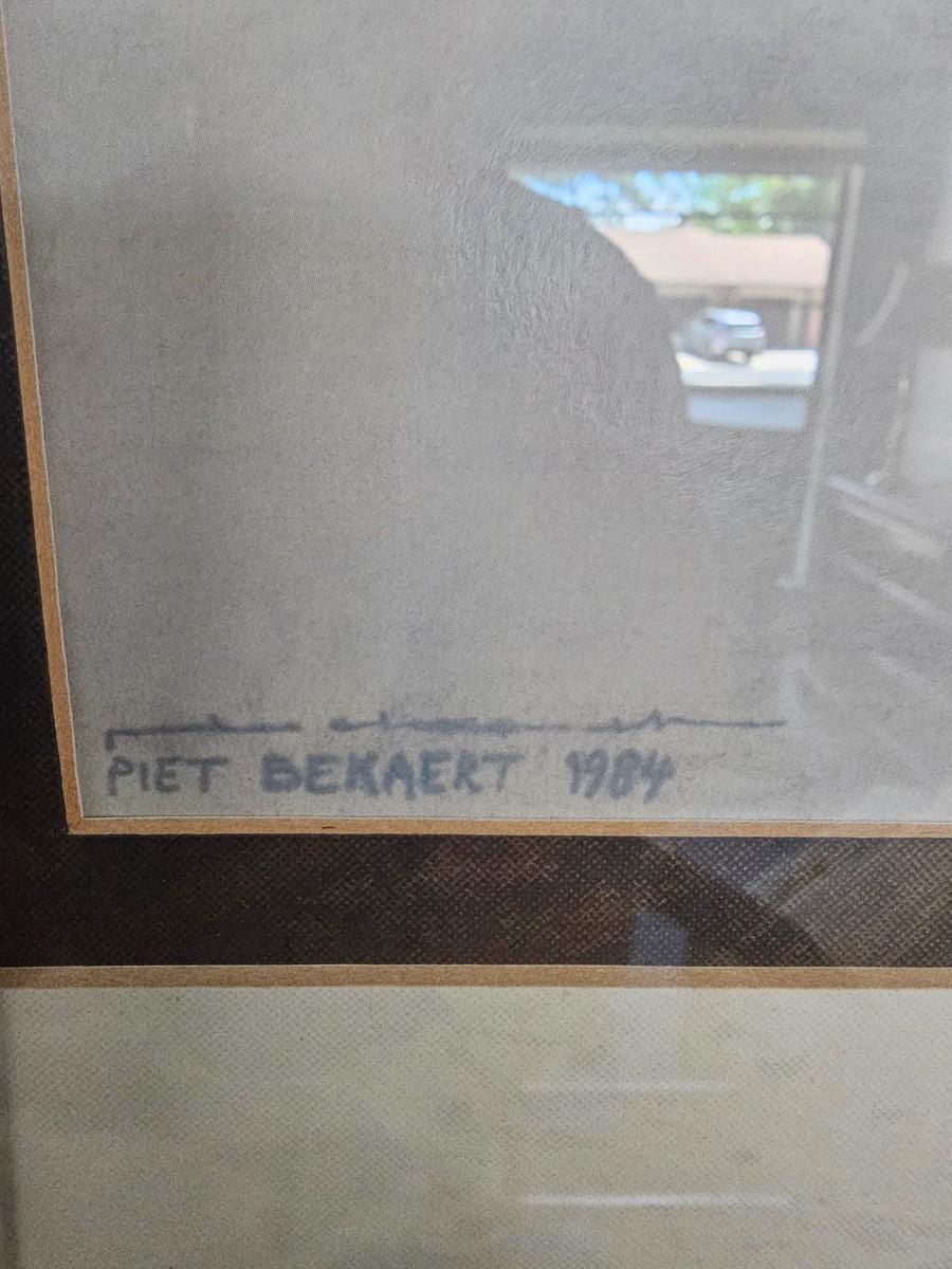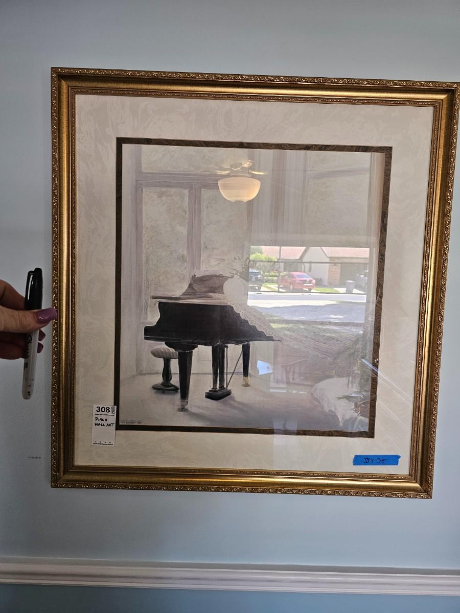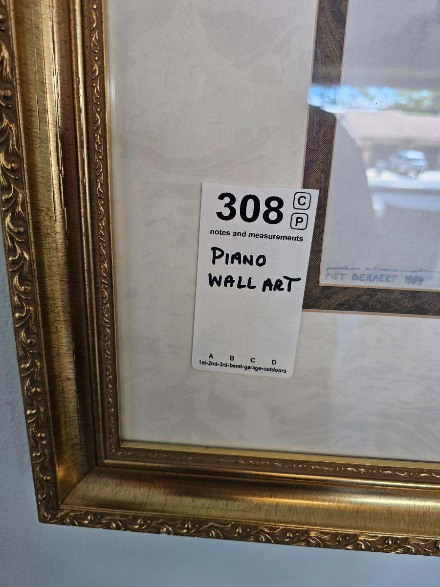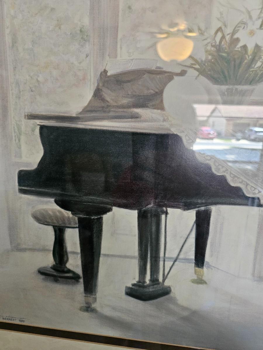 Measures 33 x 35" lovely gold frame, double matting, picturing a black baby grand piano. by Piet Bekaert 1984