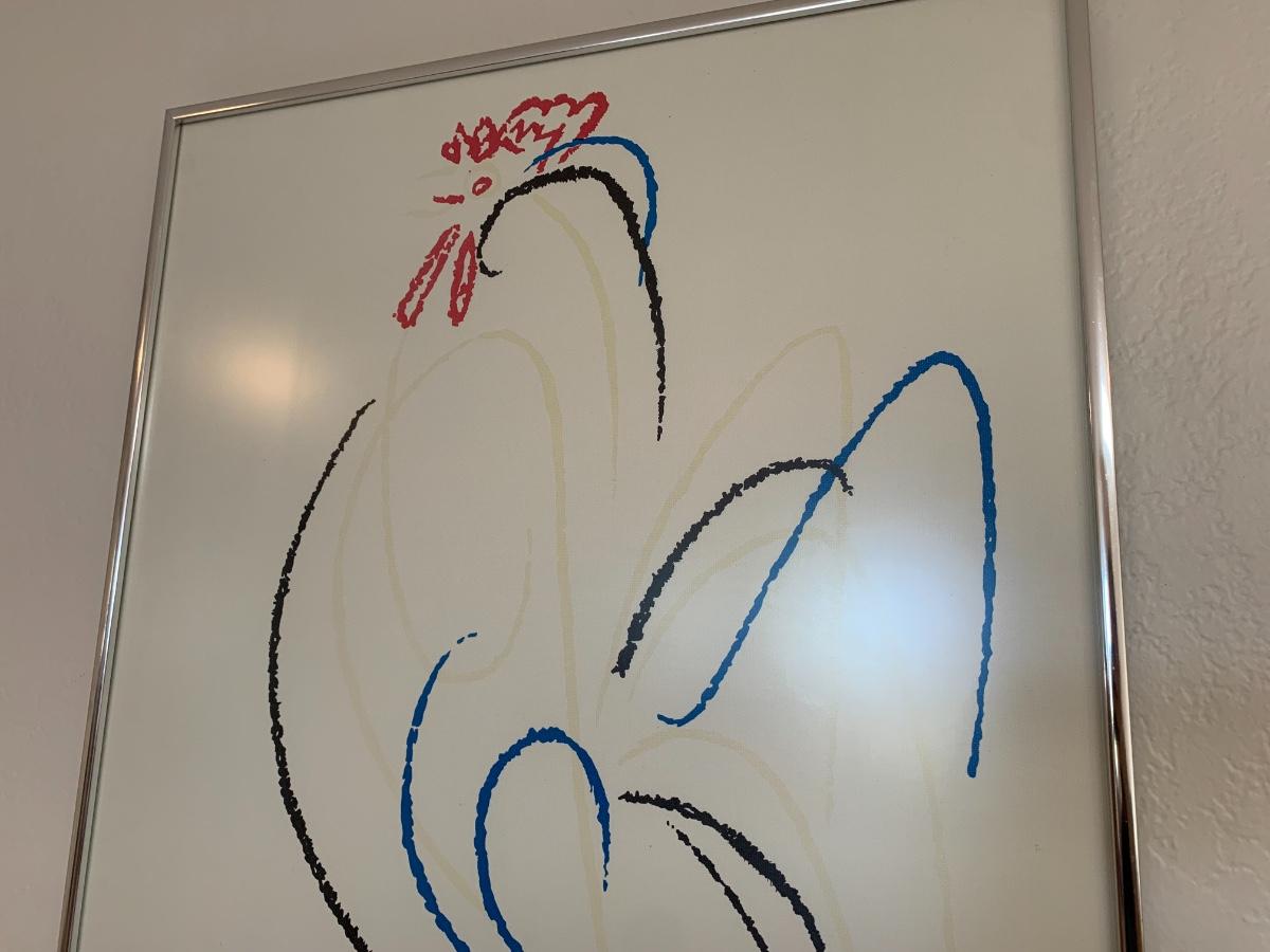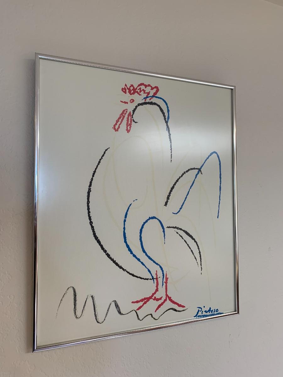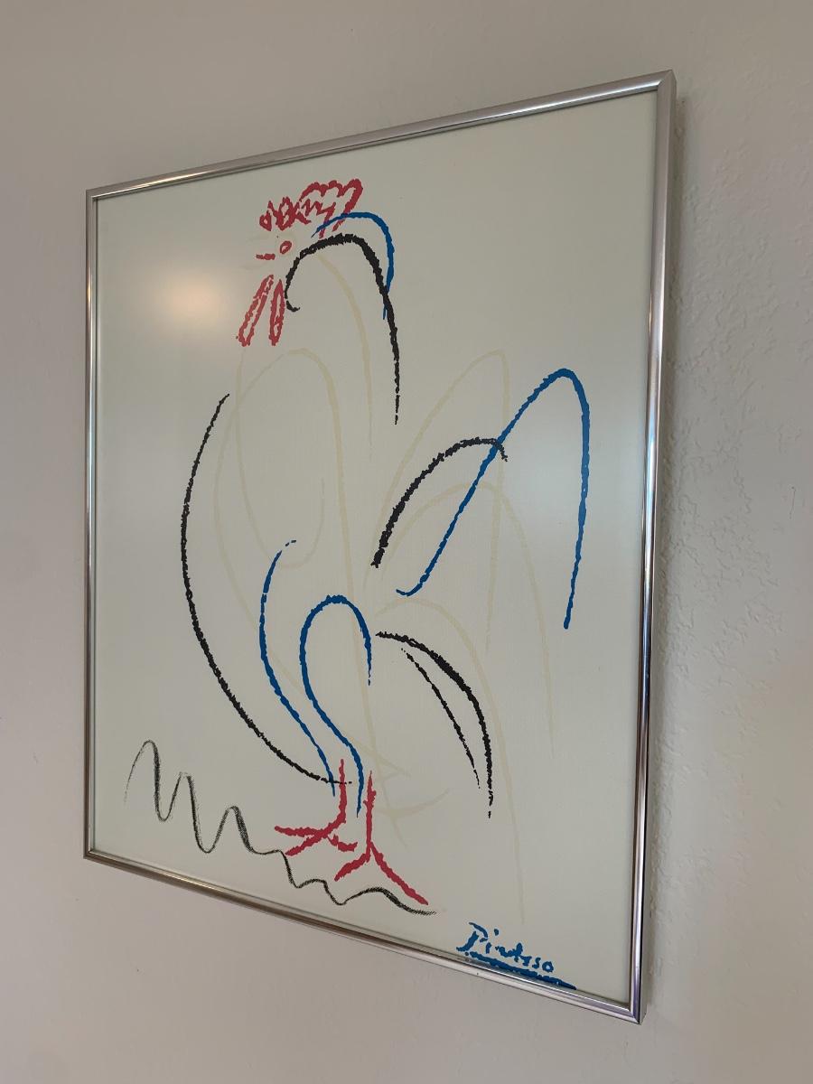 Rooster by Picasso, rooster print behind glass in metal frame in good condition with some slight fading. (20 inches X 24 inches)