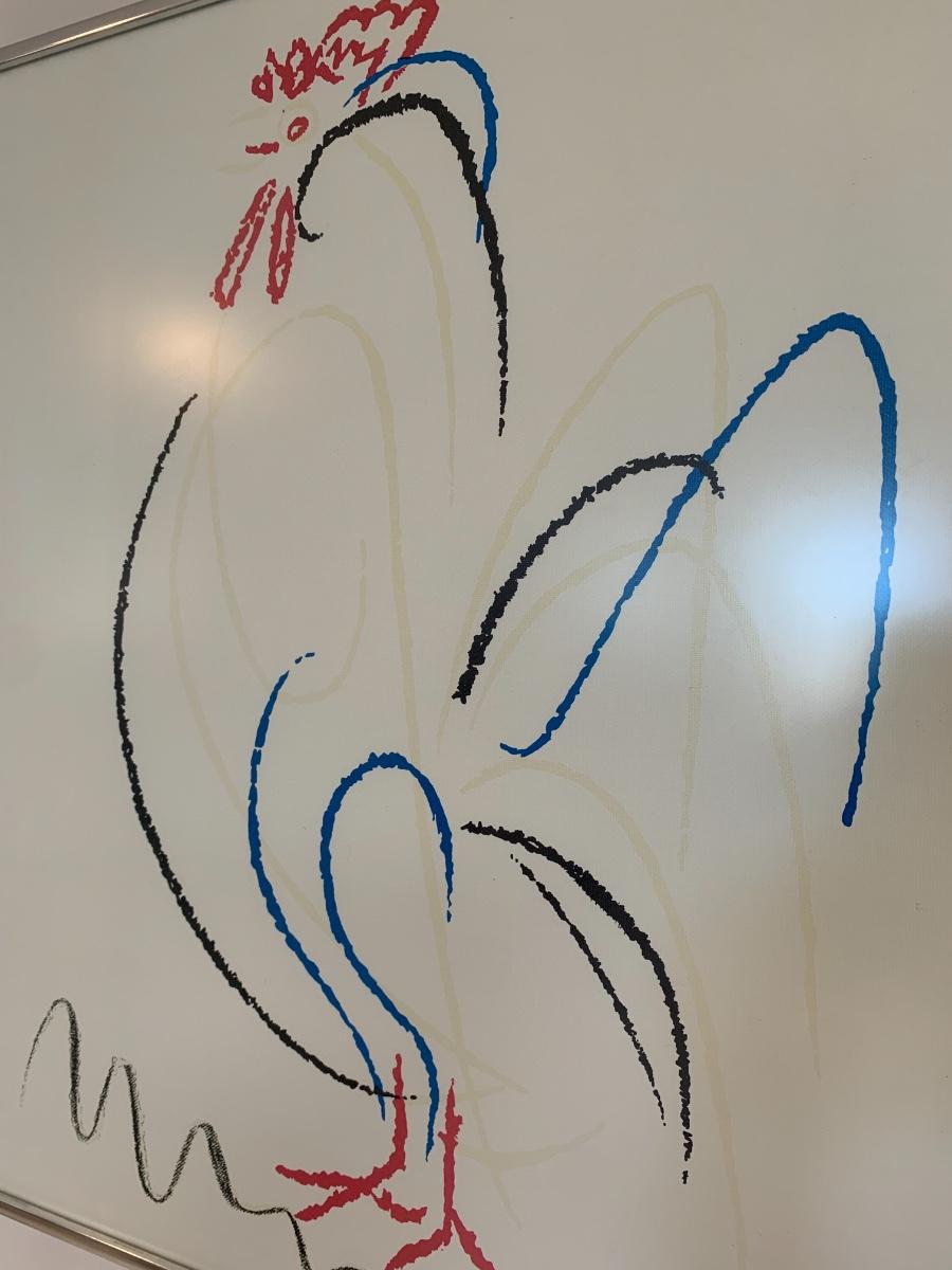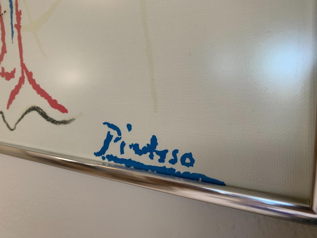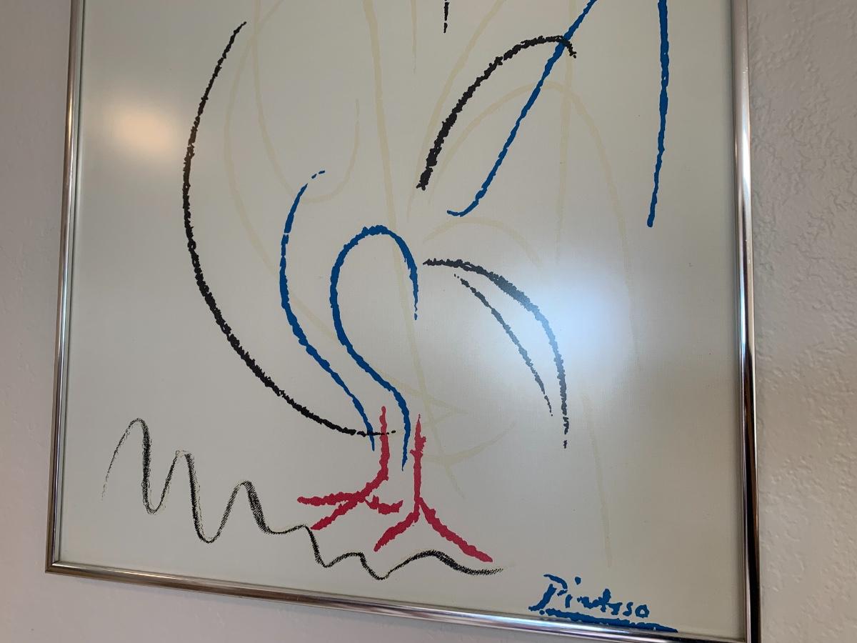 Rooster by Picasso, rooster print behind glass in metal frame in good condition with some slight fading. (20 inches X 24 inches)