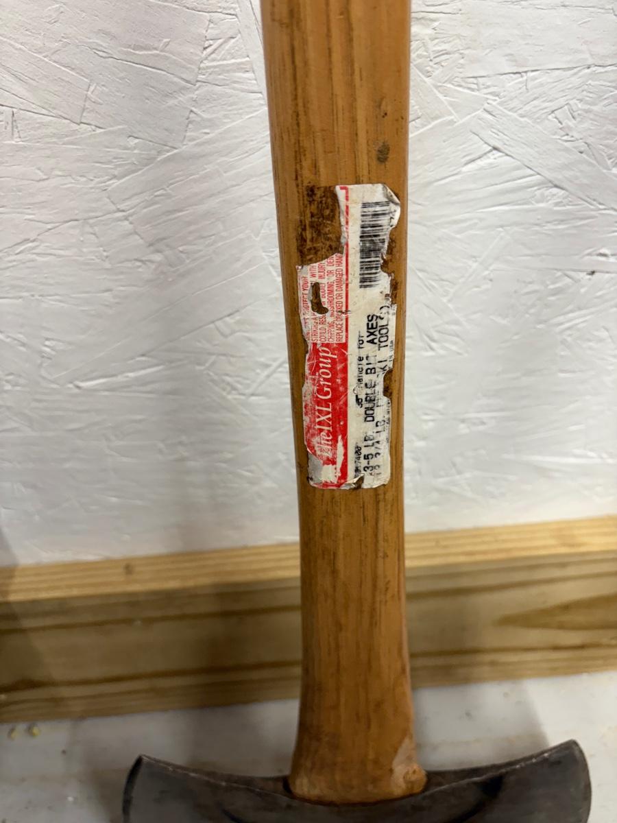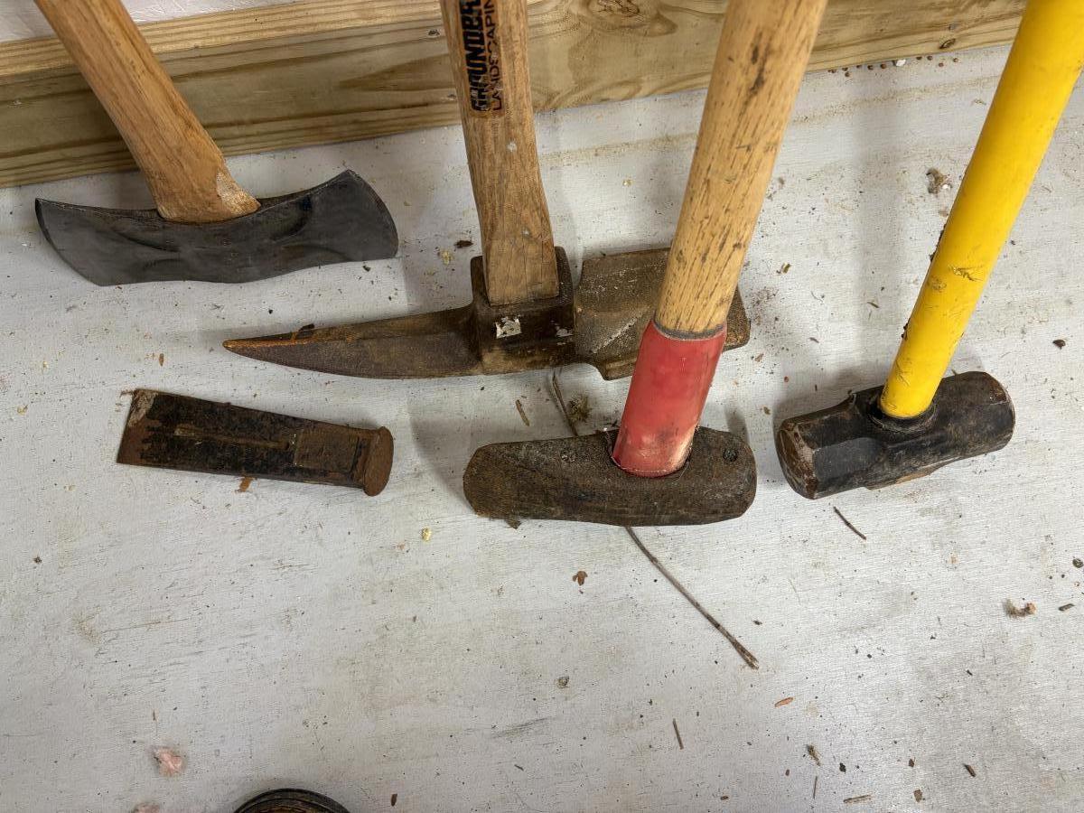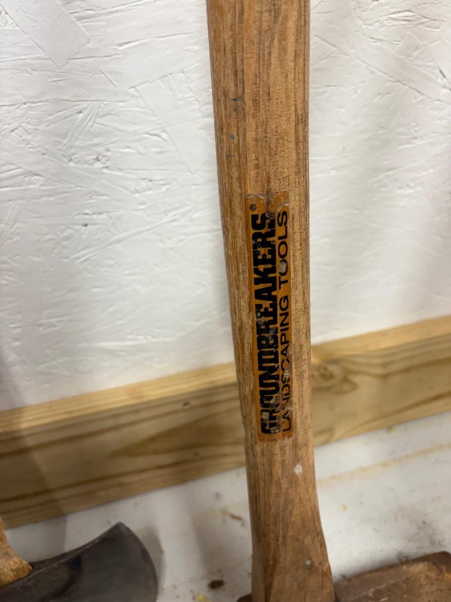 Mixed lot of landscaping/demolition tools. Pickaxe has a 33” handle.