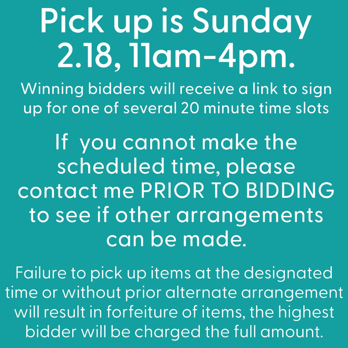 All items must be picked up during the listed date and times. Failure to pickup items during pickup times will result in forfeiture of items, the highest bidder will be charged the full amount.