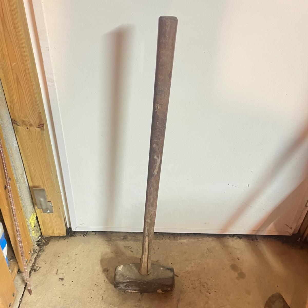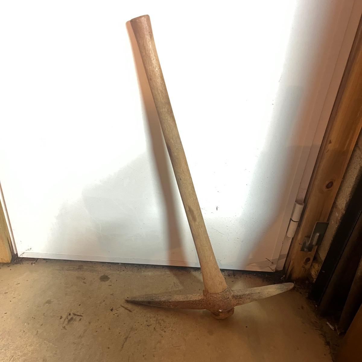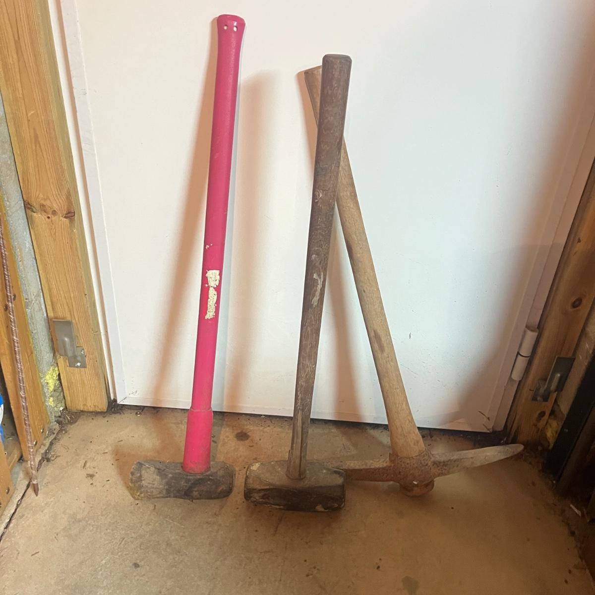 Lot includes a pickaxe, sledgehammer and a axe. Pickaxe measures 3” x 22” x 35”H.