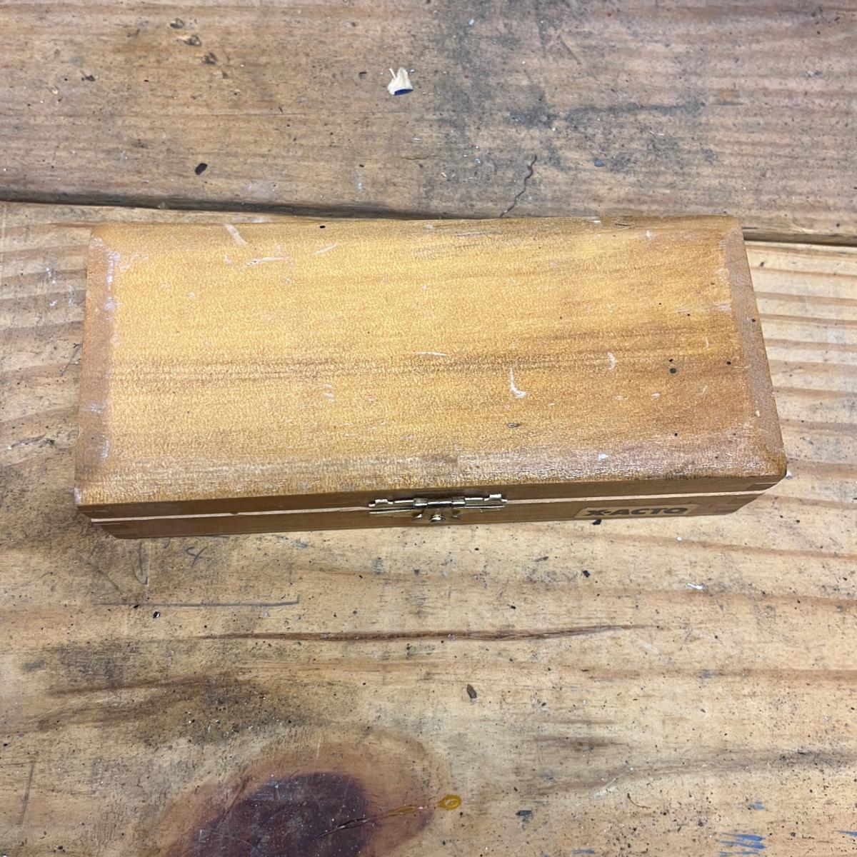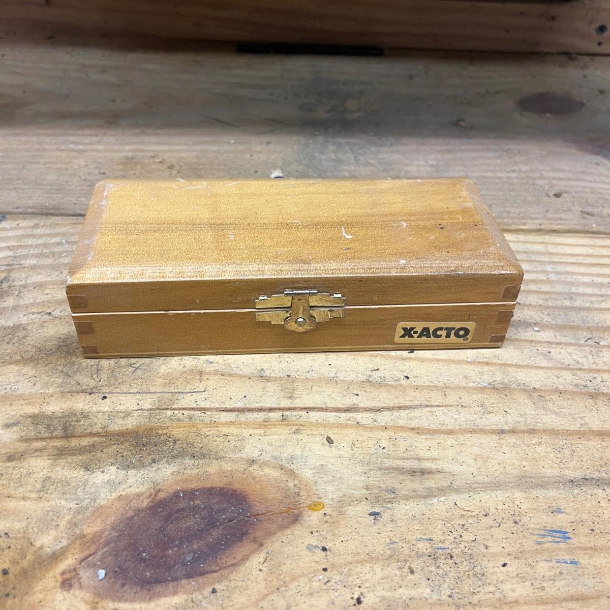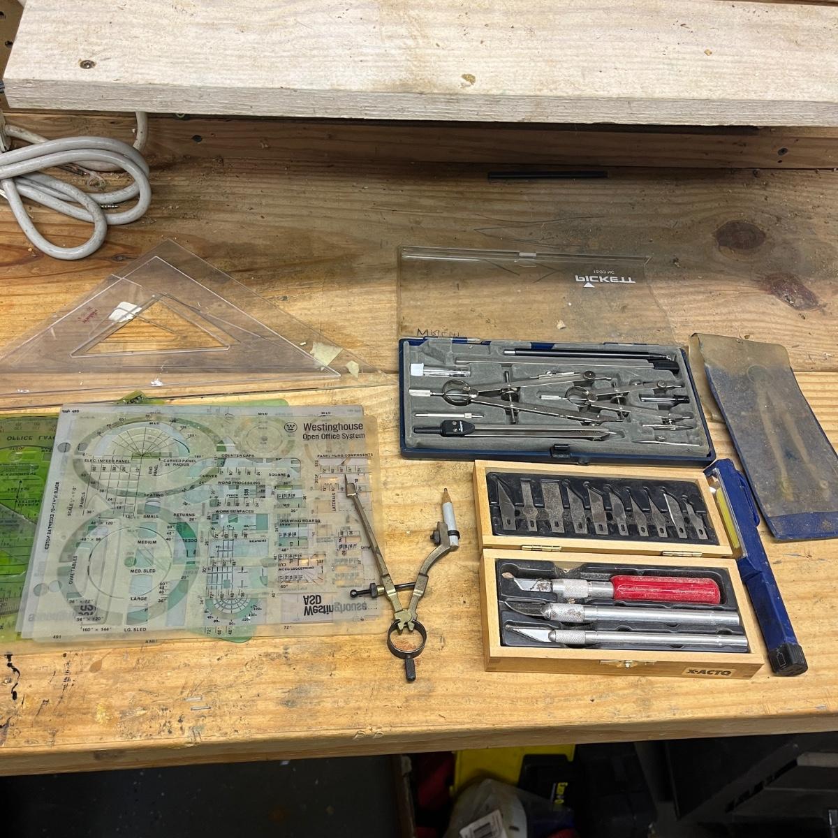 Lot includes All Pickett precision tool in a plastic case, X-Acto knife set in wooden box, plastic stencils and more. Pickett box measures 9” x 4.5” x .75”H. And by x has crack in it.