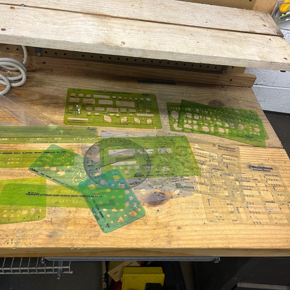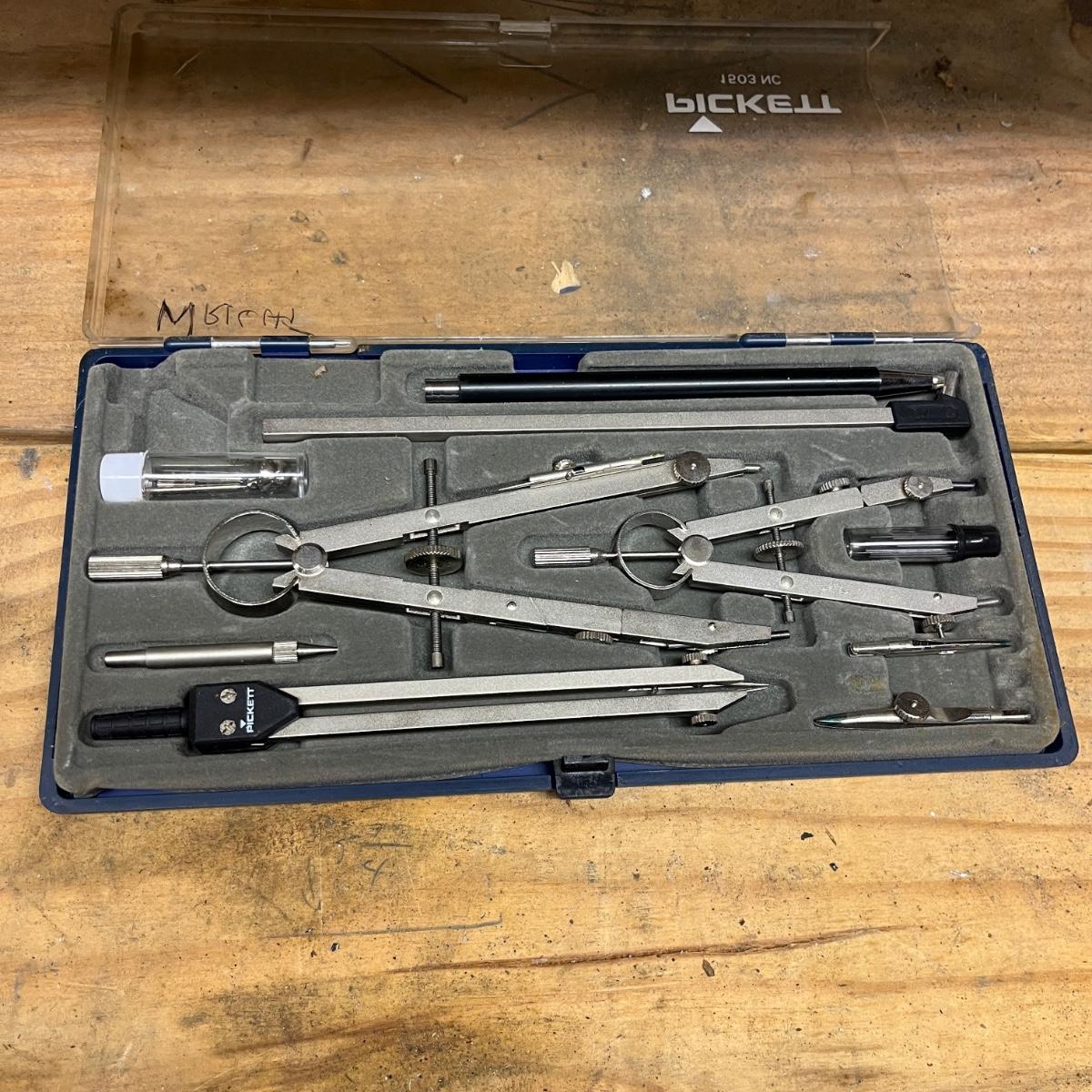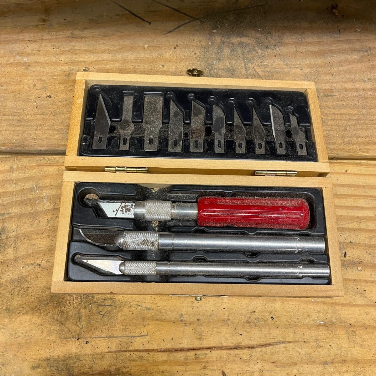 Lot includes All Pickett precision tool in a plastic case, X-Acto knife set in wooden box, plastic stencils and more. Pickett box measures 9” x 4.5” x .75”H. And by x has crack in it.
