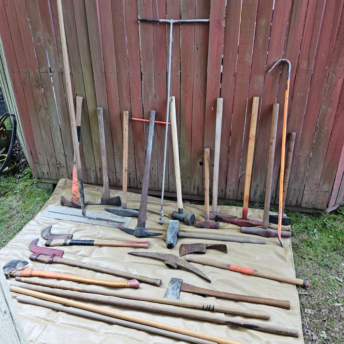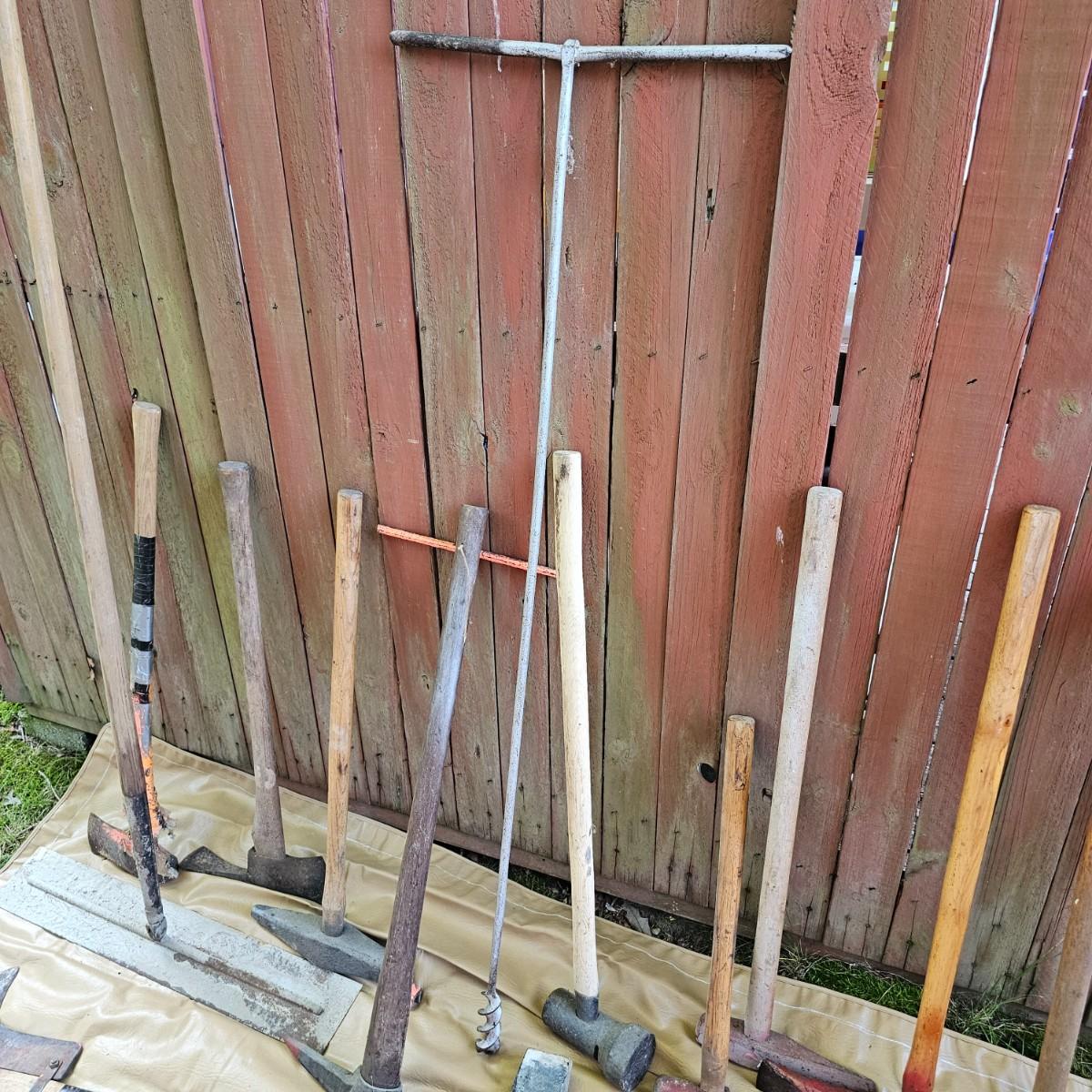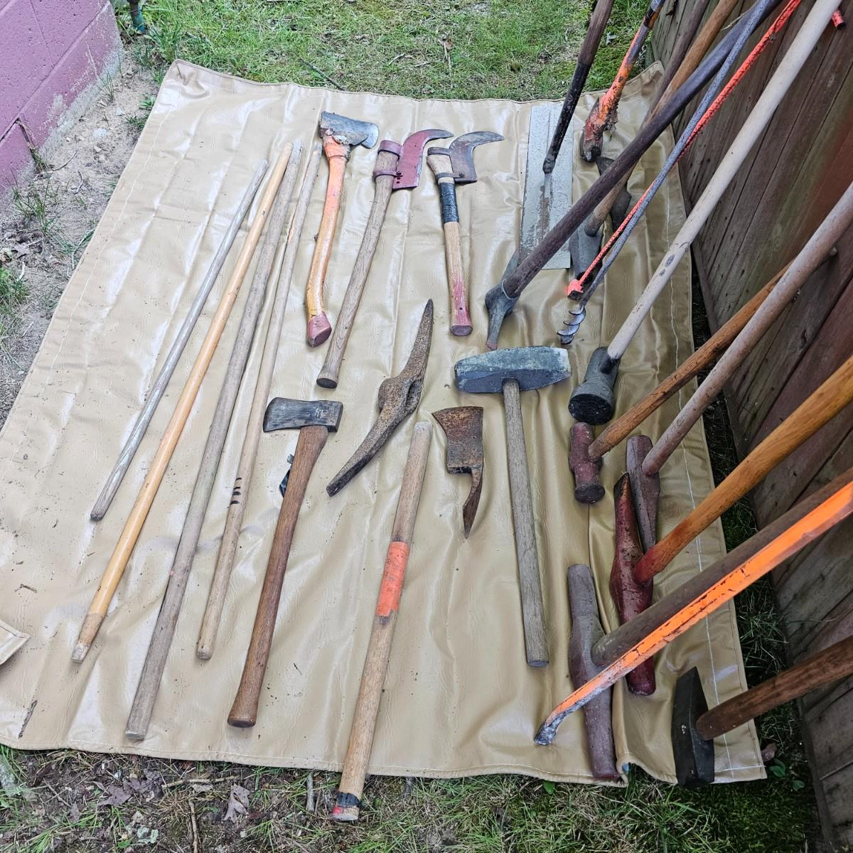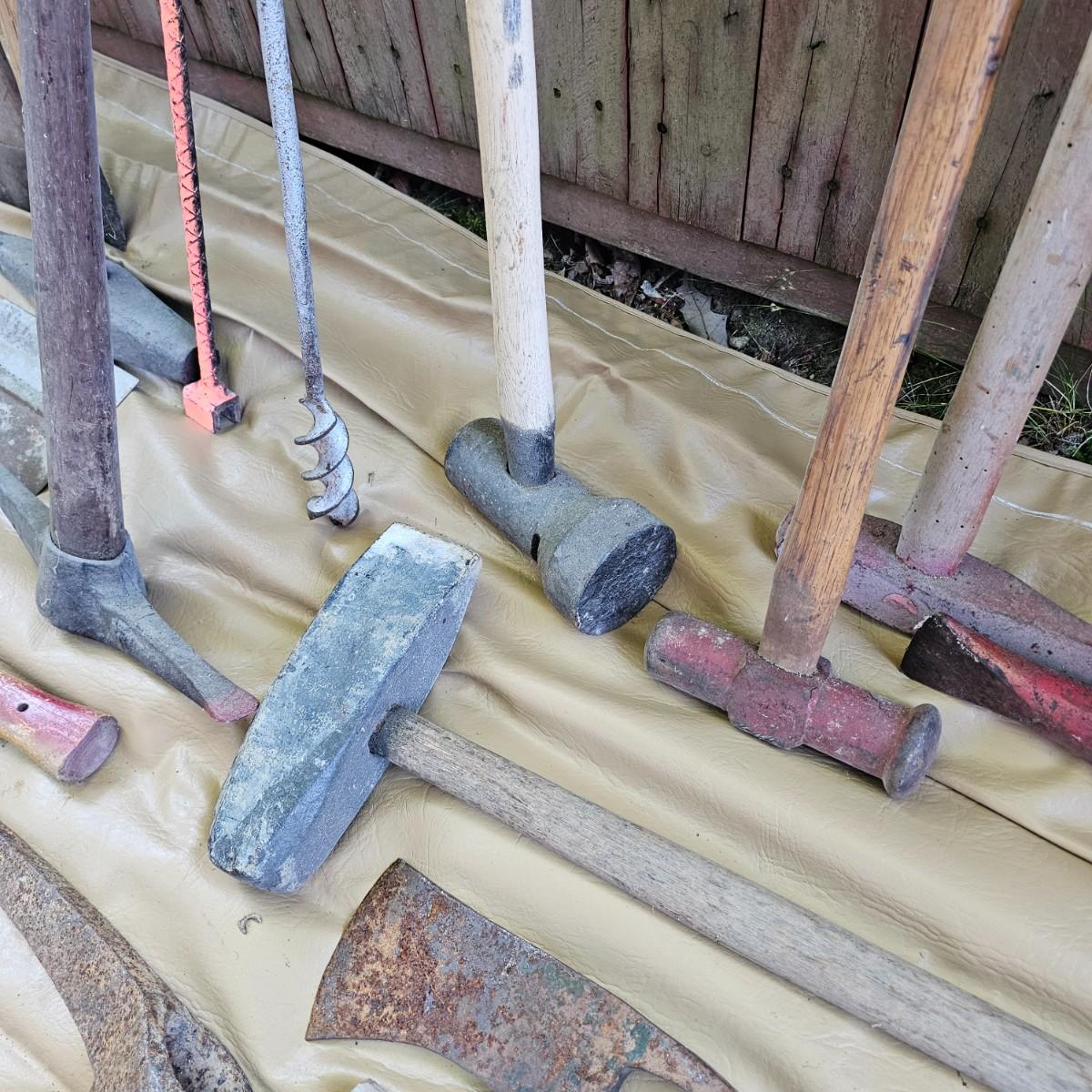 Over two dozen items here, axes, picks, rock tools, extra handles, more. Brush cutters, long handle auger and crow bar. Concrete float is over six feet with handle, mid size tools are 34" - 36", shorter handles 24". Many different heads and shapes, some loose heads as well. See photos for details. Local pickup only.