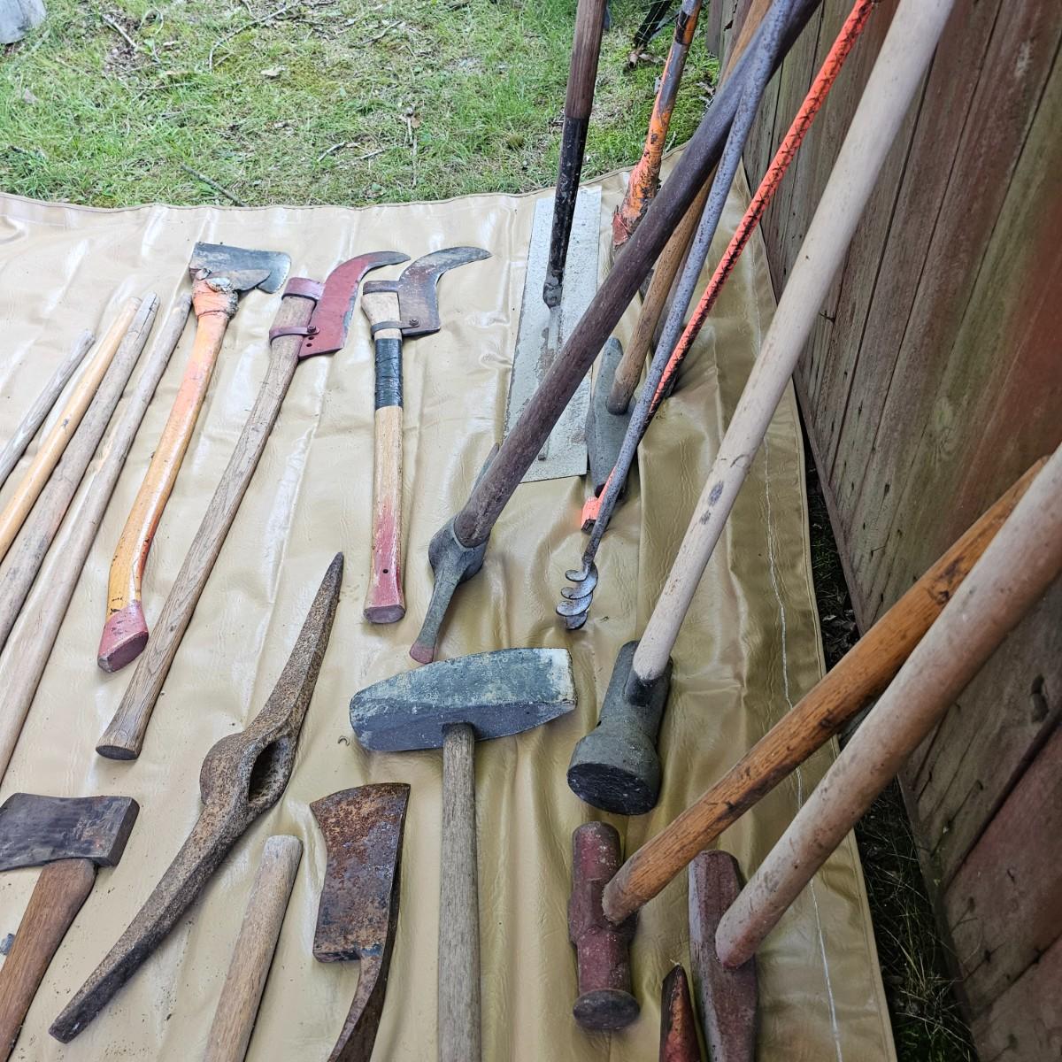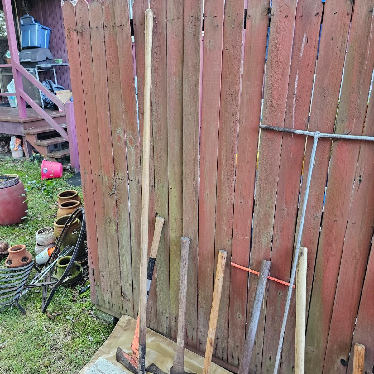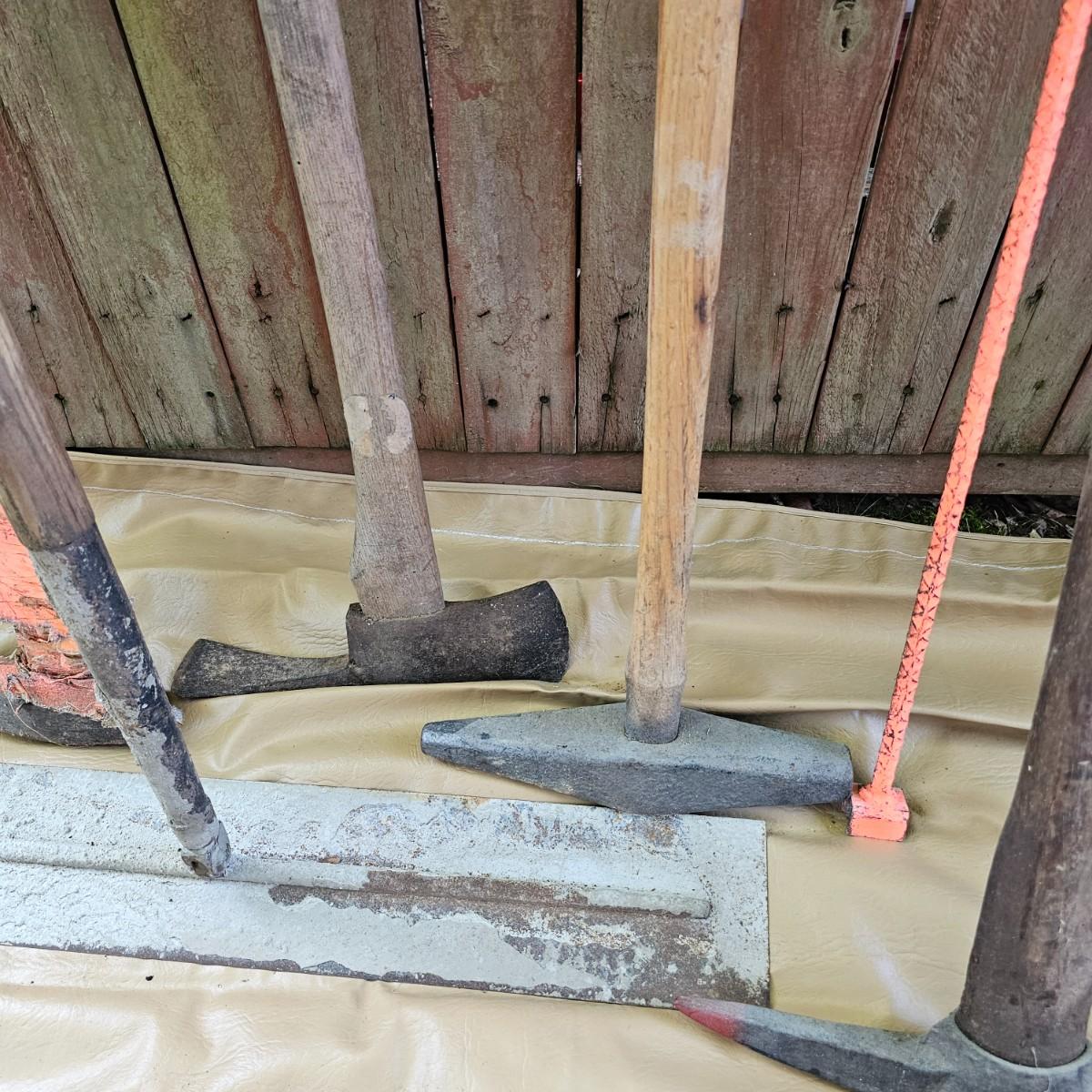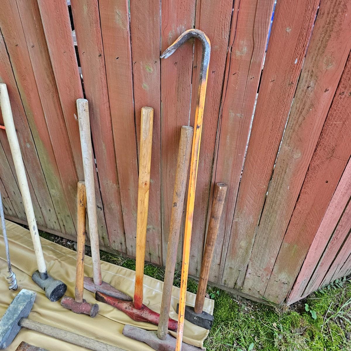 Over two dozen items here, axes, picks, rock tools, extra handles, more. Brush cutters, long handle auger and crow bar. Concrete float is over six feet with handle, mid size tools are 34" - 36", shorter handles 24". Many different heads and shapes, some loose heads as well. See photos for details. Local pickup only.