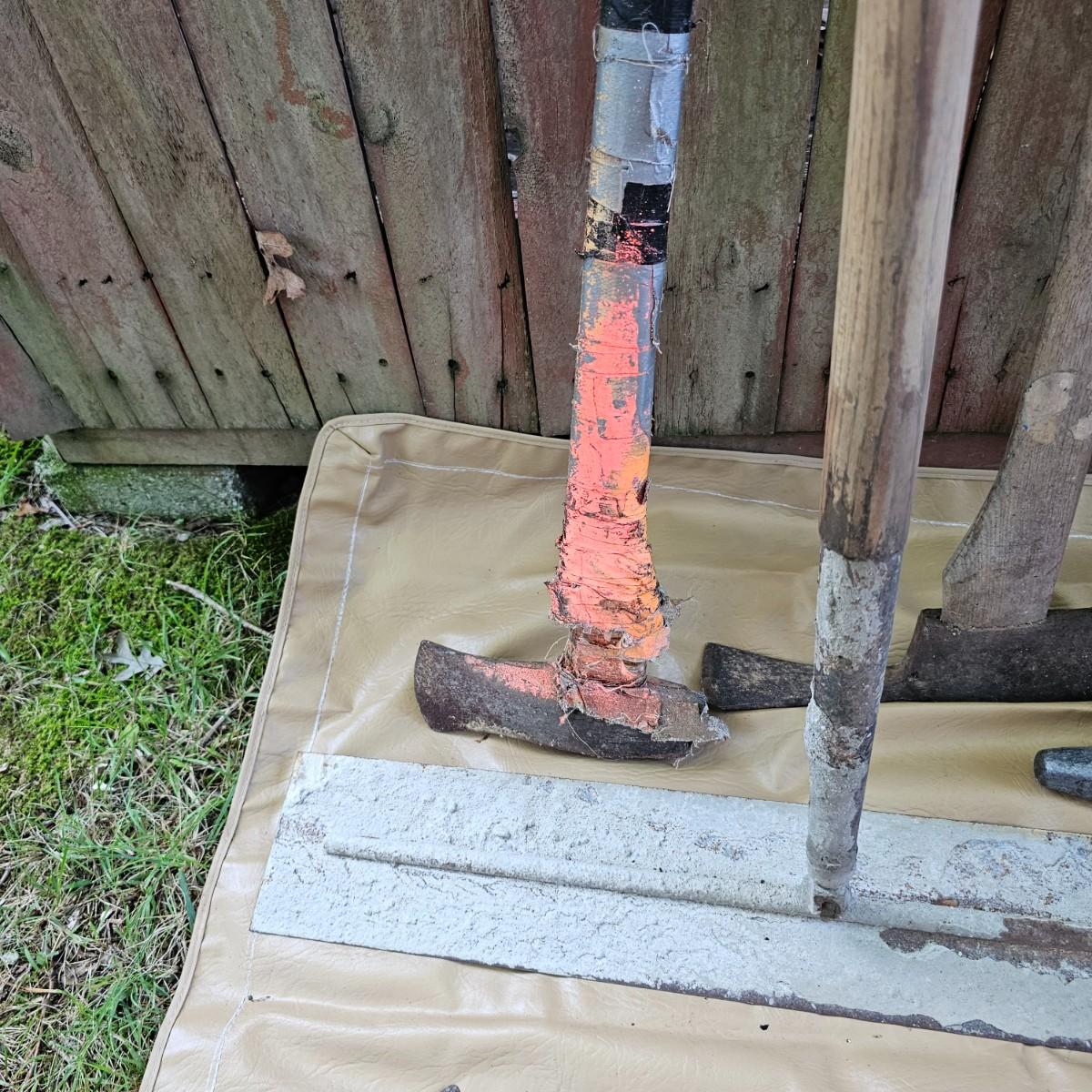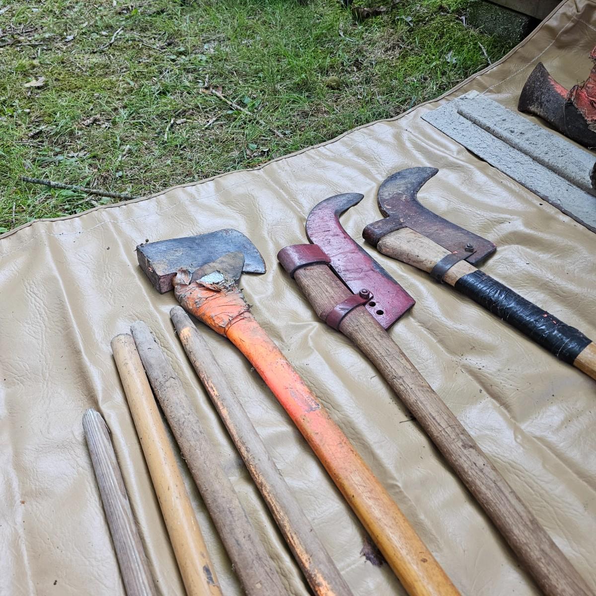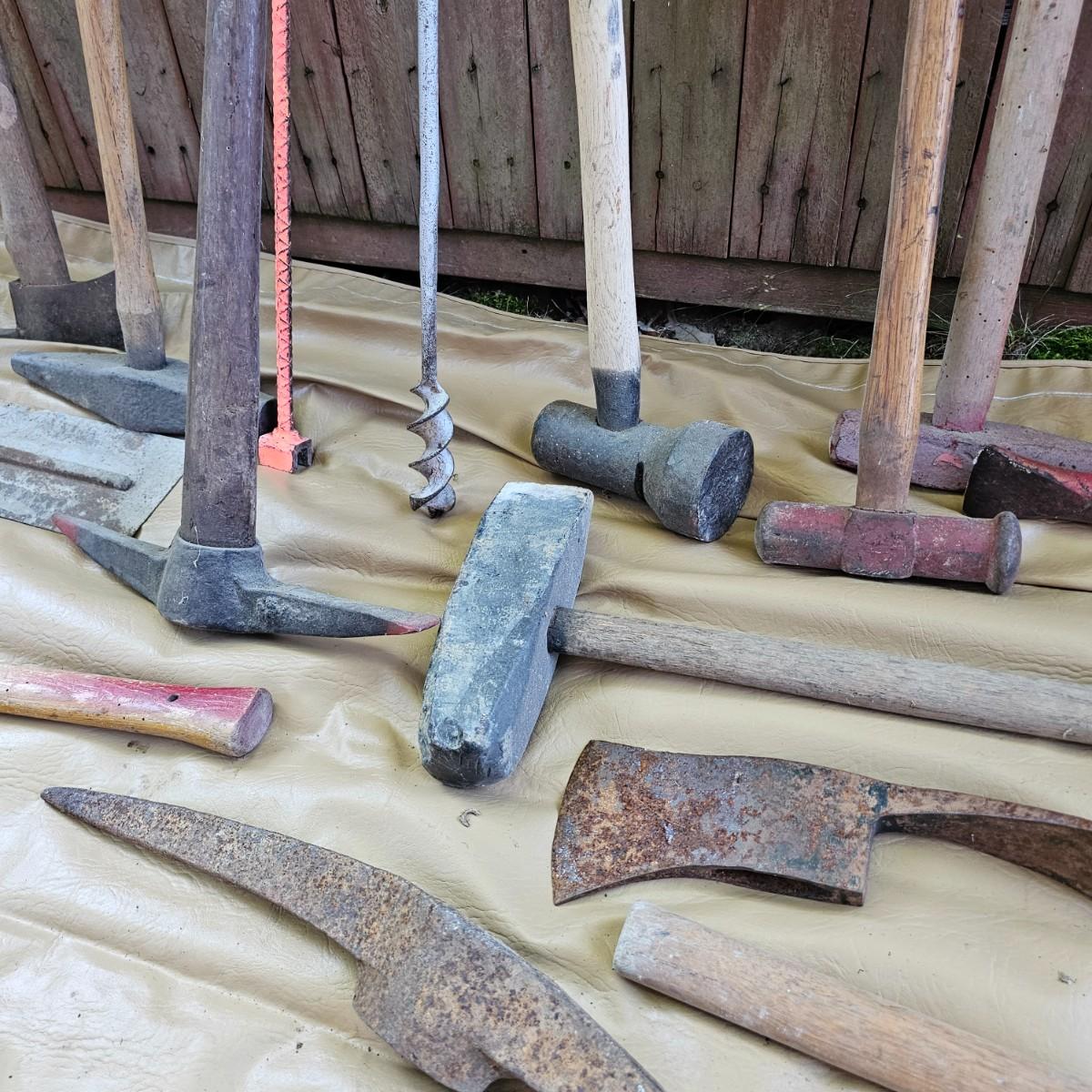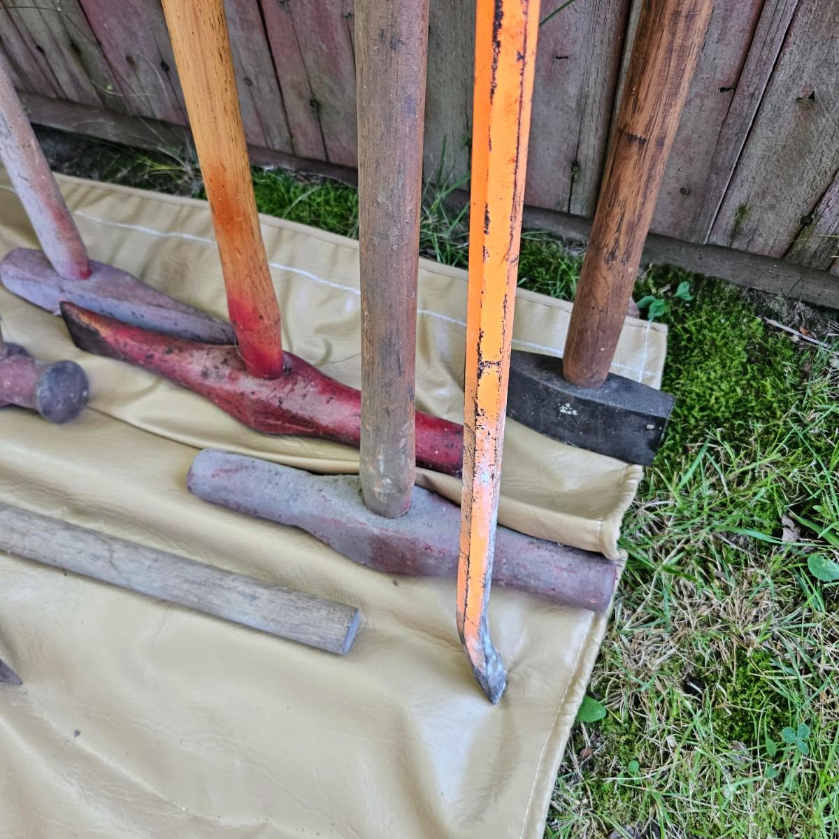 Over two dozen items here, axes, picks, rock tools, extra handles, more. Brush cutters, long handle auger and crow bar. Concrete float is over six feet with handle, mid size tools are 34" - 36", shorter handles 24". Many different heads and shapes, some loose heads as well. See photos for details. Local pickup only.