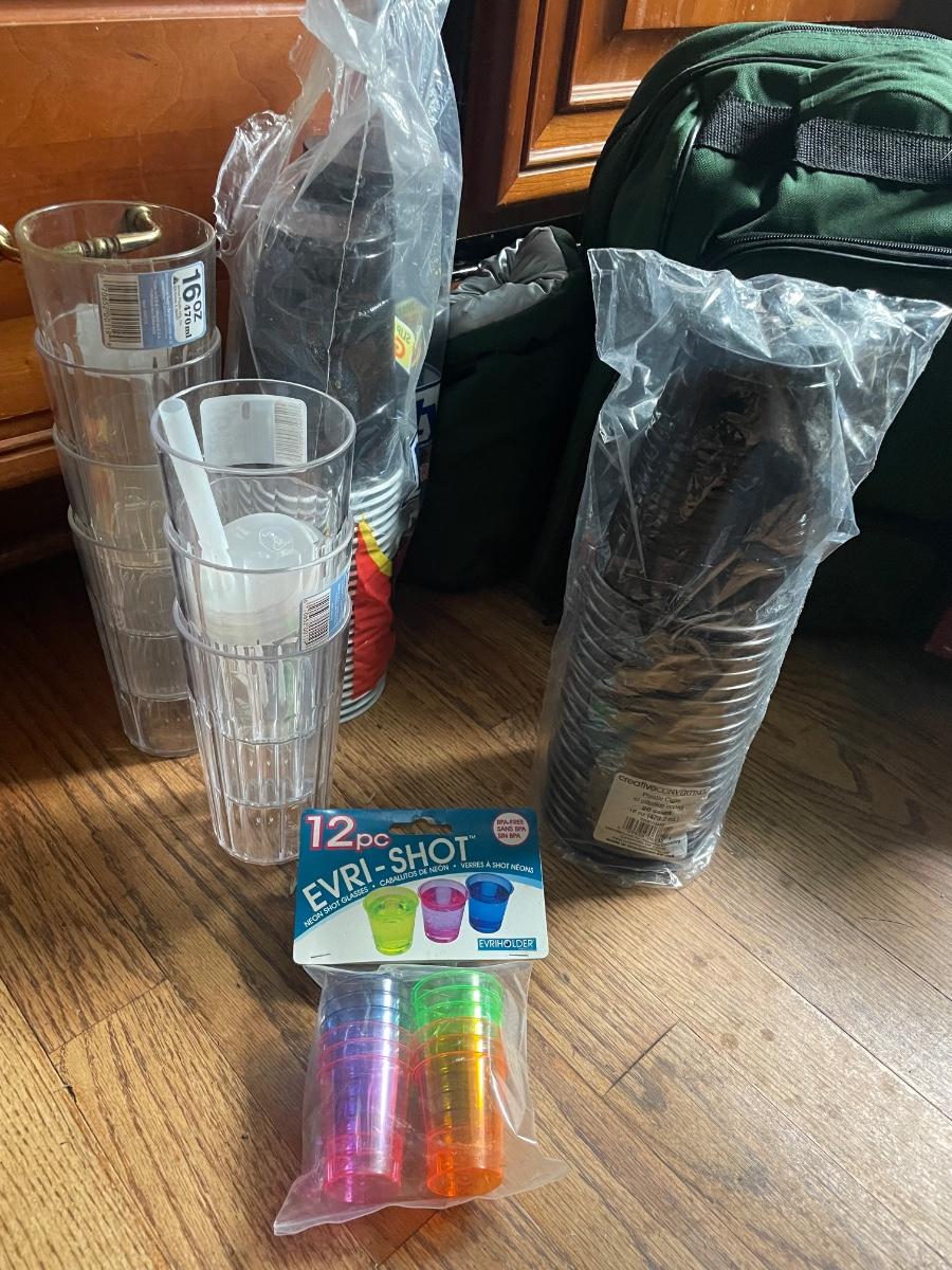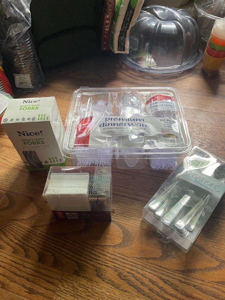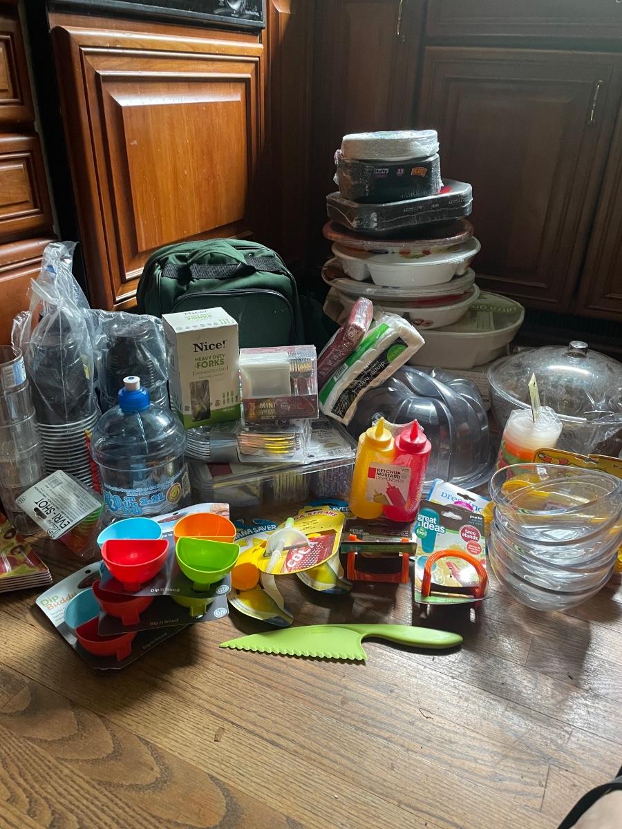 This huge lot has a canvas picnic backpack for two which appears to be new but has a small stain, see image. There are lots of plastic disposable plates, cups and cutlery plus lots more picnic essentials.