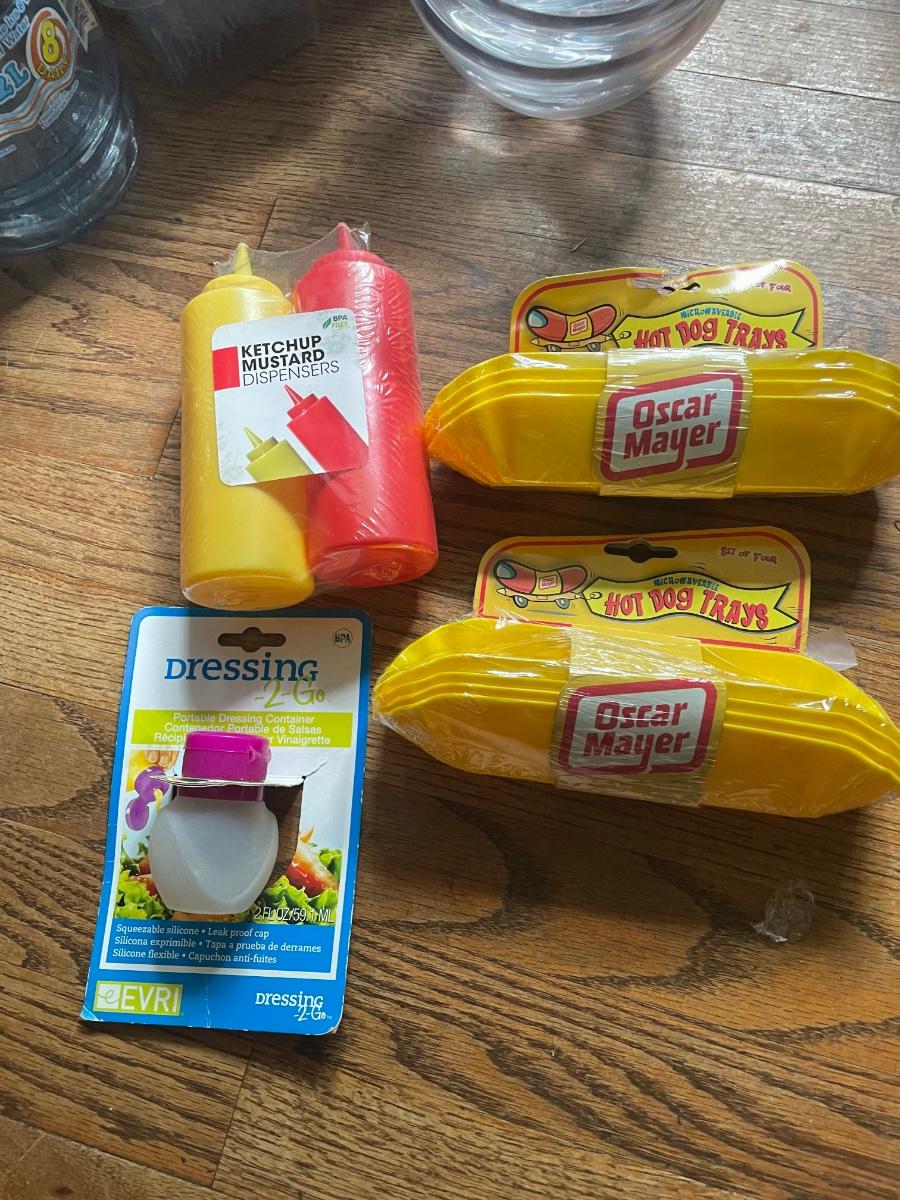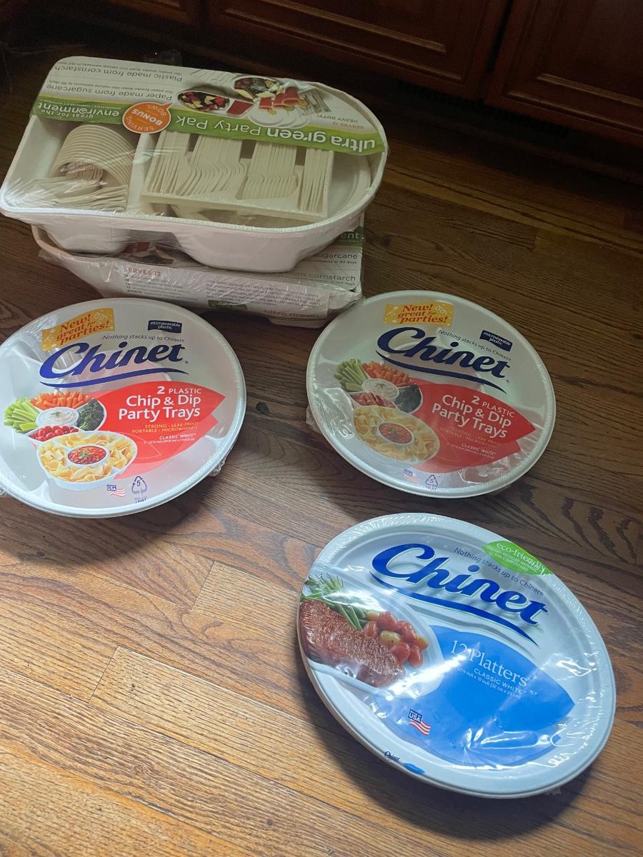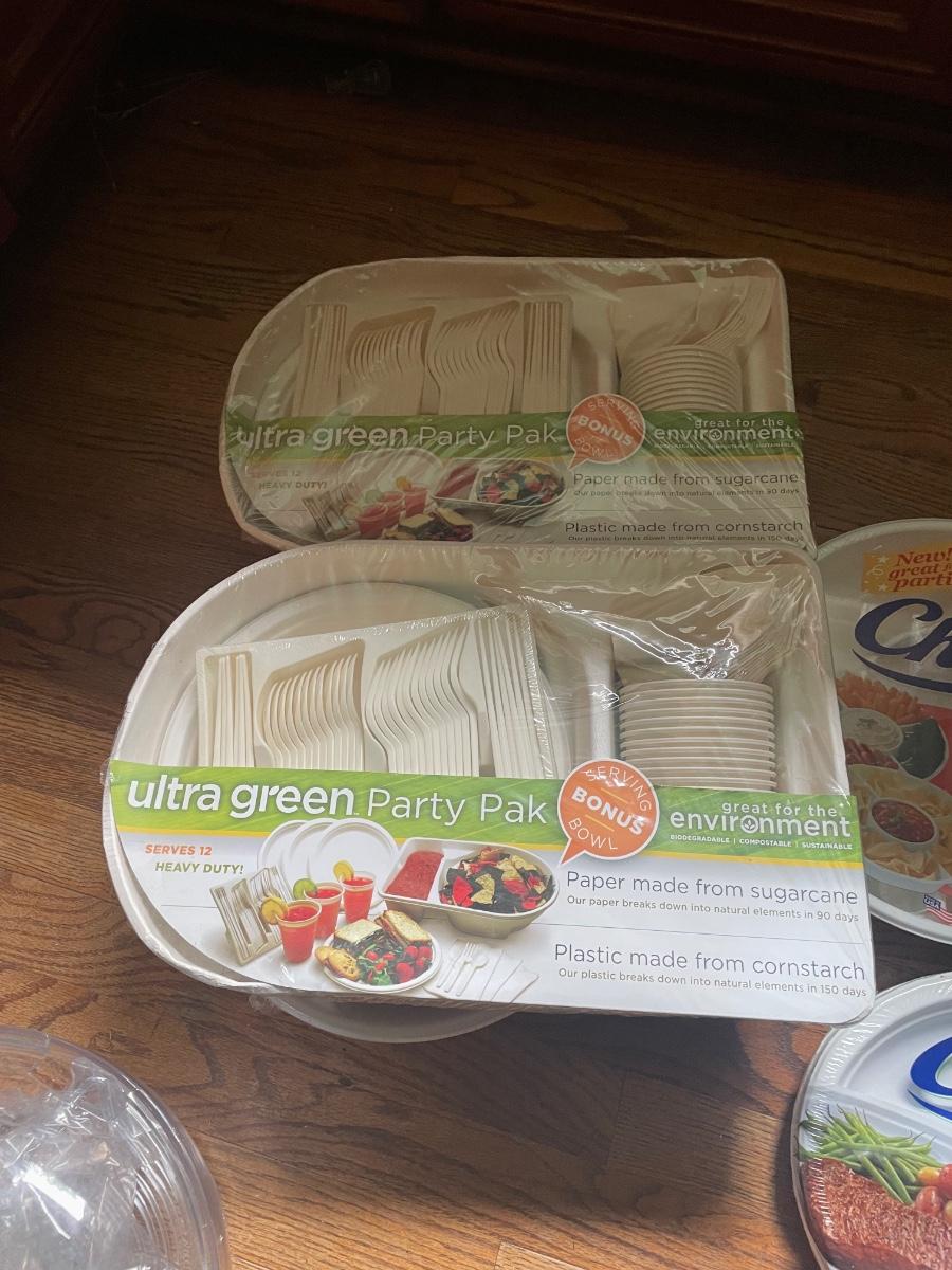 This huge lot has a canvas picnic backpack for two which appears to be new but has a small stain, see image. There are lots of plastic disposable plates, cups and cutlery plus lots more picnic essentials.