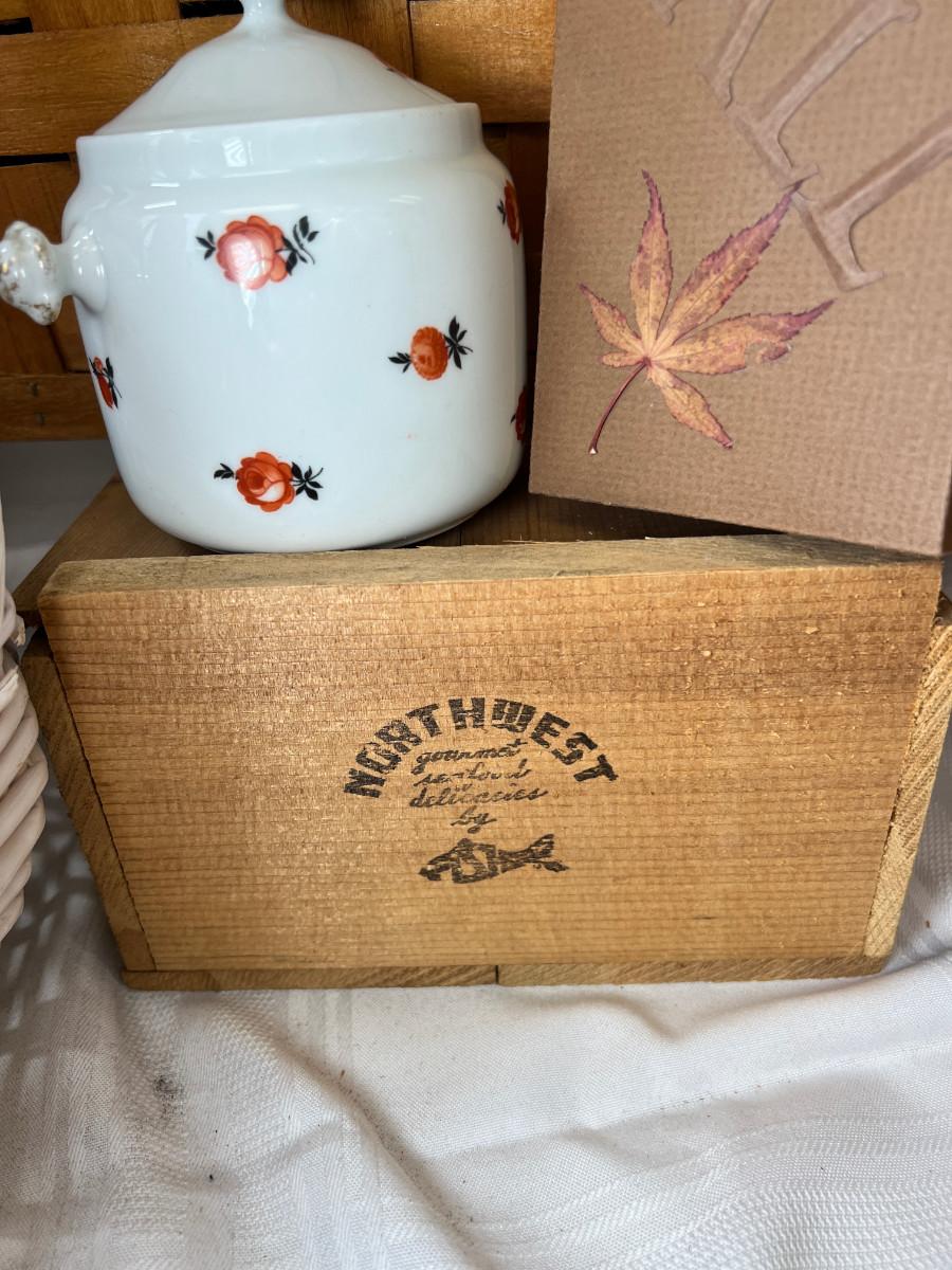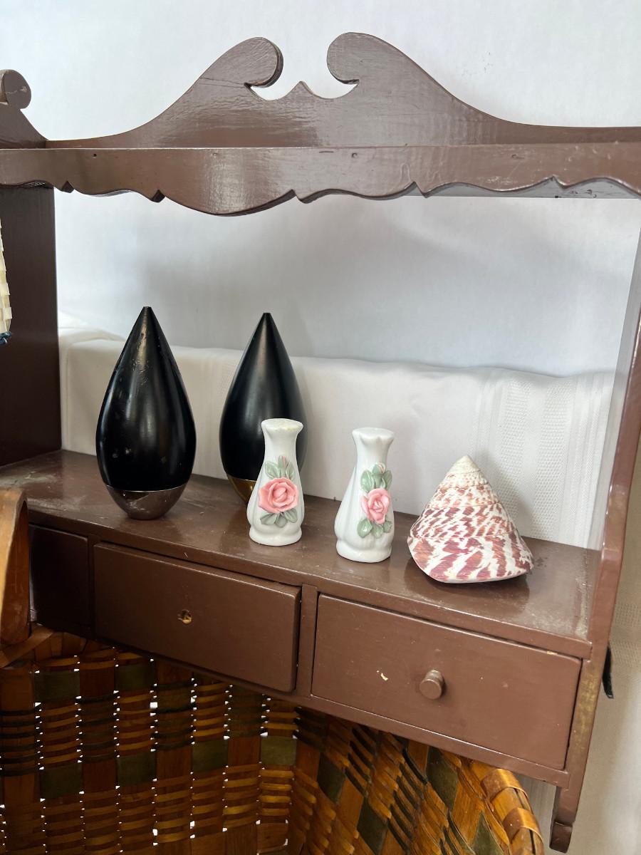 Wooden hanging shelf 3 drawer unit ( one know off) Picnic basket with lid and handles, woven bike basket salt and pepper shakers, black sculptural object. "Fall" handmade box, Wooden crate. All baskets in good condition. Kitchen window one piece really nice for a window you need light and privacy.