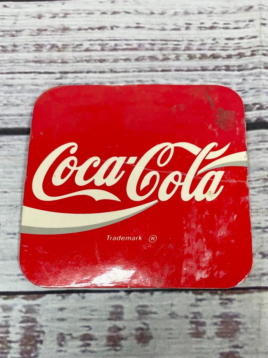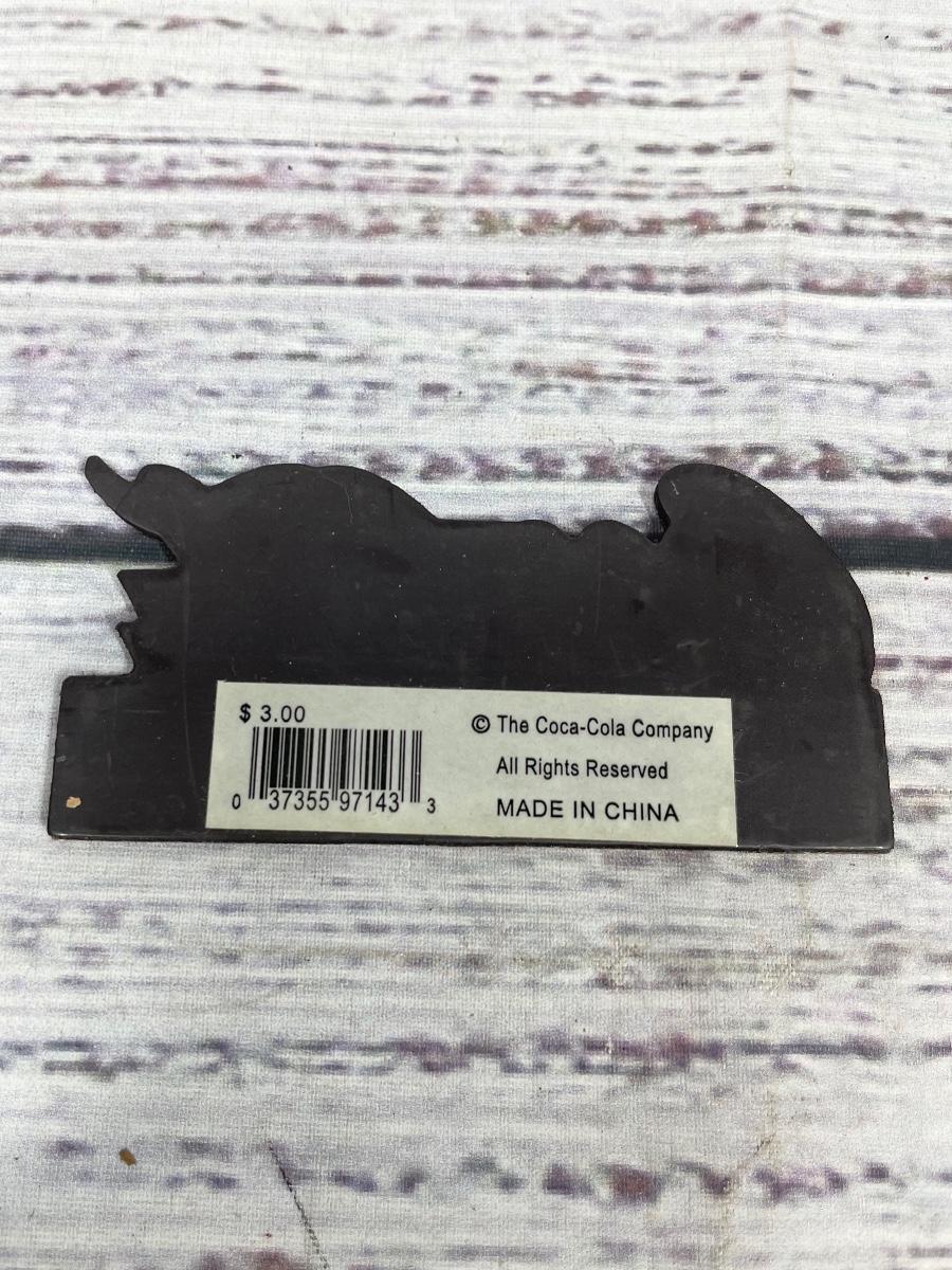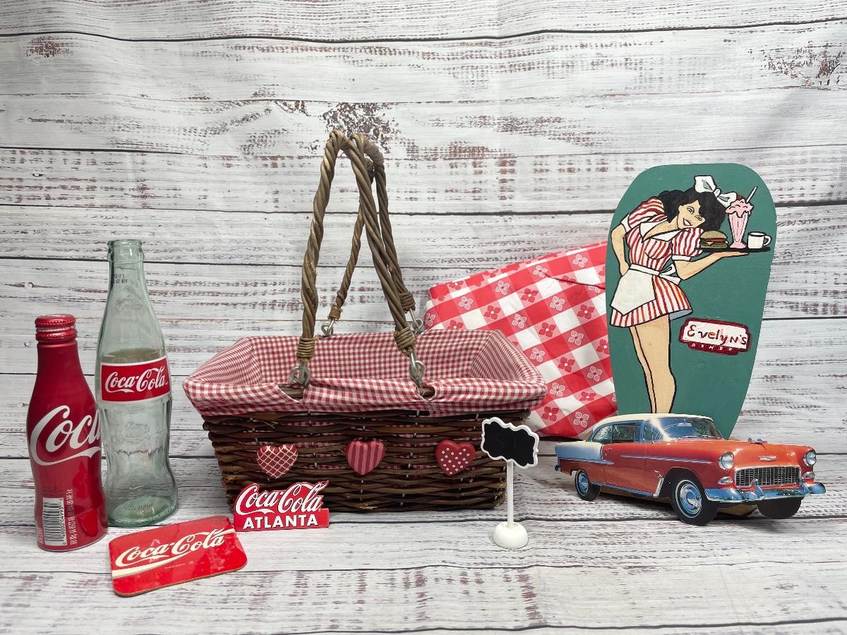 This set includes: one picnic basket, one table cloth, a paper towel holder, two empty Coca-Cola Bottles, a Coca-Cola Magnet and coaster, mini chalk board, and a car shaped card. All items are in decent condition. The table cloth has some discoloration on it.