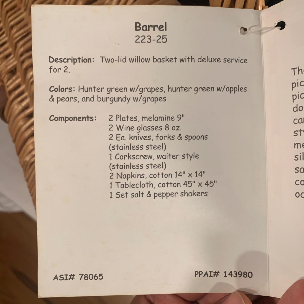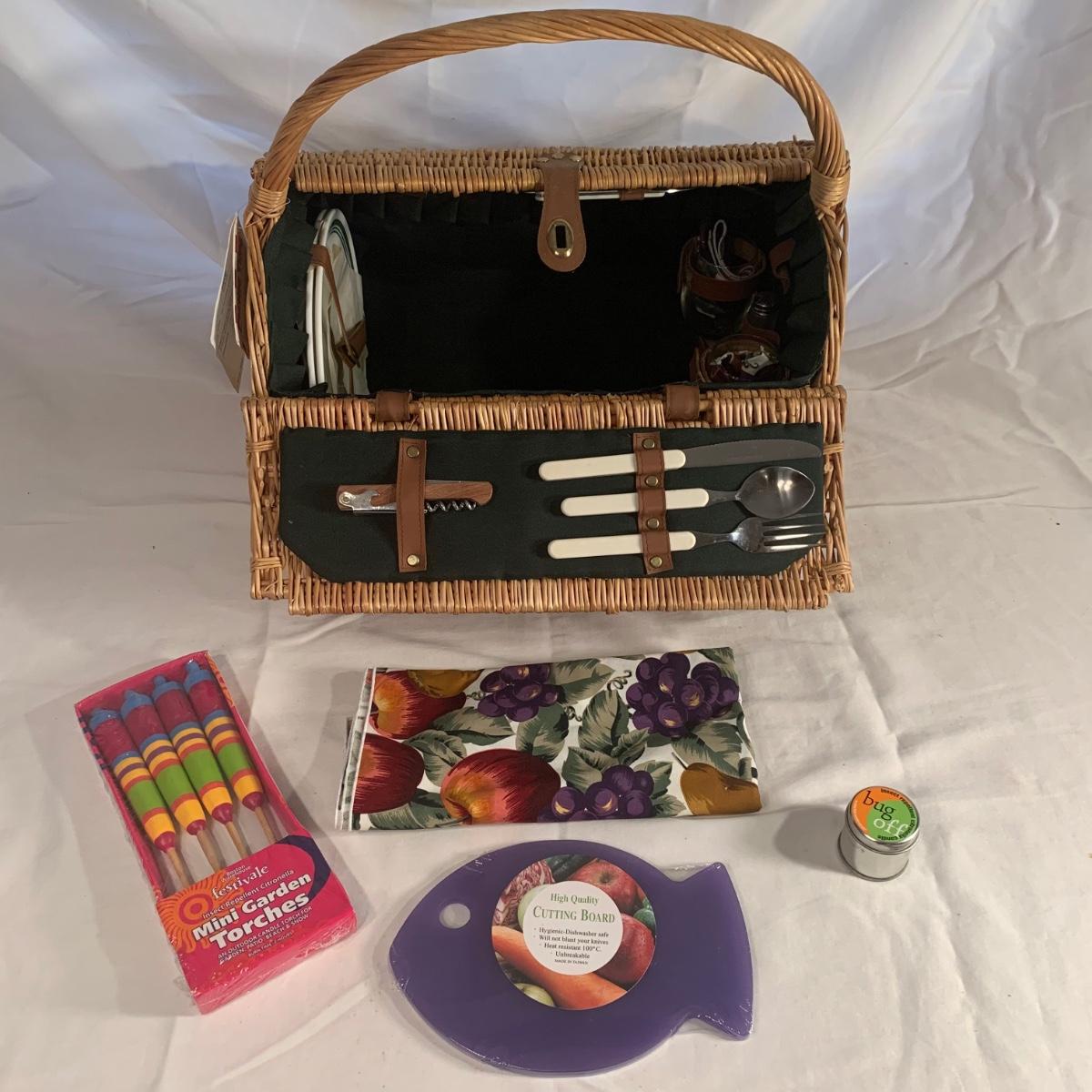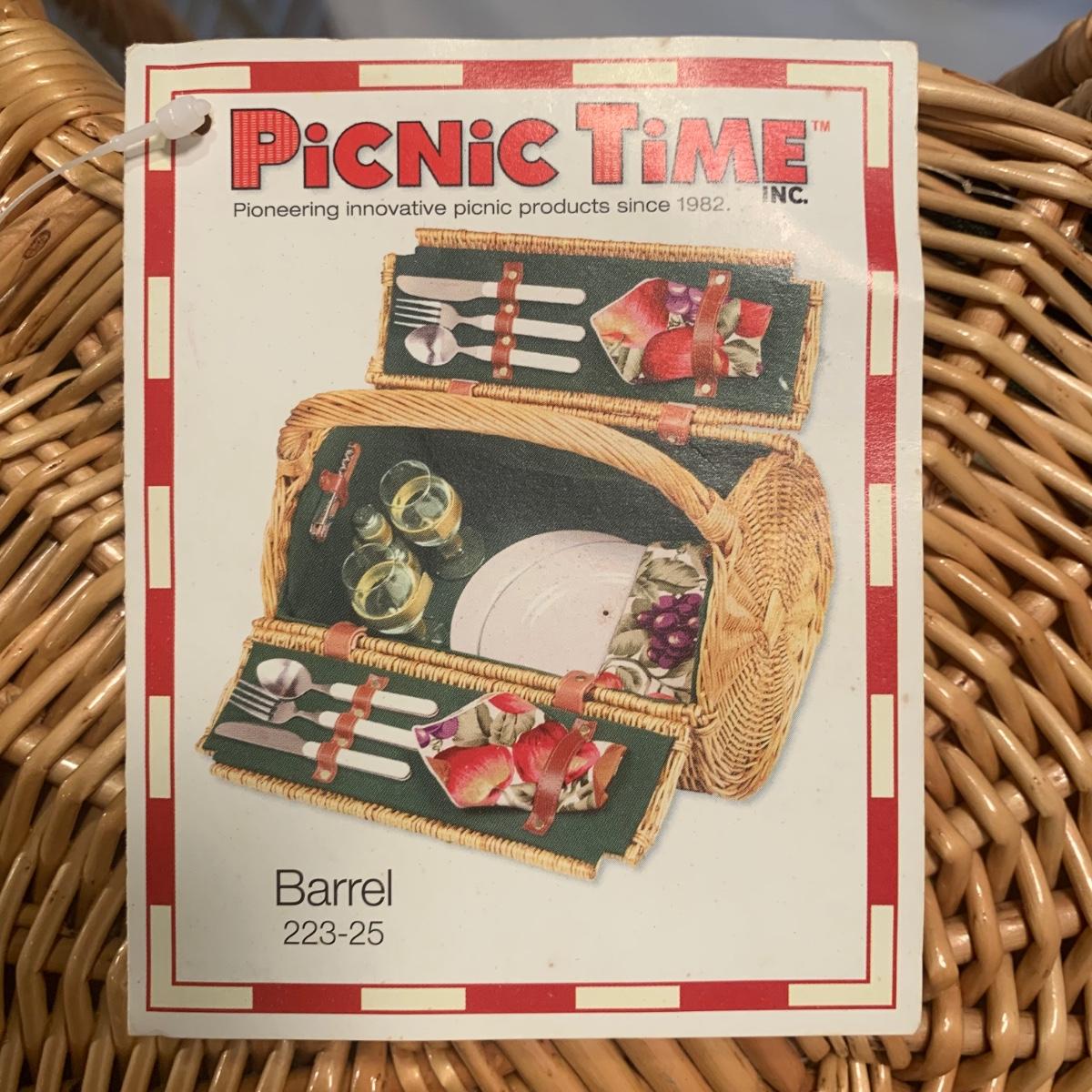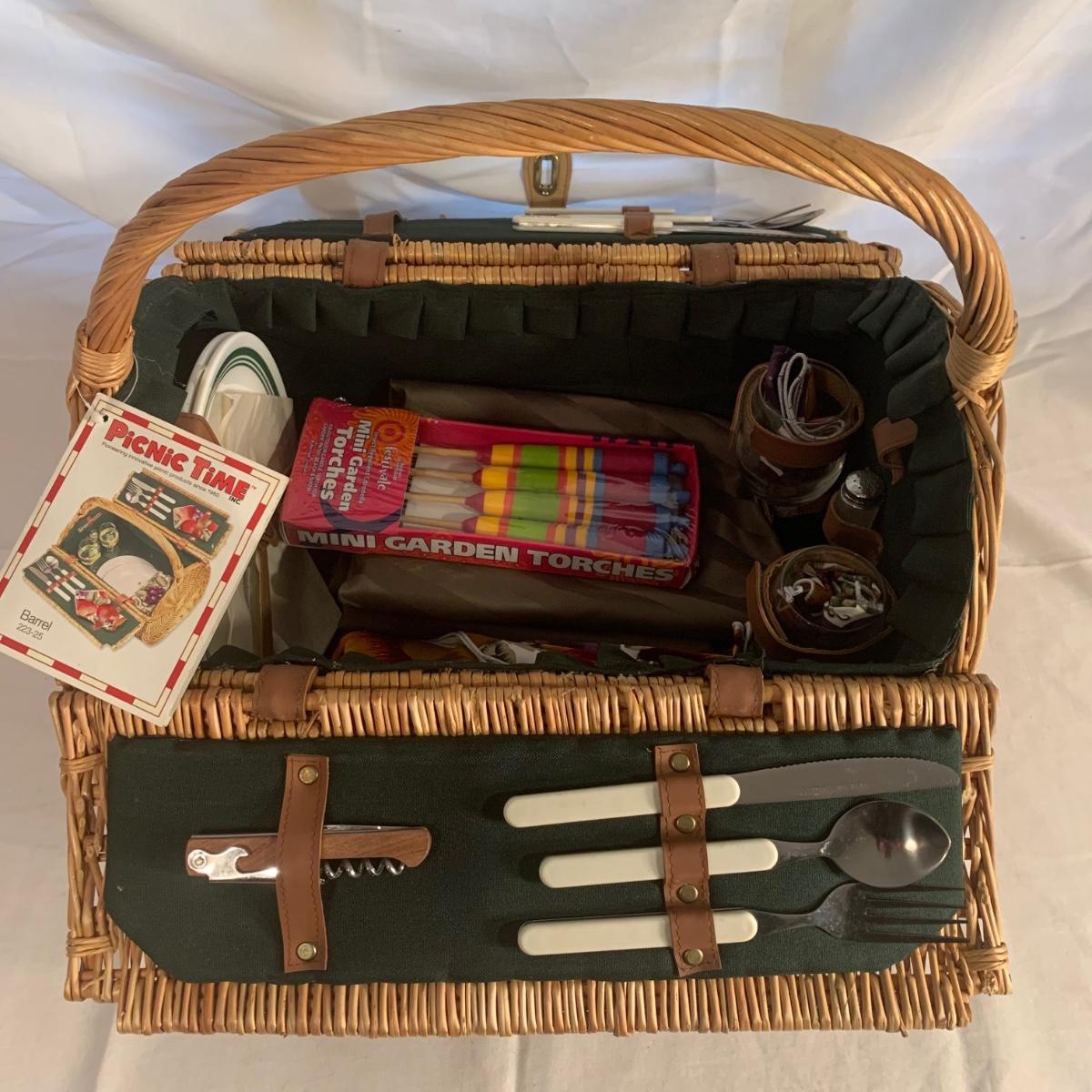 New, unused Barrel style Picnic Time Inc. picnic basket. This two lid-style basket includes place settings for two. Includes two 9” plates, two wine glasses, two flatware sets, one wine corkscrew, two napkins, one tablecloth, and salt & pepper shakers. Lot also includes an additional table cloth, bug repellent candles, and a cutting board. You’ll find two all-season blankets. Perfect for picnics, concerts, and ball games; they are both water resistant