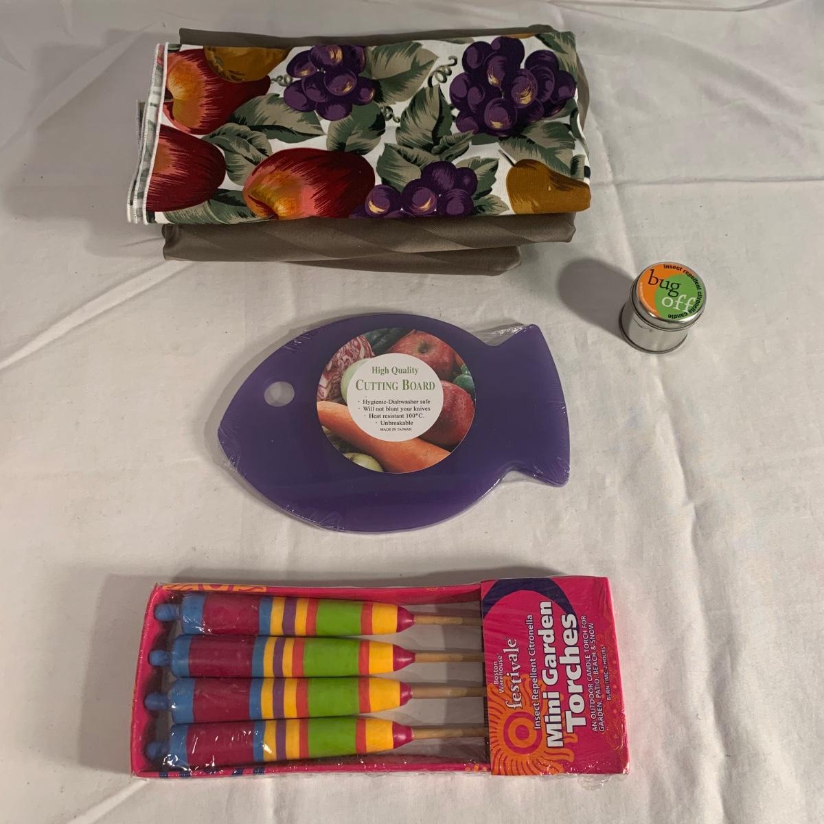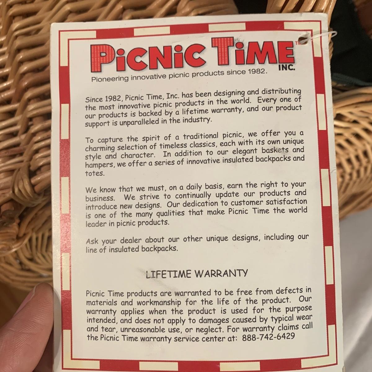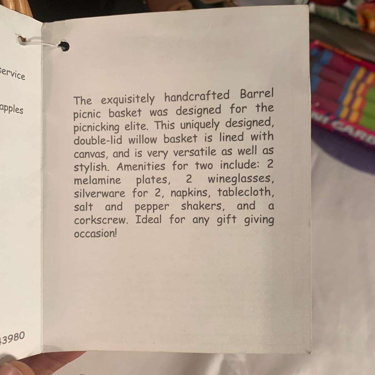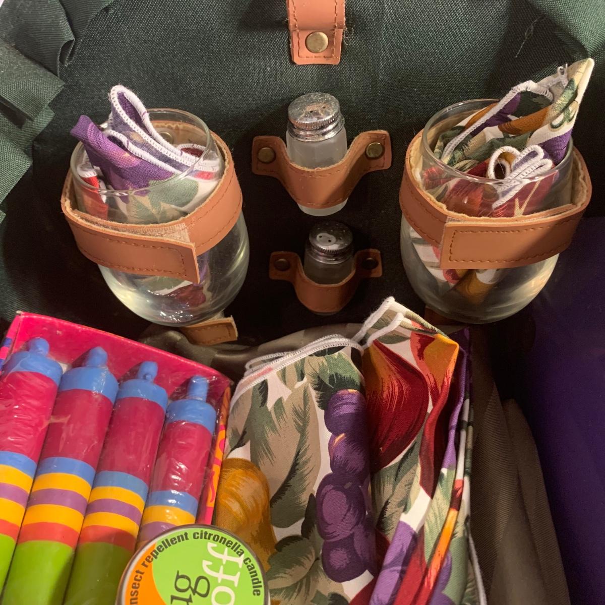 New, unused Barrel style Picnic Time Inc. picnic basket. This two lid-style basket includes place settings for two. Includes two 9” plates, two wine glasses, two flatware sets, one wine corkscrew, two napkins, one tablecloth, and salt & pepper shakers. Lot also includes an additional table cloth, bug repellent candles, and a cutting board. You’ll find two all-season blankets. Perfect for picnics, concerts, and ball games; they are both water resistant