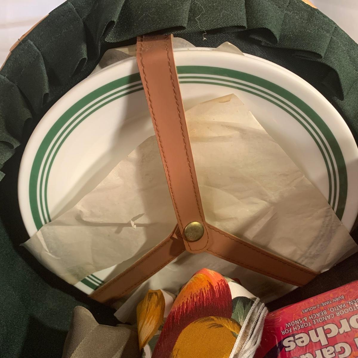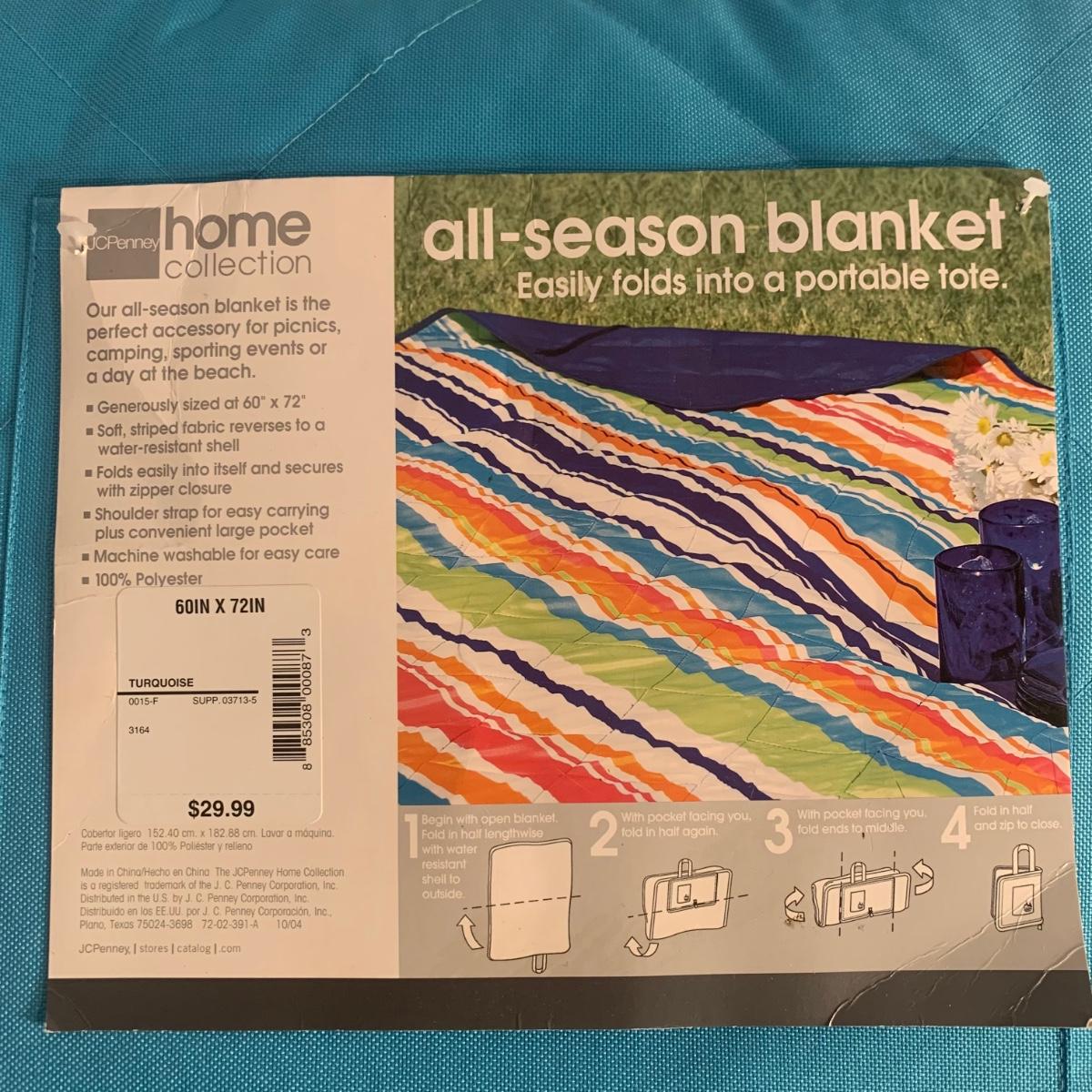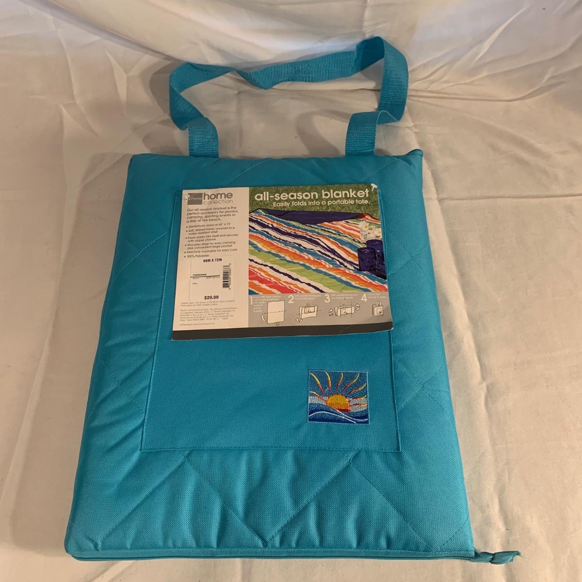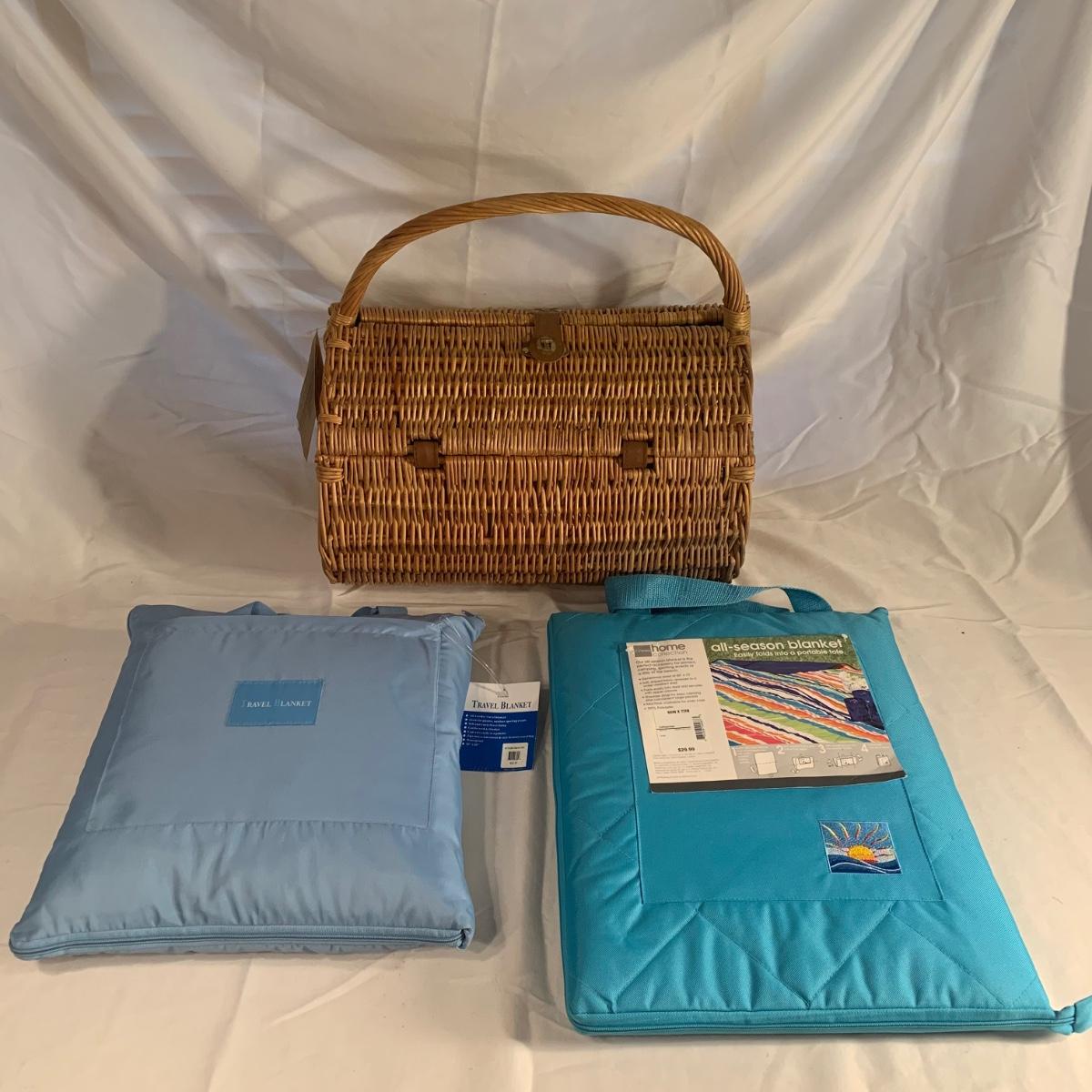 Picnic basket measures, 17”L x 13”W x 18”H. Turquoise blanket measures, 60”L x 72”W and the blue blanket measures, 58”L x 80”W. Picnic basket has been opened, but never used. Blankets are unopened with tags.