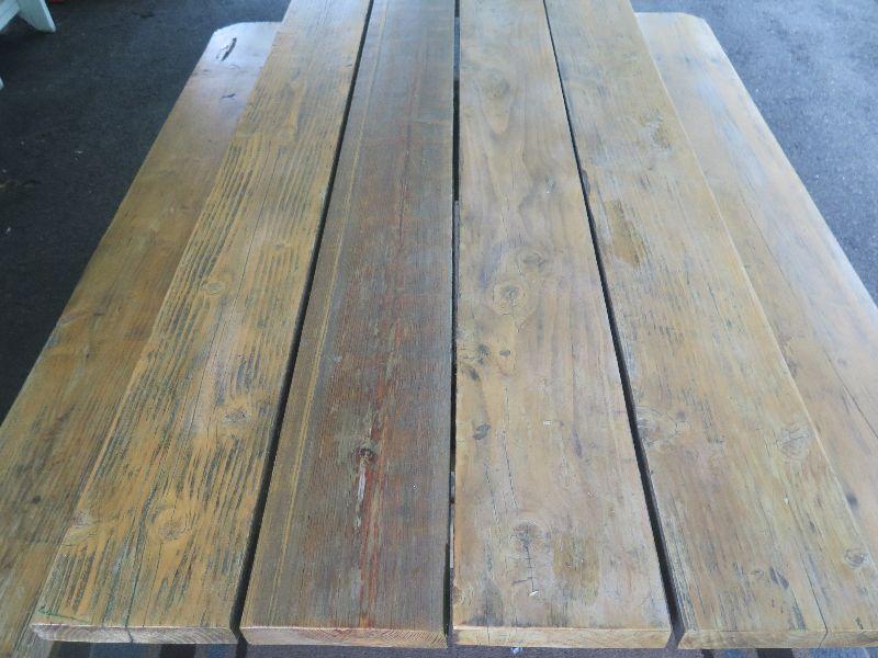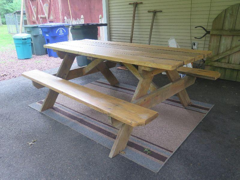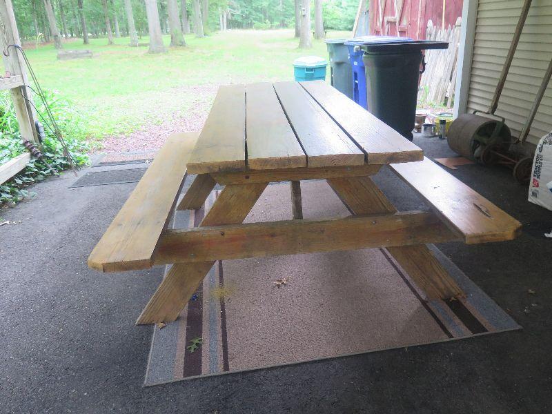 Very well made wooden picnic table with attached benches. Bring tools and help to move. Very heavy.