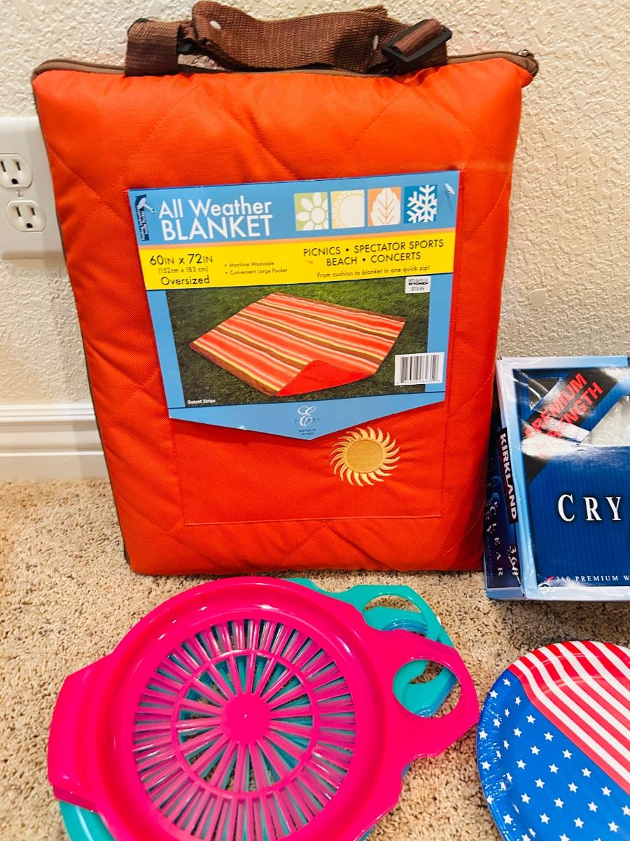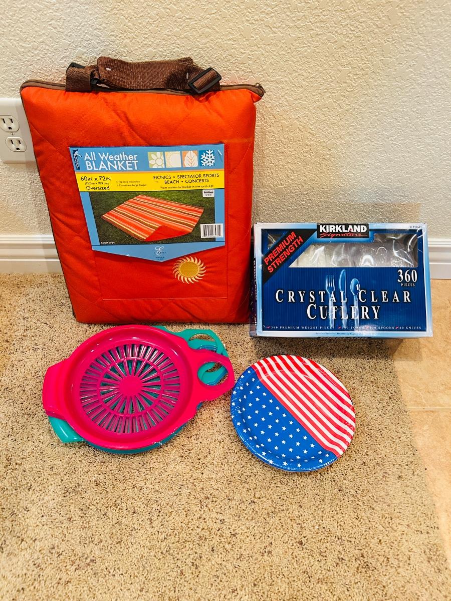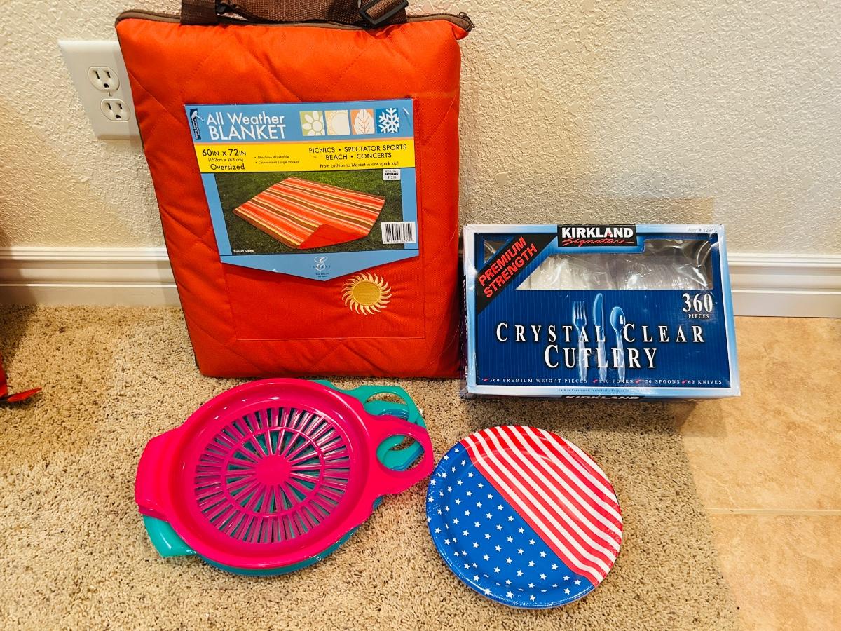 PICNICKING WITH THIS ALL WEATHER BLANKET PAPER PLATE HOLDERS, NAPKINS AND DISPOSABLE CUTLERY