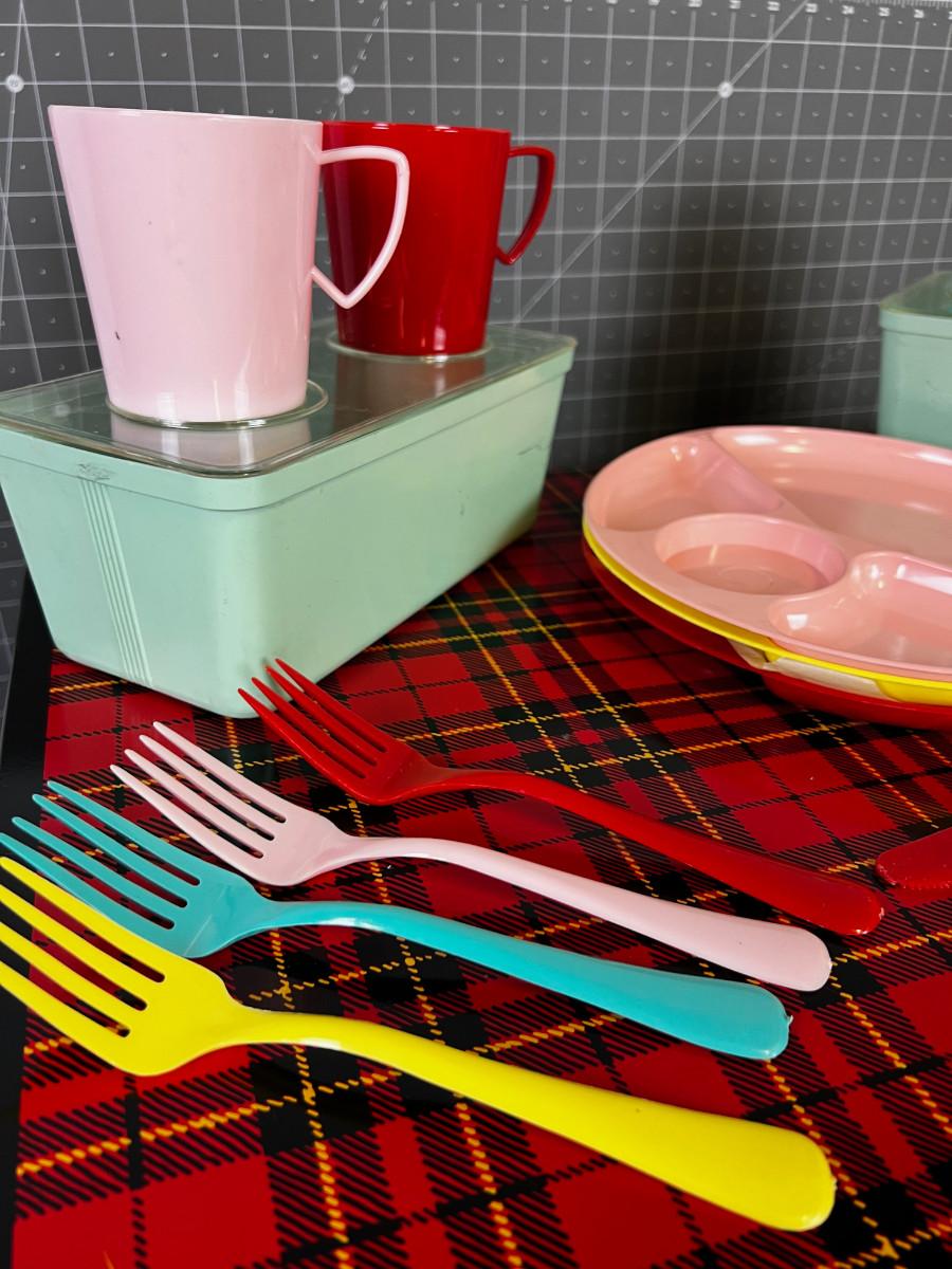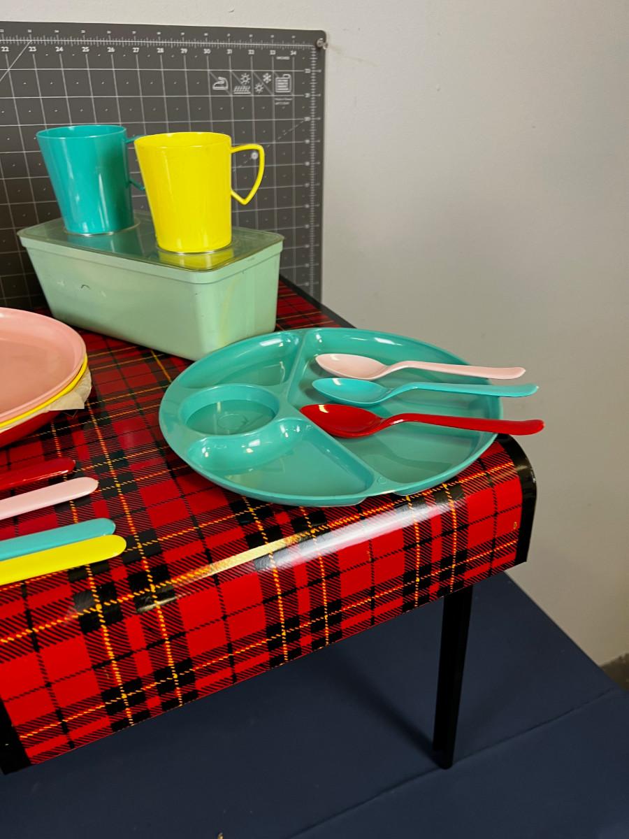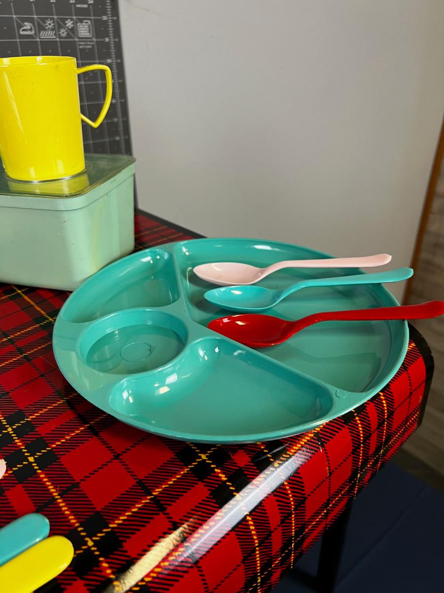 Complete except for One Spoon. Crack in the Blue Plate, however its plastic. DARLING!