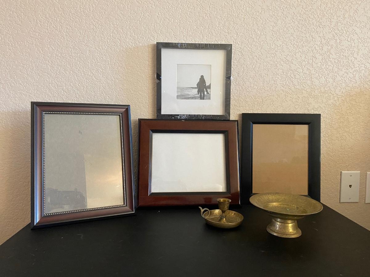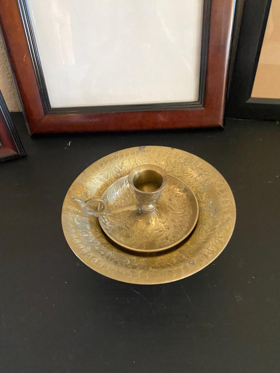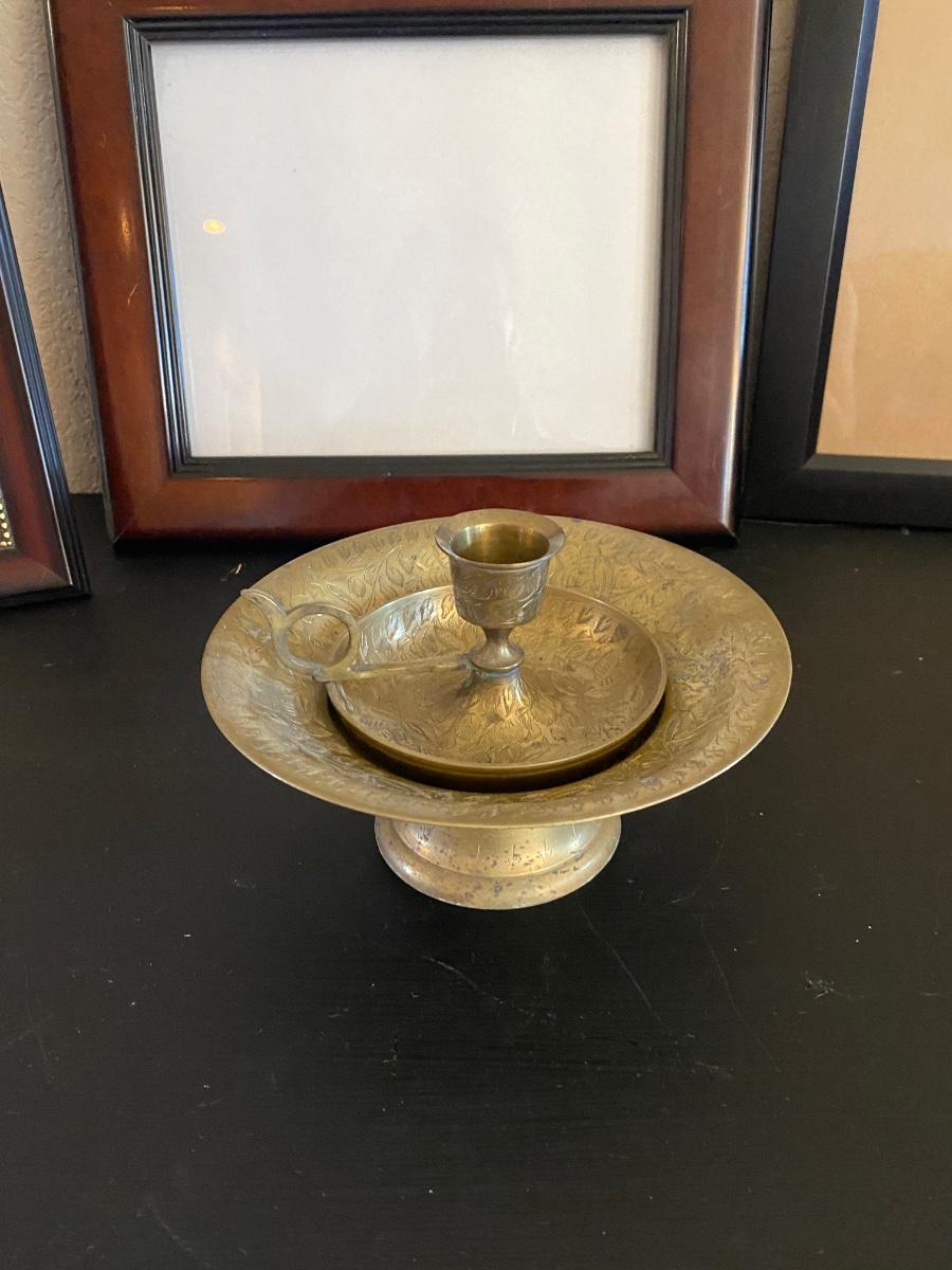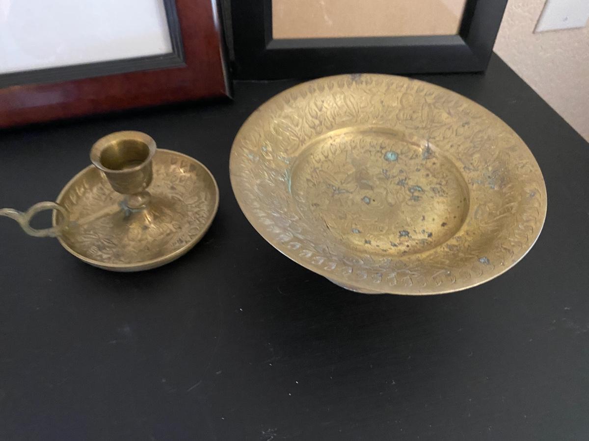 PICTURE DRAMES AND MATCHING BRASS CANDLEHOLDER & PEDESTAL DISH