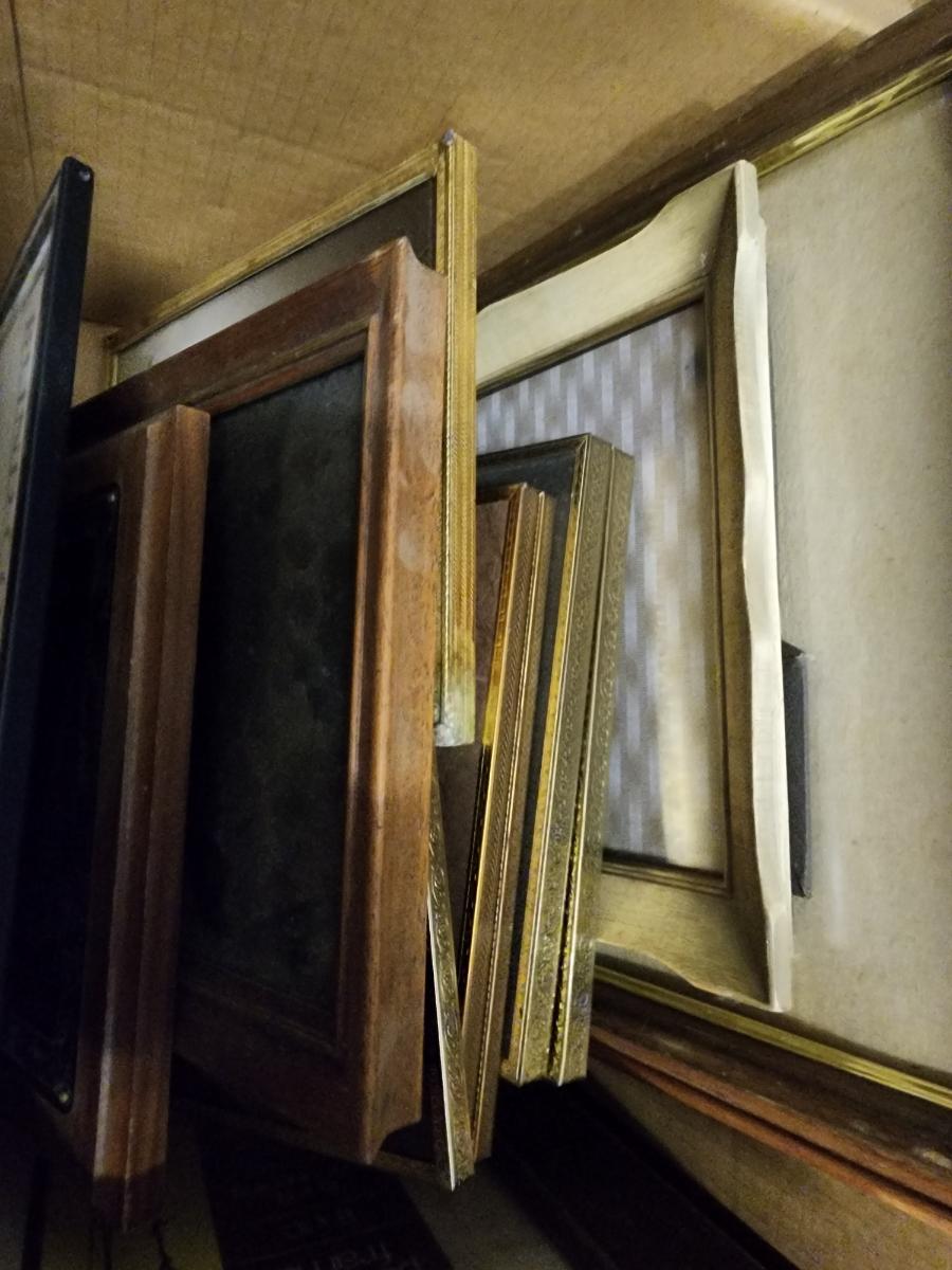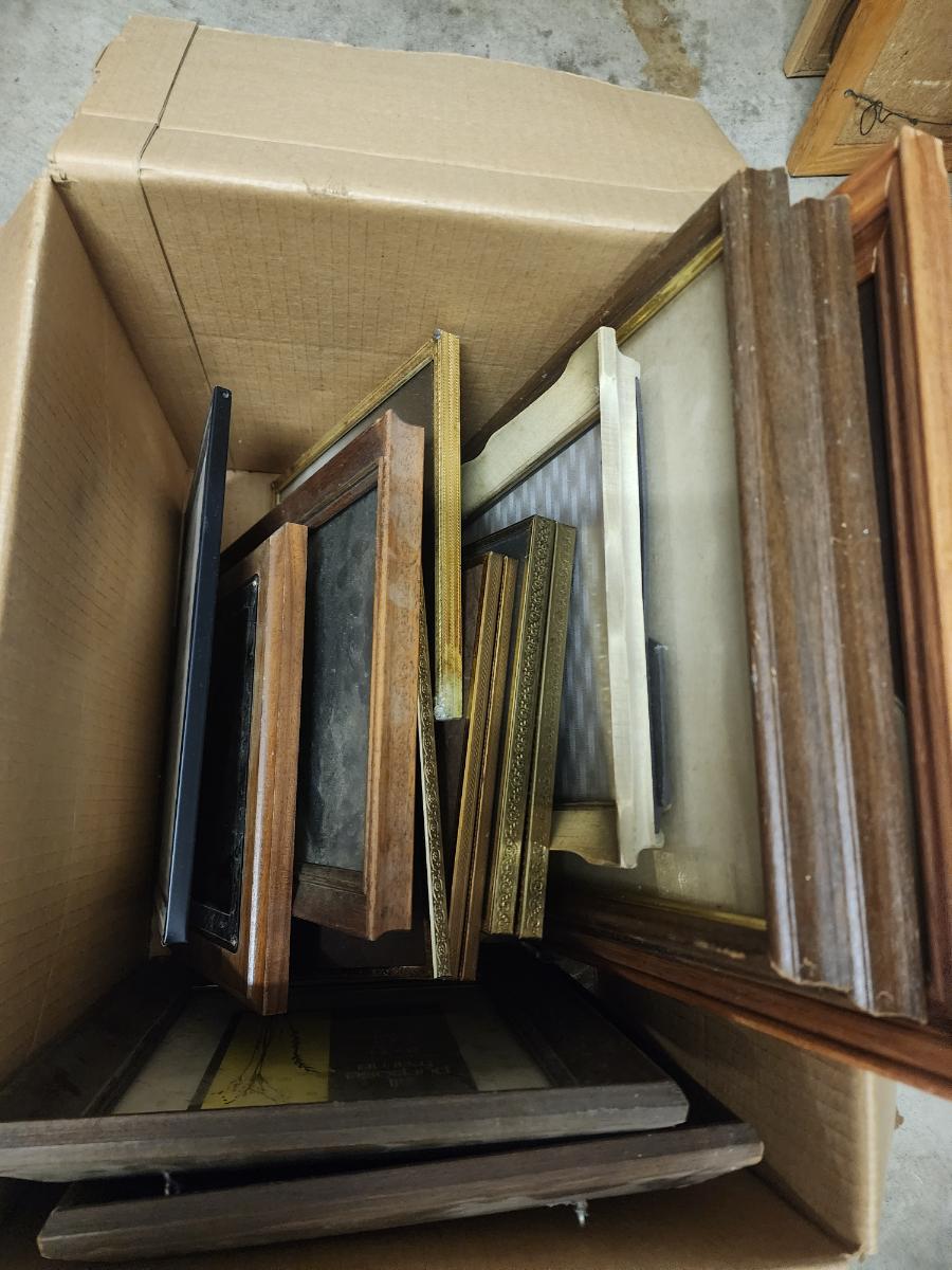 Box of assorted picture frames and pictures of various sizes, 2 cork boards