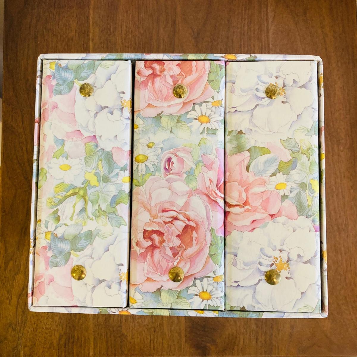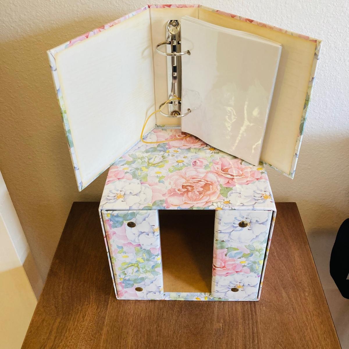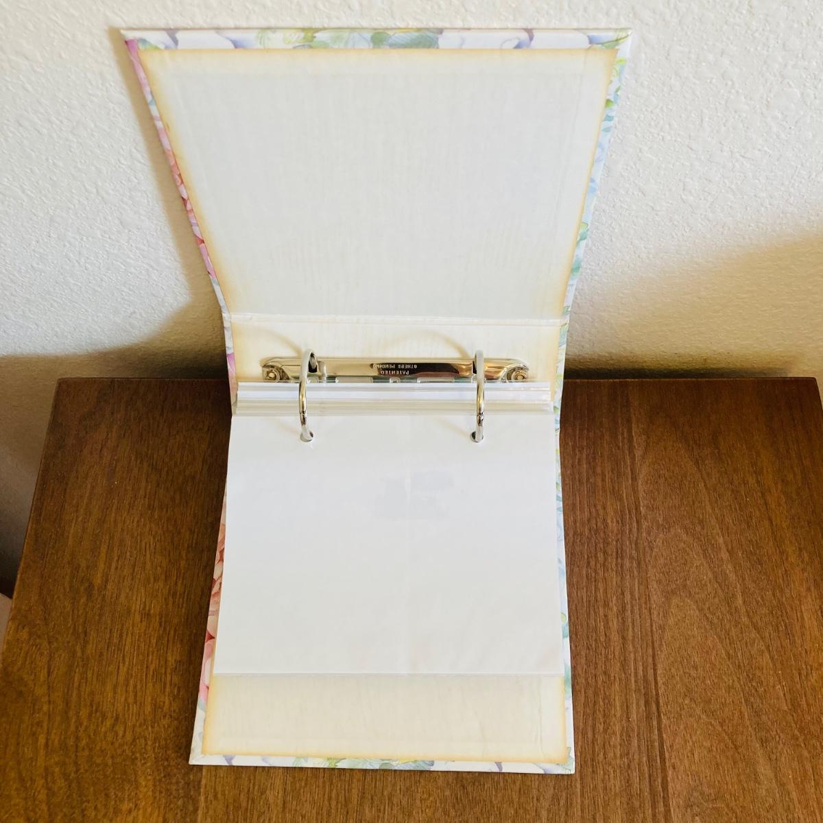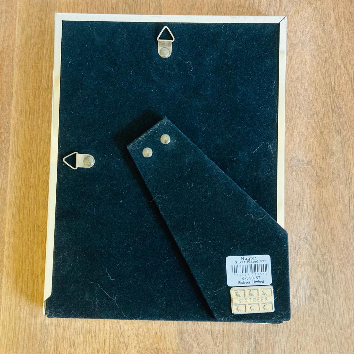 Flowered board three photo album books that measures 8” x 7” when in holder. Two 5 x 7 Silver plated frames.